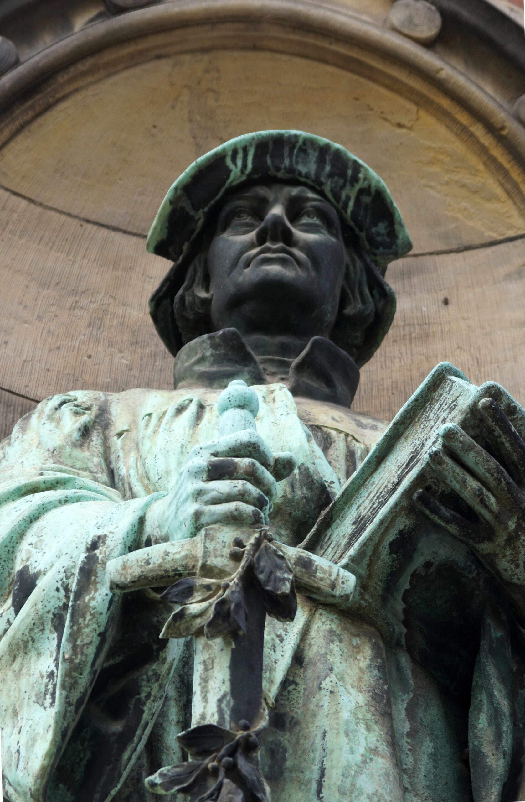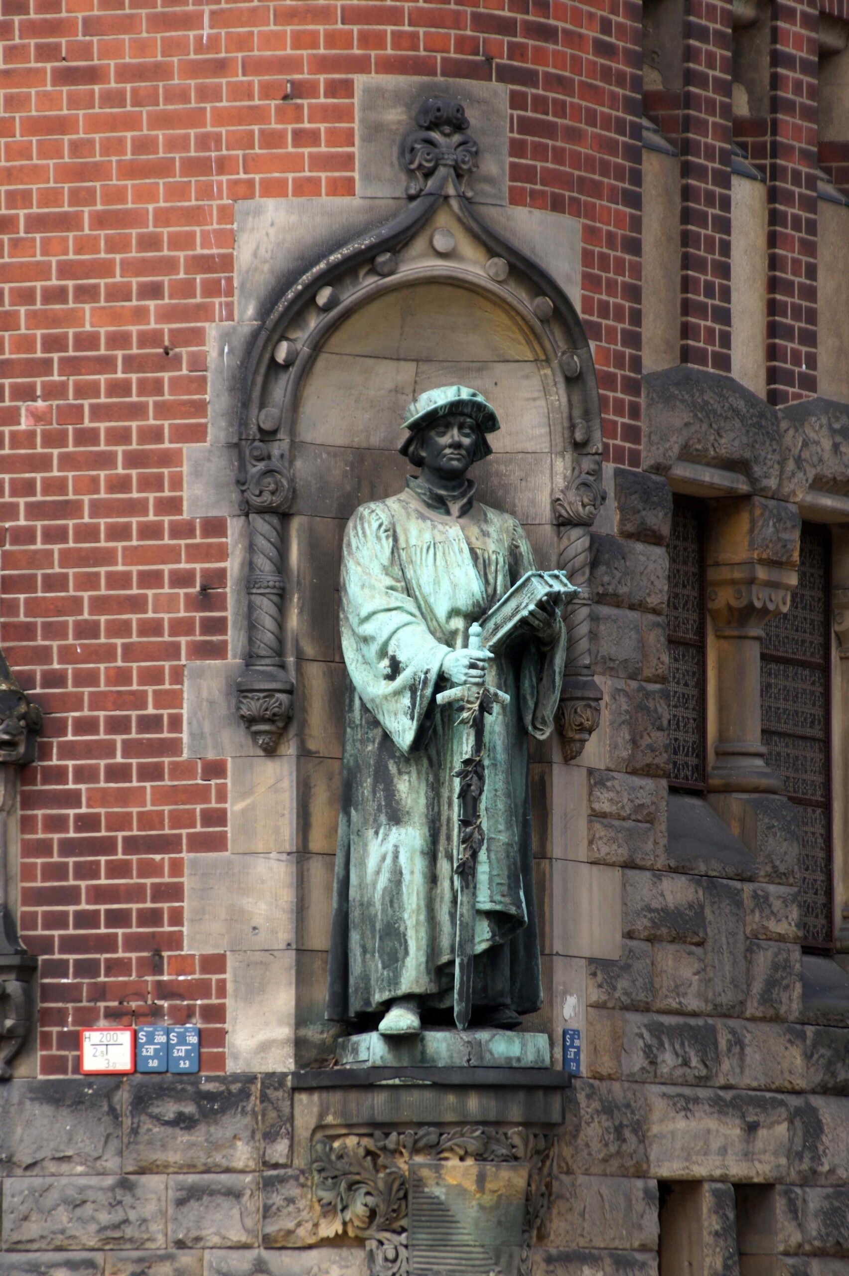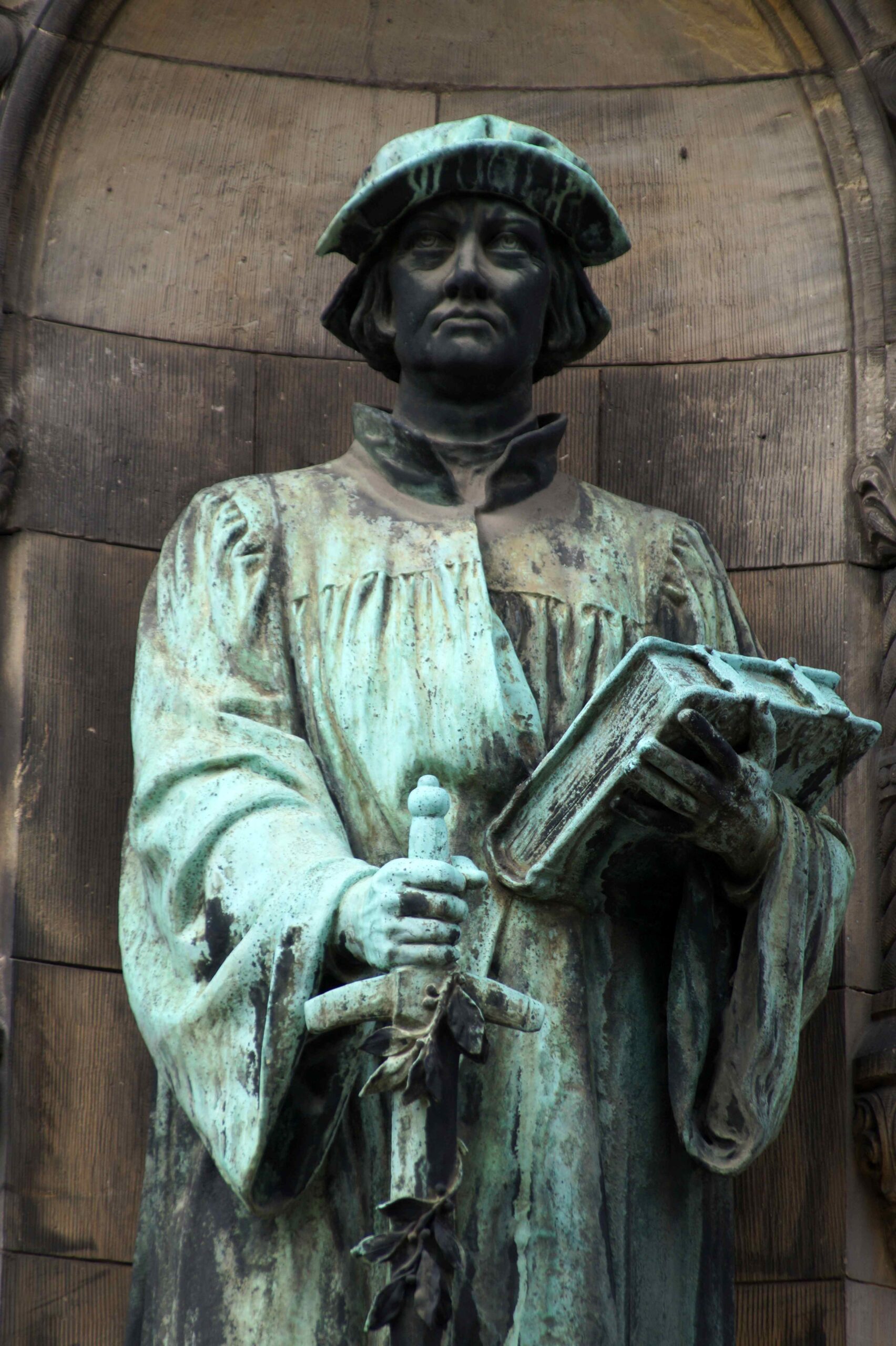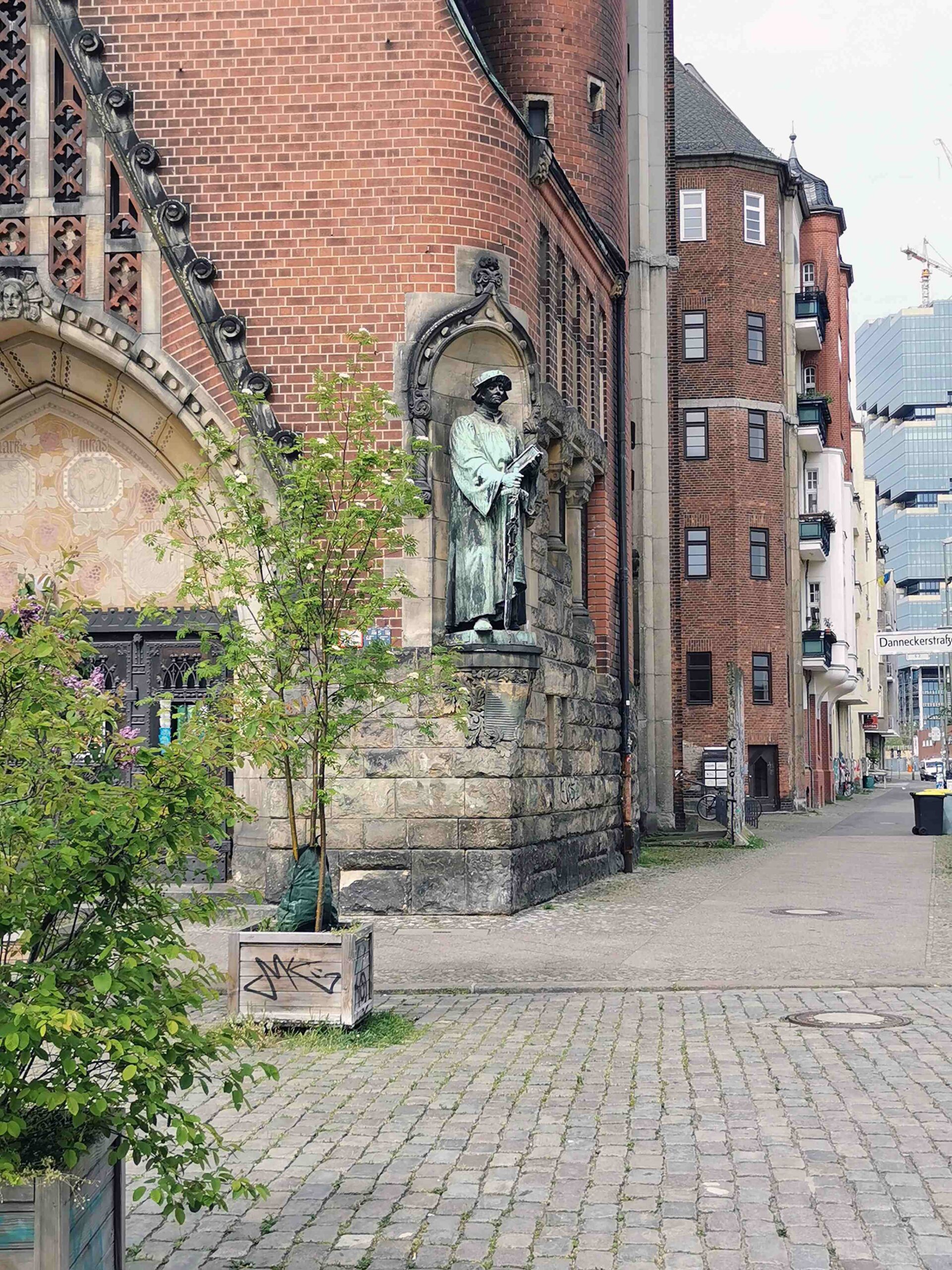 In einer Nische am Fuß des Turmansatzes der Zwinglikirche steht die überlebensgroße Statue des Reformators und Namenspatrons der Kirche Johannes (Huldrych) Zwingli. Zwingli ist bekleidet mit einem langen Talar, mit der rechten Hand stützt er sich auf ein Schwert, im linken Arm hält er eine Bibel (Nicola Vösgen).
