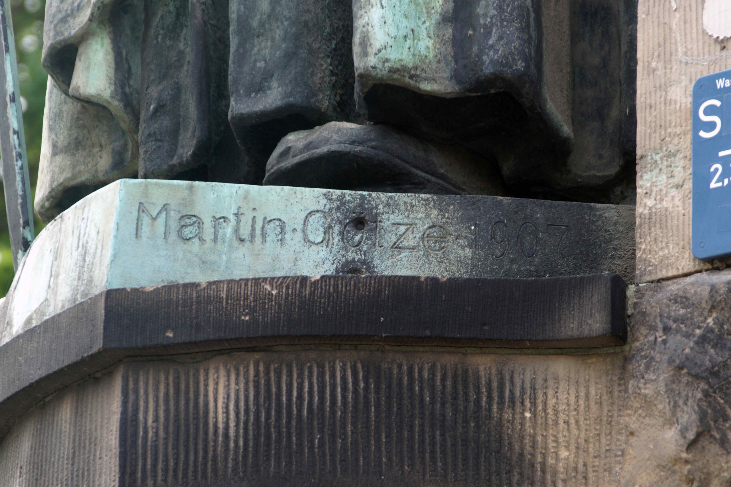 Die Statue wurde laut der Bildhauersignatur am Sockel 1907 von Martin Götze 1907 geschaffen. Eine weitere Plakette benennt für die Ausführung in Bronzeguss die in Berlin-Kreuzberg ansässige Kunst- und Metallgießerei Wilhelm Nürnberg. Eine dritte Plakette verweist auf die Stiftung der Statue durch den Kaufmann und Königlichen Hoflieferanten Albert Tabbert, der Kirchenältester und Mitglied der Baukommission war. Der Bildhauer Götze wurde für die drei Figuren in und an der Zwinglikirche, neben der Zwingli-Statue stammen von ihm auch die Marmorstandbilder Joachims II und Gustav Adolf im Inneren der Kirche, mit dem Kronenorden 4. Klasse ausgezeichnet (Friedenauer Lokal-Anzeiger , 15.1908, Nr. 34, 10.02.1908, o.S.). In der Gipsformerei Berlin hat sich ein 80 cm großer (Vor-?)-Entwurf der Statue erhalten, ein weiterer Gipsabguss befindet sich in der Zentralbibliothek Zürich (Nicola Vösgen).