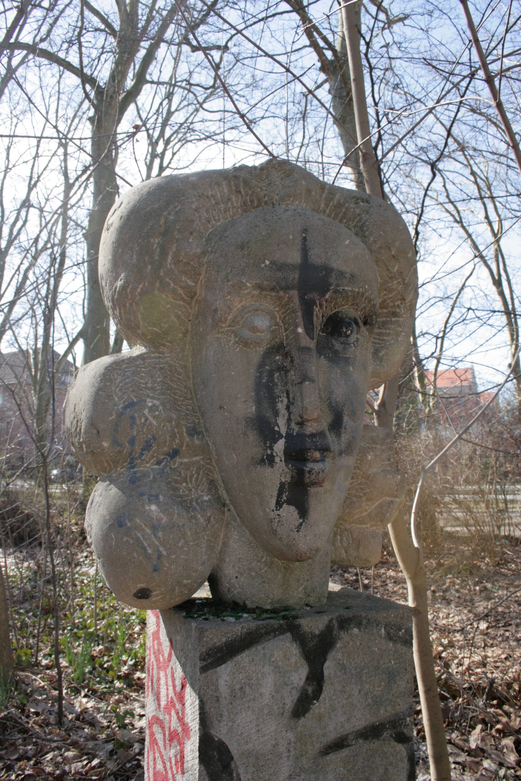 Der Sockel hat einen quadratischen Grundriss. Darauf wurde der stark stilisierte, überlebensgroße Kopf montiert. Es handelt sich um die Darstellung eines jungen Mädchens mit schmalem Gesicht, flachem Profil, kurzer Nase und weit aufgerissenen Augen. Ihre Haare sind zu großförmigen Locken geformt und am Hinterkopf zusammengebunden (Susanne Kähler, Jörg Kuhn).