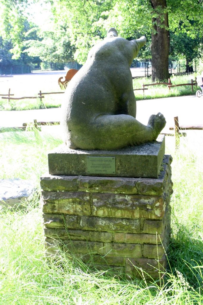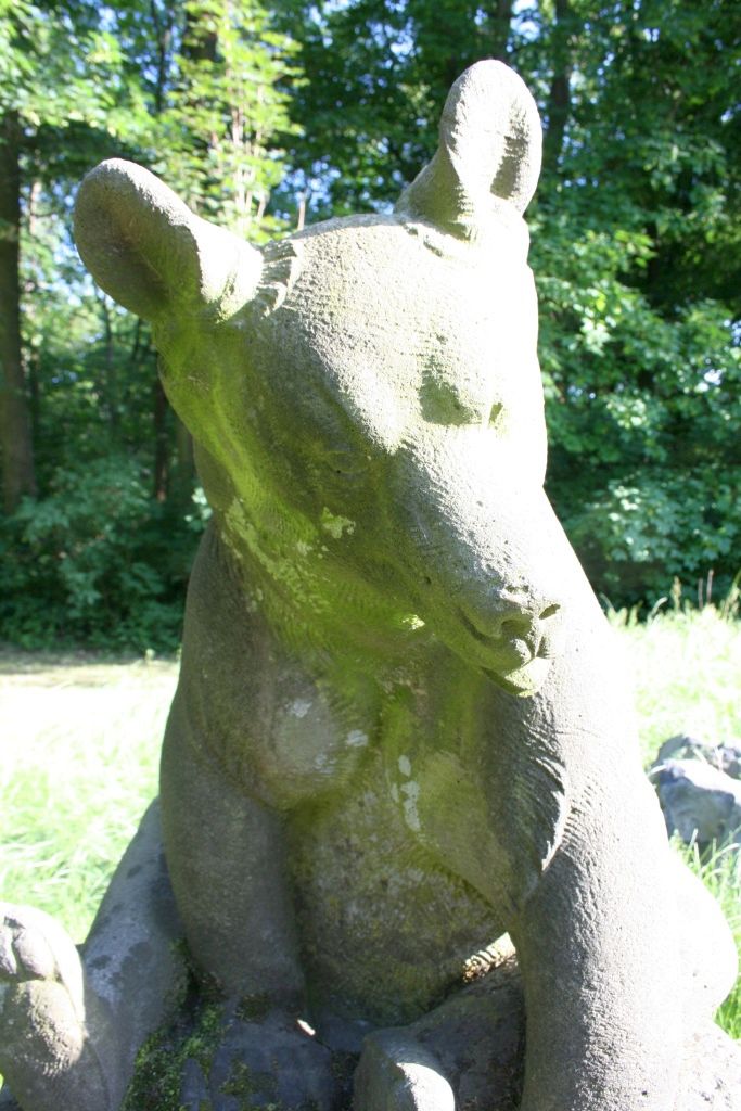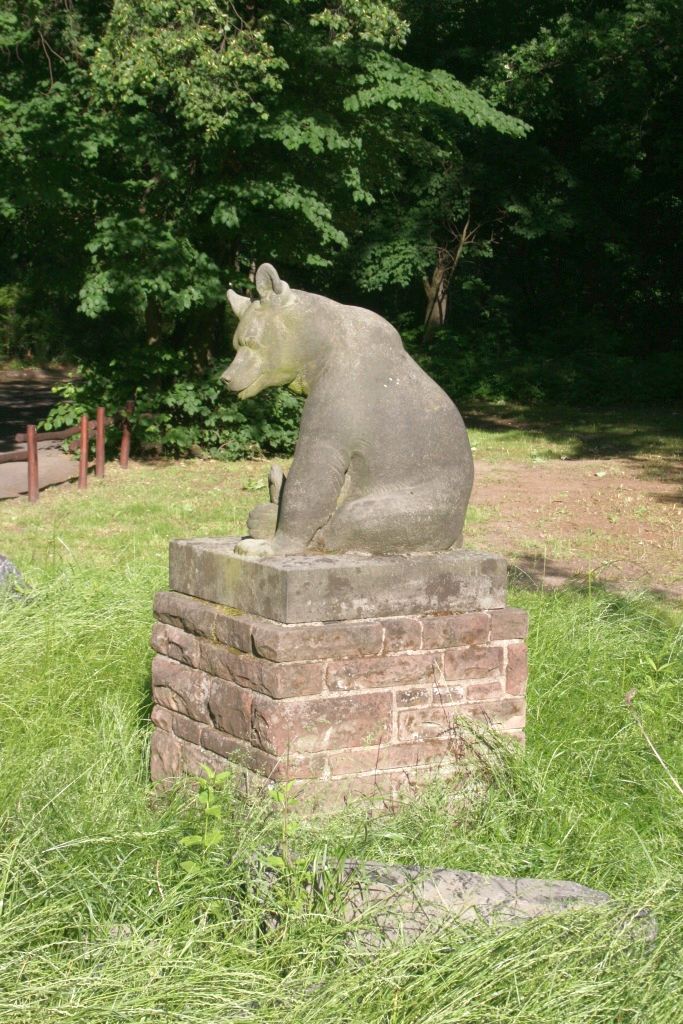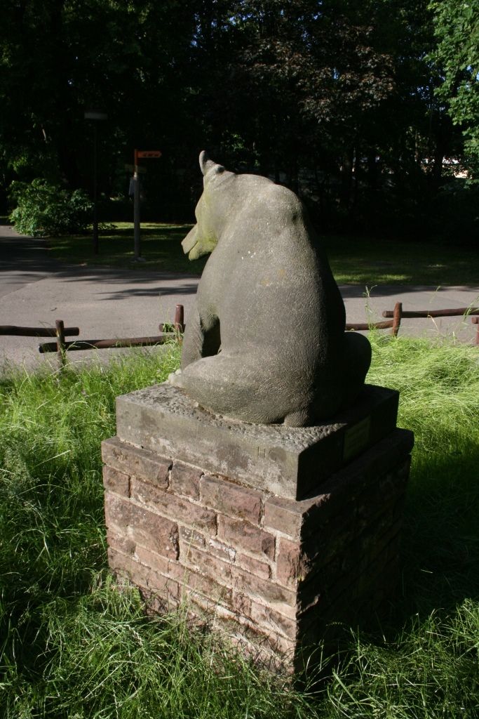 Auf seinen Hinterkeulen sitzender junger Bär mit leicht nach links gewandtem, leicht gesenktem Kopf. Die naturnah formulierte Tierfigur sitzt über quadratischer starker Plinthe, aufgestellt auf einem rechteckigen, gemauerten Sockel.