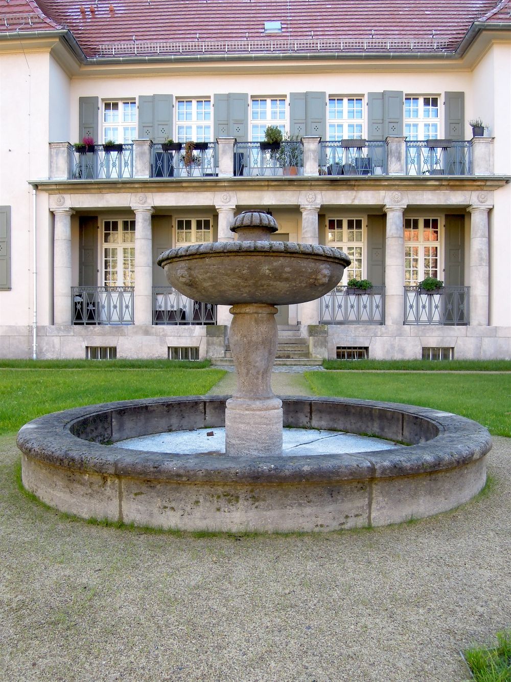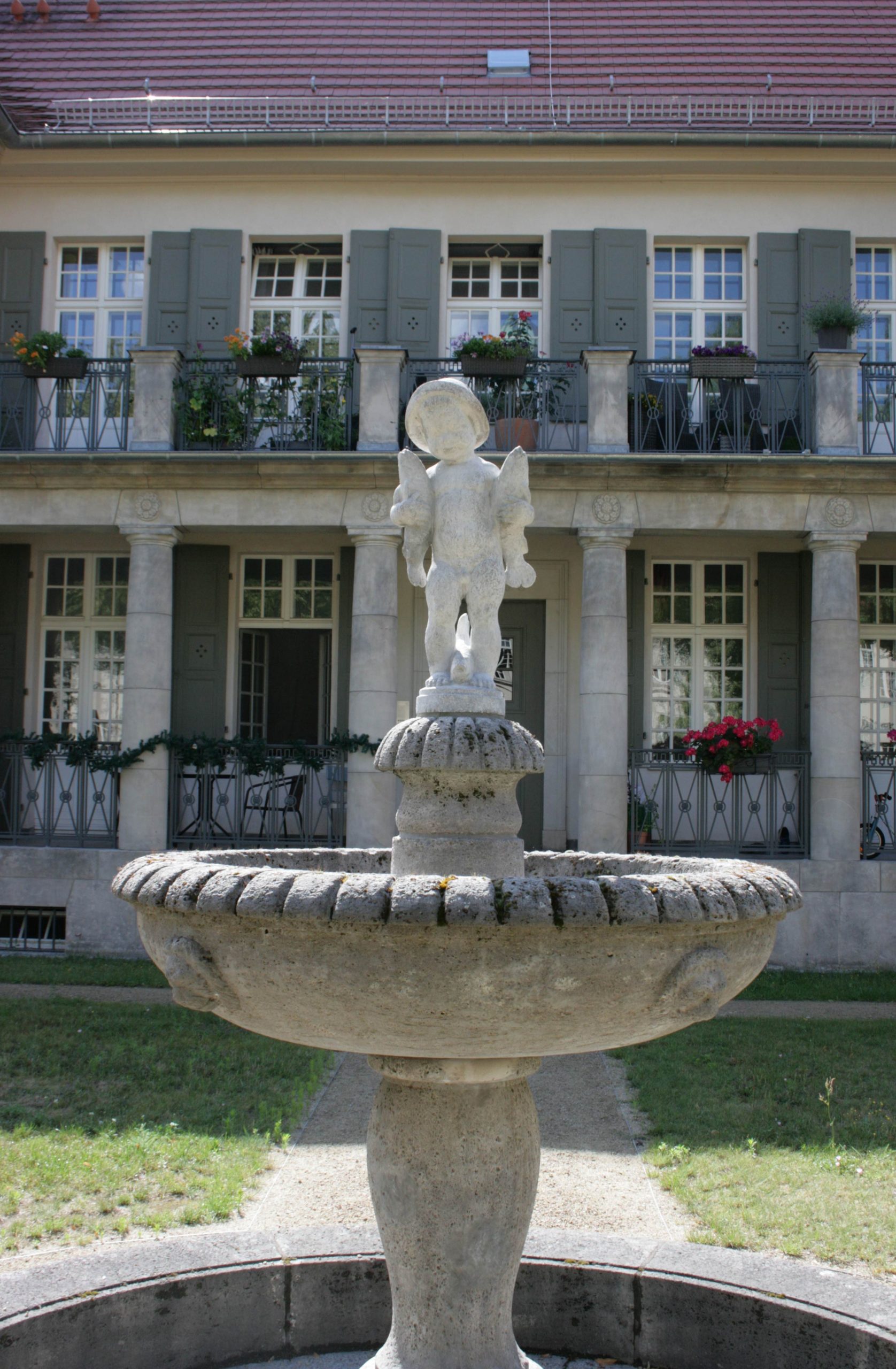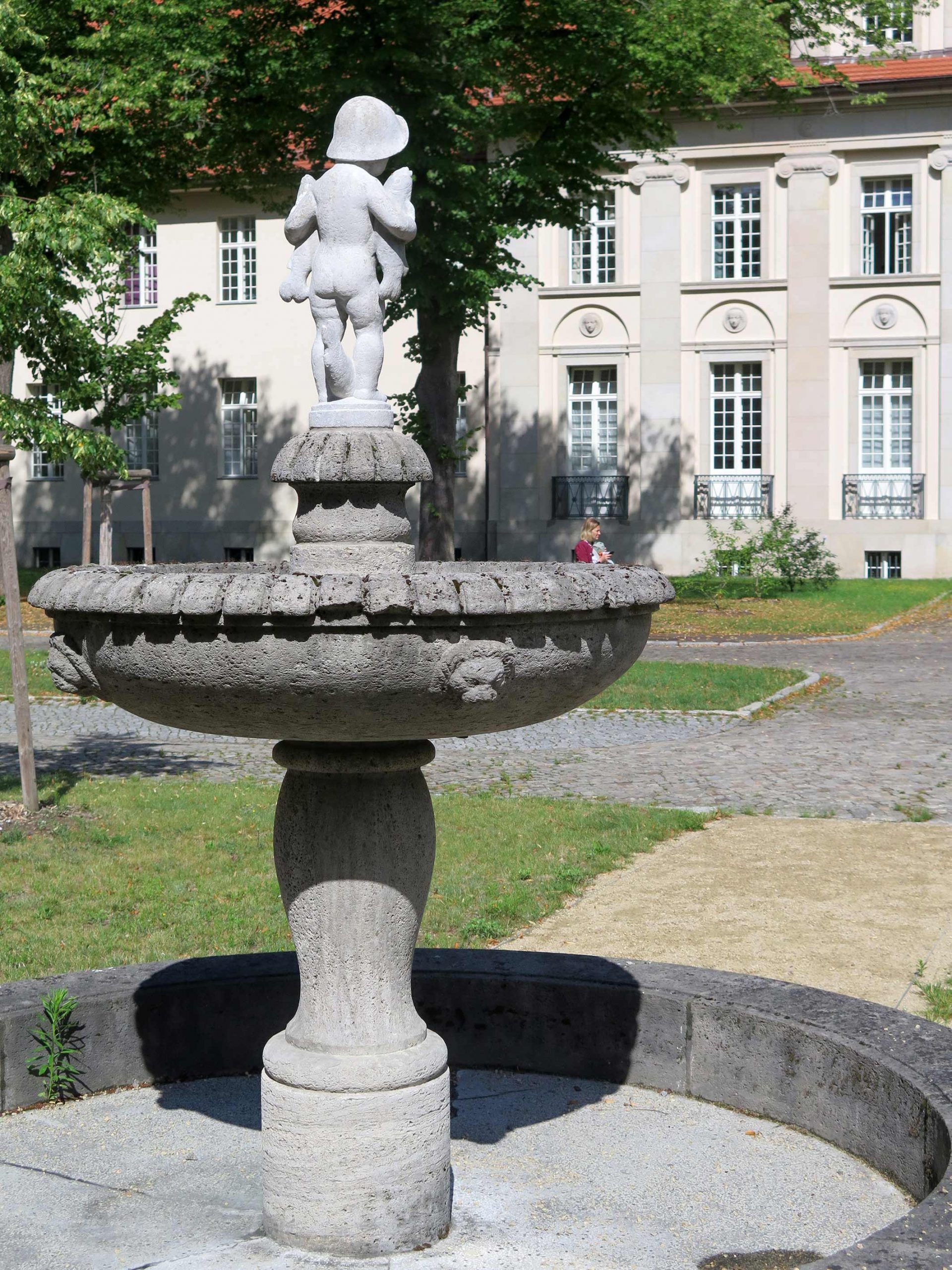 Vor der Gebäudegruppe aus drei Verwaltungs- und Beamtenwohnhäusern kam um 1910 ein runder Schalenbrunnen mit einer Knabenfigur zur Aufstellung. Der vom Bildhauer Ignatius Taschner geschaffene Schmuckbrunnen fand auf dem Grünplatz, zentral vor dem Verwaltungsgebäude (heute Haus 6) seine Aufstellung. Er ist Teil der 1909-1916 nach einem Entwurf von Stadtbaurat Ludwig Hoffmann ausgeführten IV. Städtischen Irrenanstalt (Genesungsheim) in Berlin-Buch, Wiltbergstraße 50/92. Zur Gesamtanlage gehörten bildhauerisch gestaltete Brunnen, mehrere Skulpturen sowie vielfältiger Reliefschmuck an den Gebäuden. Der weiträumige Baukomplex war zunächst als Nervenklinik geplant, diente ab 1919 als Kindergenesungsheim und seit 1941 als Allgemein-Krankenhaus (Die Beschreibung und die Entwicklungsgeschichte folgen z.Teil: Dieter Leukert: Brunnen, Skulpturen und bildhauerischer Schmuck der Gebäude im Ludwig Hoffmann Quartier, 2015/2016 (Manuskript). Die trotz der Nutzungsänderungen weitgehend in ihrer bauzeitlichen Form erhaltene Klinikanlage war in Struktur und Gestaltung auf die ursprünglich geplante Funktion bezogen. Hoffmann schuf einen kompakten und nach außen abgeschlossenen Komplex mit mehr als 30 Bauten, für die er eine ungewöhnliche architektonische Vielfalt fand. 1963 kam es zur Gründung des Klinikums Berlin-Buch mit fünf medizinischen Bereichen. Hier wurde der Medizinische Bereich I eingerichtet. Ab 2012 vollzieht sich die Umwandlung des Areals in eine Wohnanlage mit Bildungs-, Sozial- und Gewerbebauten zum so genannten „Ludwig Hoffmann Quartier“ bei Erhaltung der denkmalgeschützten Gebäude und der Wiederherstellung der gärtnerischen Anlange mit ihrem Skulpturenschmuck. Die Brunnenskulptur Taschners wurde 2009 zerstört; Teile konnten gerettet werden. Im Februar 2017 wurde die Skulptur vom Steinmetz und Restaurator Burkhard Blum unter Verwendung der vorhandenen Bruchstücke wiederhergestellt. Es ist 2018 geplant, sie wieder auf die Mittelsäule zu stellen. Bereits im Mai 2015 hatte der Bildhauer und Steinmetz Lutz Dölle das Brunnenbecken einschließlich Mit-telsäule saniert und gereinigt. Dabei wurde der Terrazzoboden des unteren Brunnenbeckens nicht instandgesetzt. Die Figur „Junge mit Fischen“ ist die Replik in Stein eines Bronzeoriginals auf einer Kugel und wurde als Teil eines Wandbrunnens für das Vestibül des Berliner Stadthauses – Ludwig Hoffmann, 1902/1912) - von Ignatius Taschner gefertigt. Von ihr bestehen weitere Fassungen in Bronze. Neben der für den Wandbrunnen im Berliner Stadthaus (Kopie) befinden sich zwei Güsse in Eichenau bei München im Familienbesitz. Ein weiterer Nachguss wurde 1934 für München angefertigt und steht dort nach einer Umsetzung am Wiener Platz (Jürgen Tomisch).