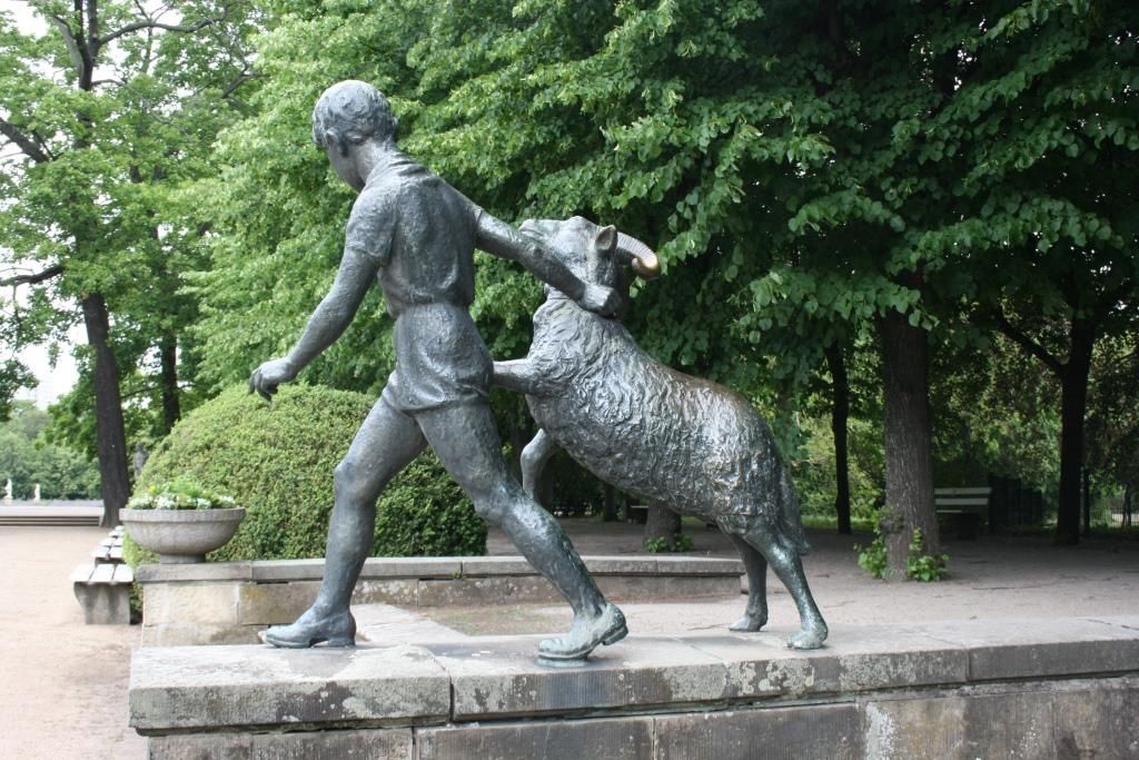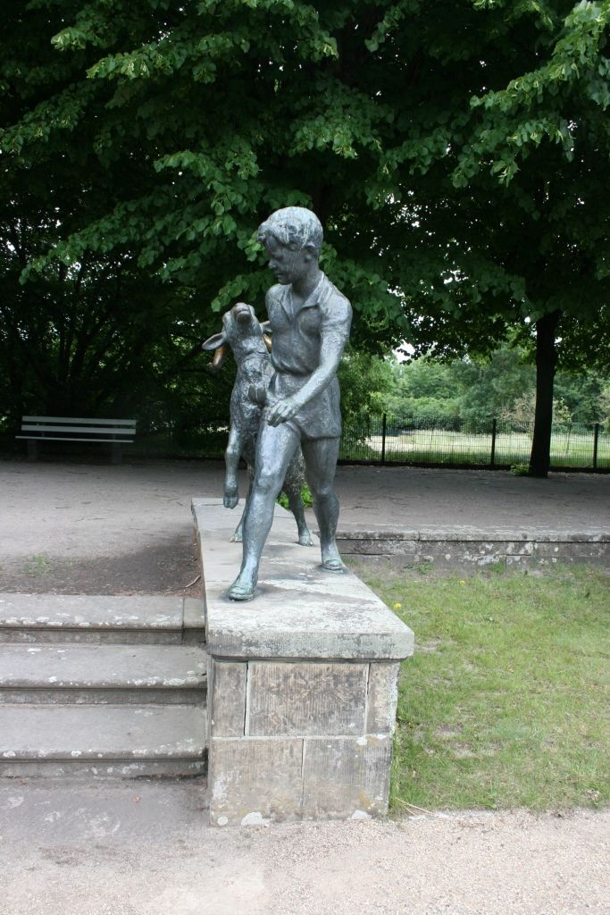 "Aus gleicher Künstlerhand (wie die Figuren von Adam und Eva) stammen die vier Gruppen, die jeweils ein Kind im Kontakt mit einem Tier zeigen, die von 1965-1968 ihre standorte im Südparterre des Schlosses in folgender Reihenfolge - jedes Jahr eine - erhielten: Junge mit Widder, Mädchen mit Schimpansen (das unzählige Besucher zu neckischen Fotoaufnahmen verleitet), Teenager mit Pelikan, Knabe auf Esel. Es werden Kinder in verschiedenen Lebensaltern dargestellt" (Heinrich Dathe, 1980, S. 11-12).