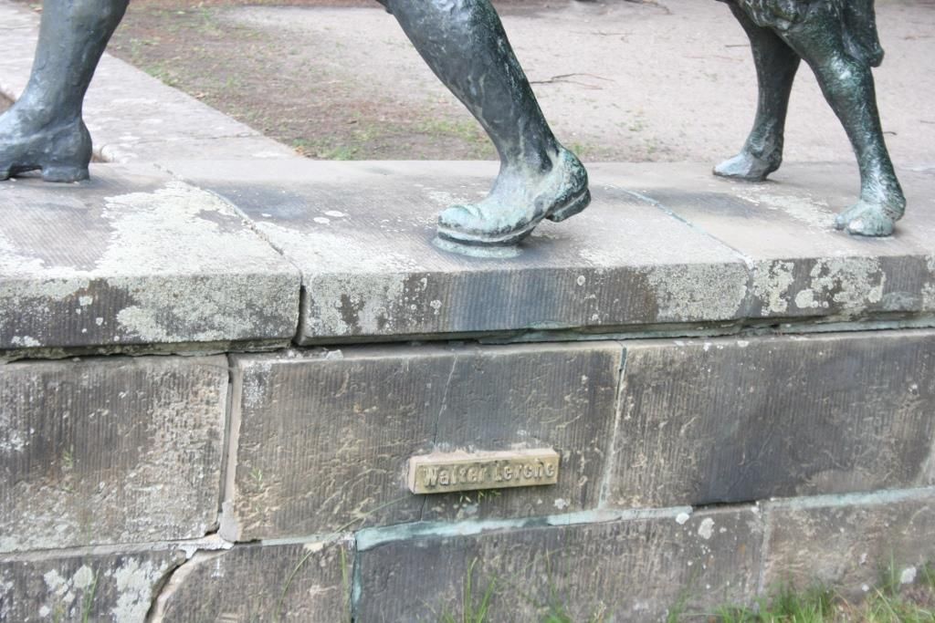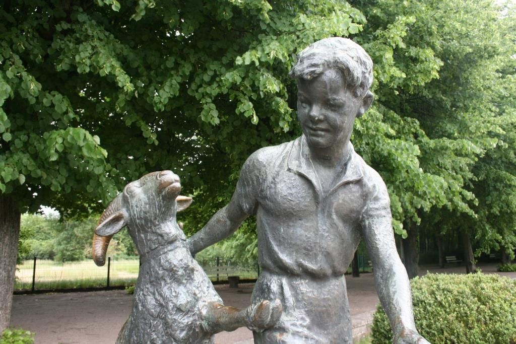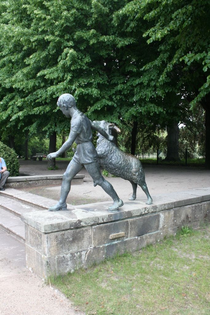 Auf die rechteckige Sandsteinplatte montiert steht die Figur eines Jungen in leichter Schrittstellung. Der Junge ist mit sommerlicher Freizeitbekleidung – kurze Hose, Hemd mit kurzem Arm – und sorgfältig gekämmtem Haar wiedergegeben. Mit seiner rechten Hand greift er nach dem Halsband des Tieres. Der Widder (Ziegenbock), auf seinen Hinterbeinen stehend, den linken Vorderlauf auf Hüfthöhe des Knaben anhebend ausgestreckt, folgt in fast spierlischer Anmutung dem vorauseilenden Jungen (Jörg Kuhn).
