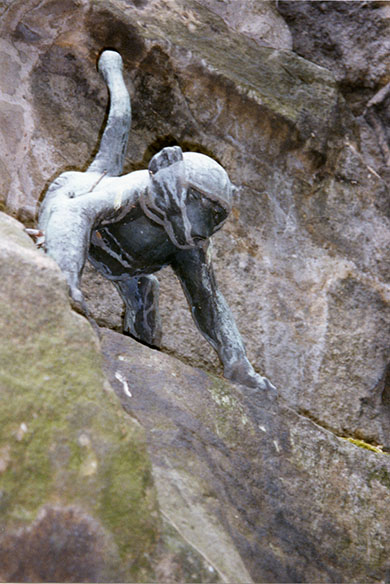 Die beiden identischen Bronzepaviane sind ohne Sockel direkt auf dem unregelmäßigen z. T. abschüssigen Steinuntergrund des Pavianfelsens montiert. Die jungen Tiere stehen – wie zum Sprung bereit – auf ihren vier Pfoten, den Blick das Ziel anpeilend nach unten gerichtet. Die Schwänze, die beim Sprung als Höhenruder dienen sollen, sind steil nach oben gerichtet. Fritz Bernuth hat die Bewegung der Paviane lebensecht wiedergegeben, dabei aber auf Einzelheiten, wie eine exakte Wiedergabe des Fells oder der Gesichtszüge verzichtet (Susanne Kähler).