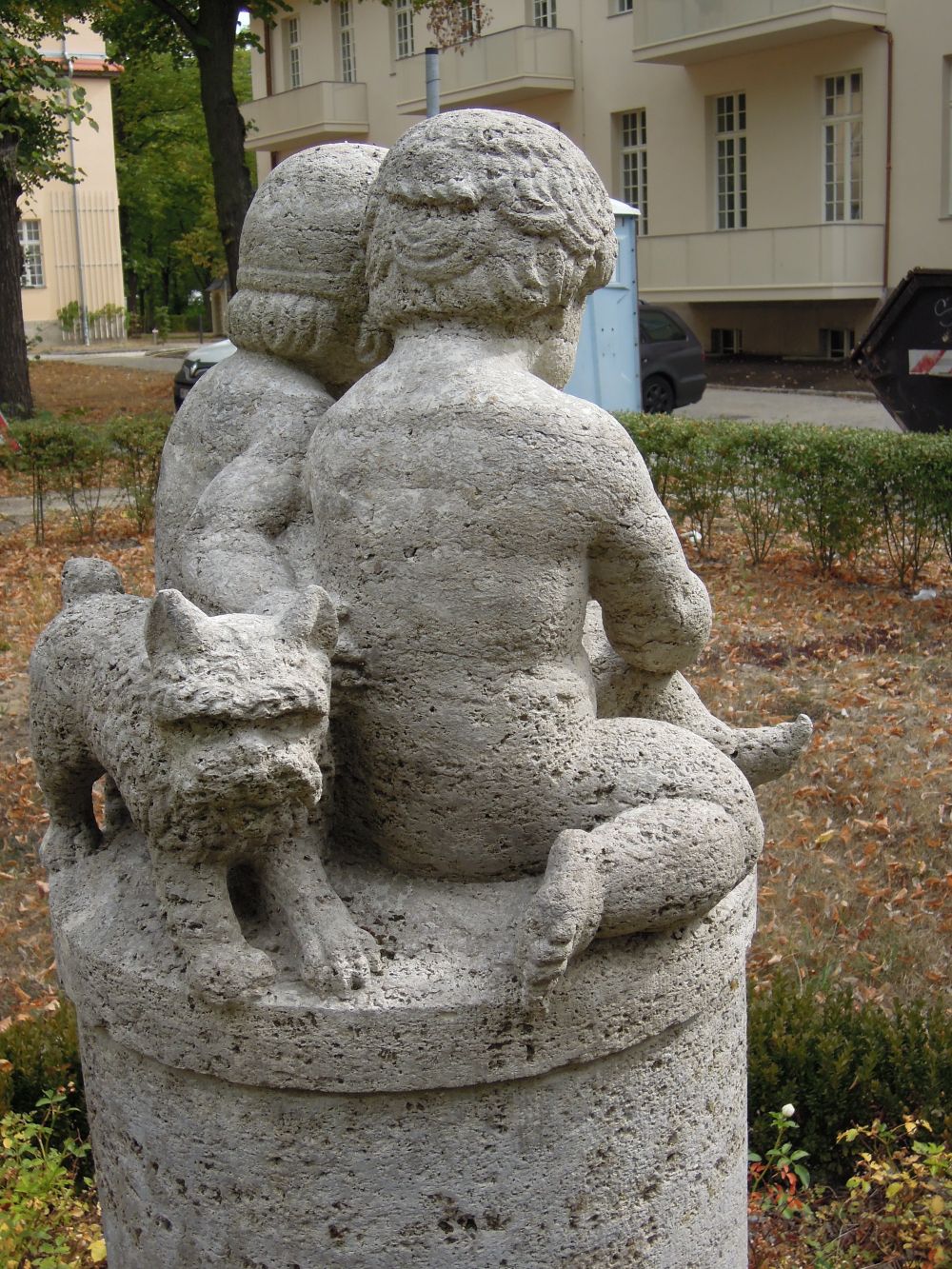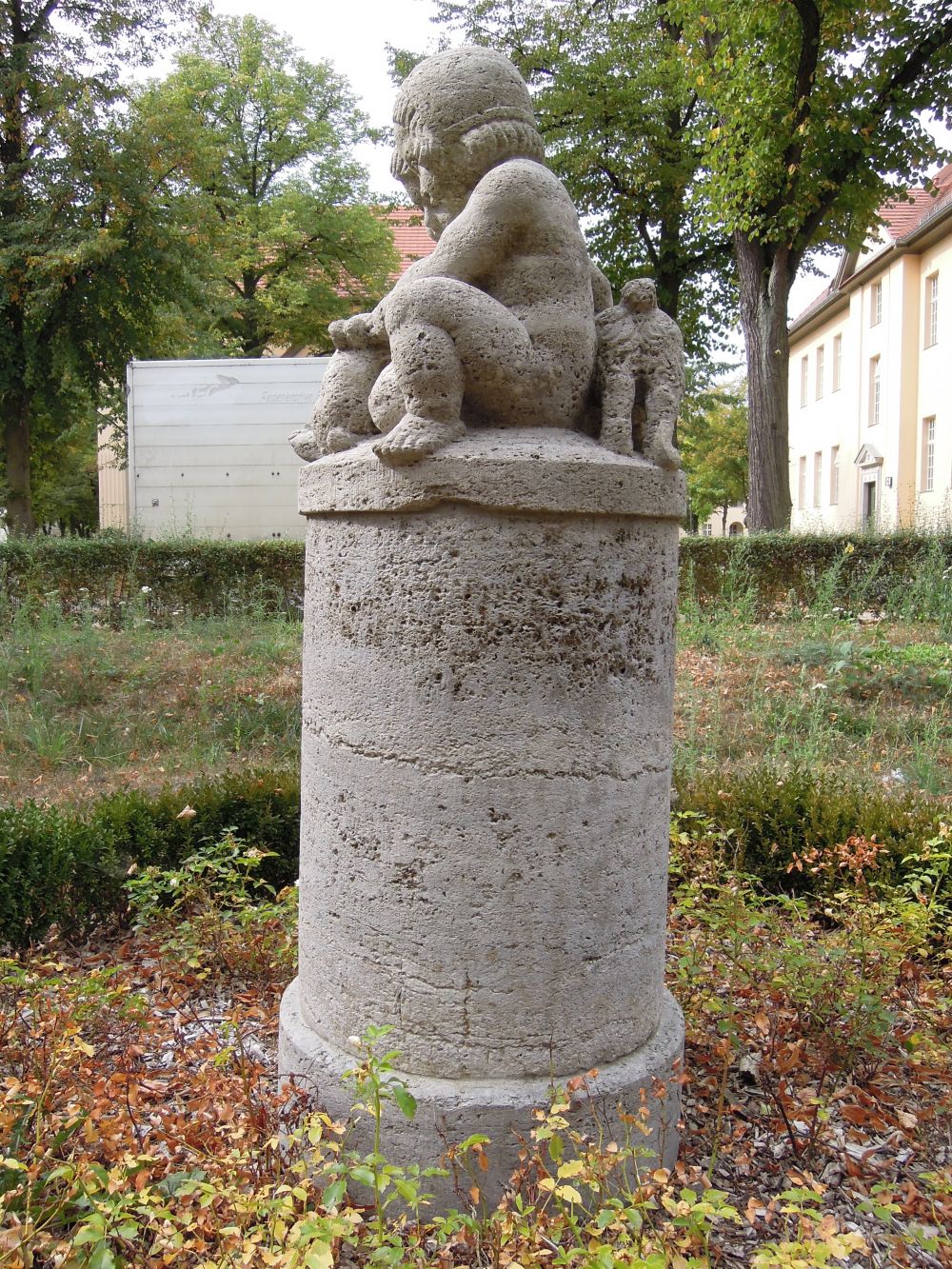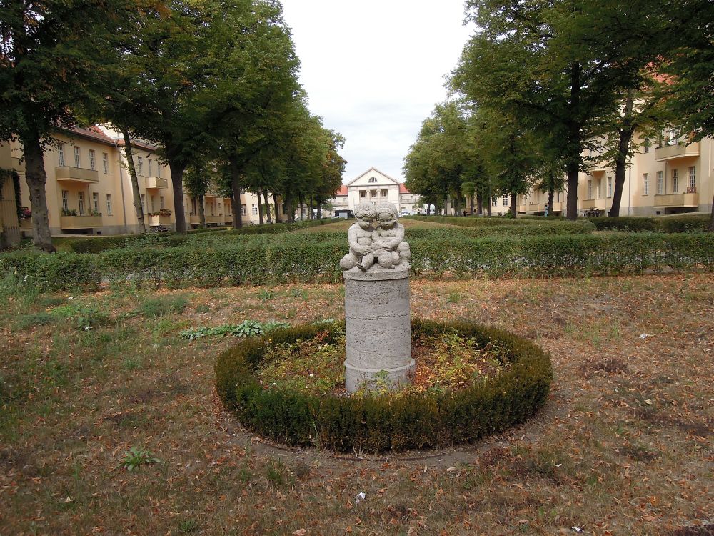 Hinter dem Haus 13 steht im abgesenkten Bereich der Grünfläche als besonderen Schmuck eine Muschelkalksteinsäule mit einer Figurengruppe. Sie zeigt einen Jungen und ein Mädchen einen Hasen streichelnd und einem Hund rückwärtig sitzend (Jürgen Tomisch).