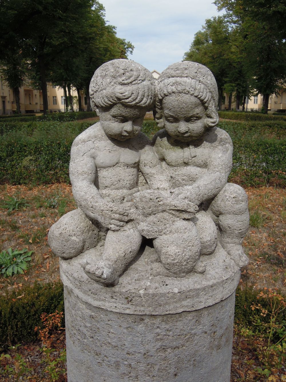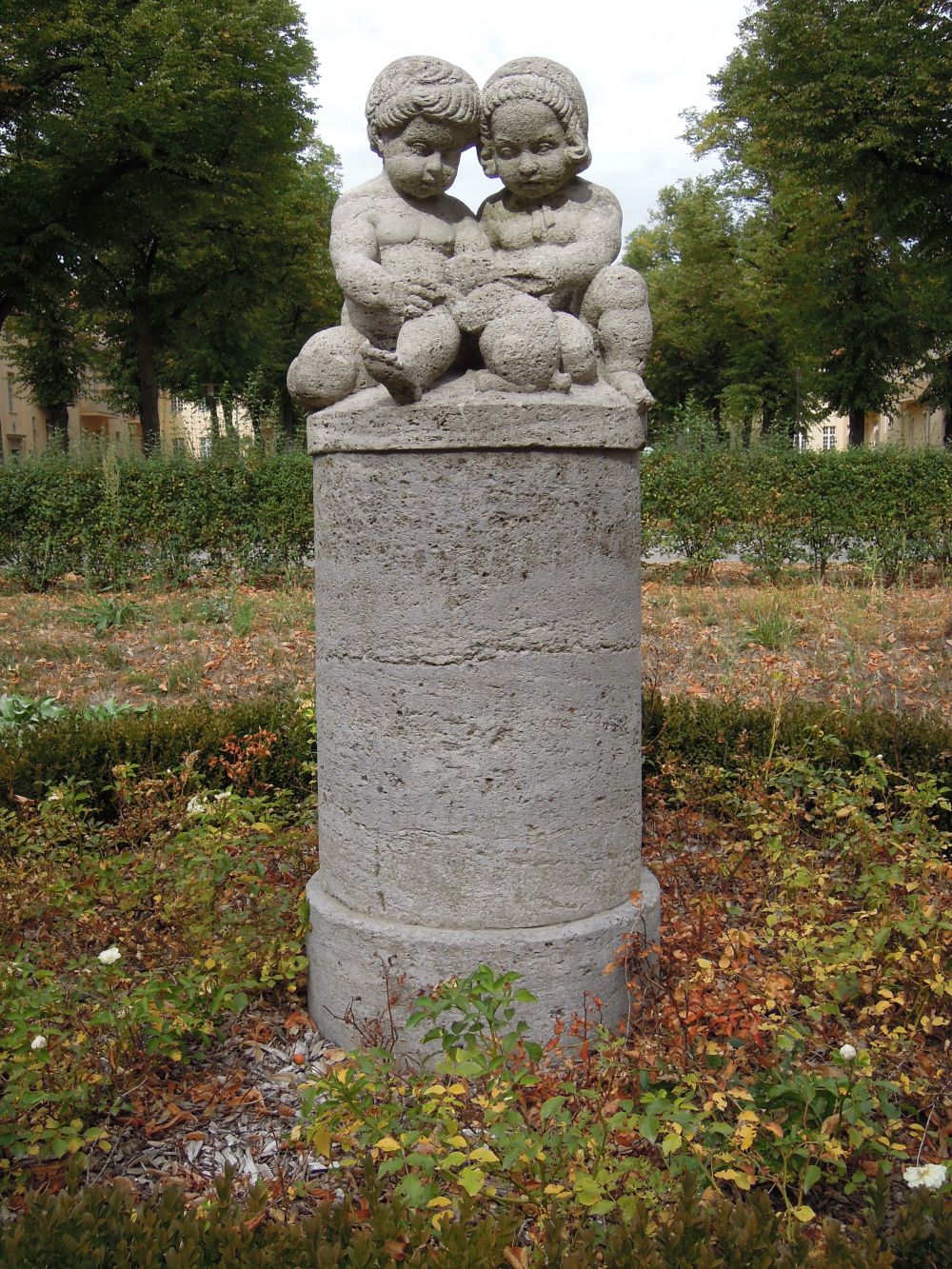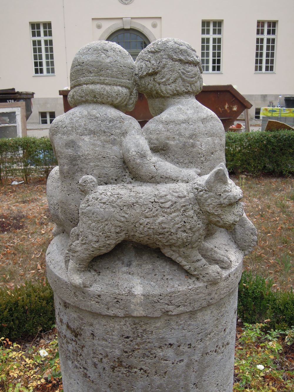 Hinter dem Haus 13 steht im abgesenkten Bereich der Grünfläche als besonderen Schmuck eine Muschelkalksteinsäule mit einer Figurengruppe. Sie zeigt einen Jungen und ein Mädchen einen Hasen streichelnd und einem Hund rückwärtig sitzend (Jürgen Tomisch).