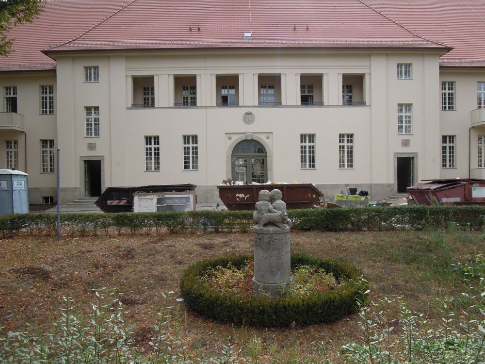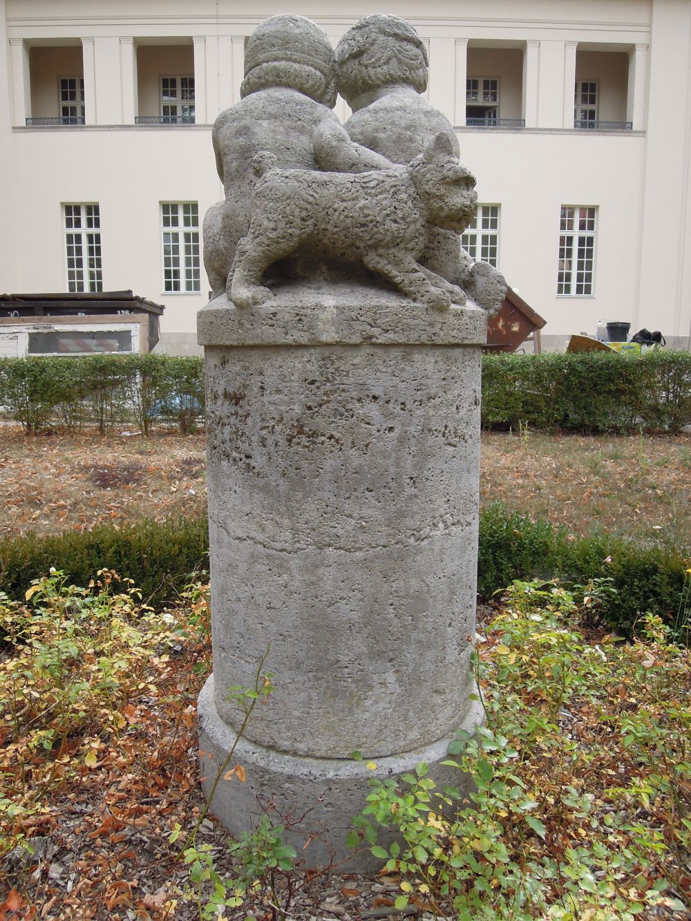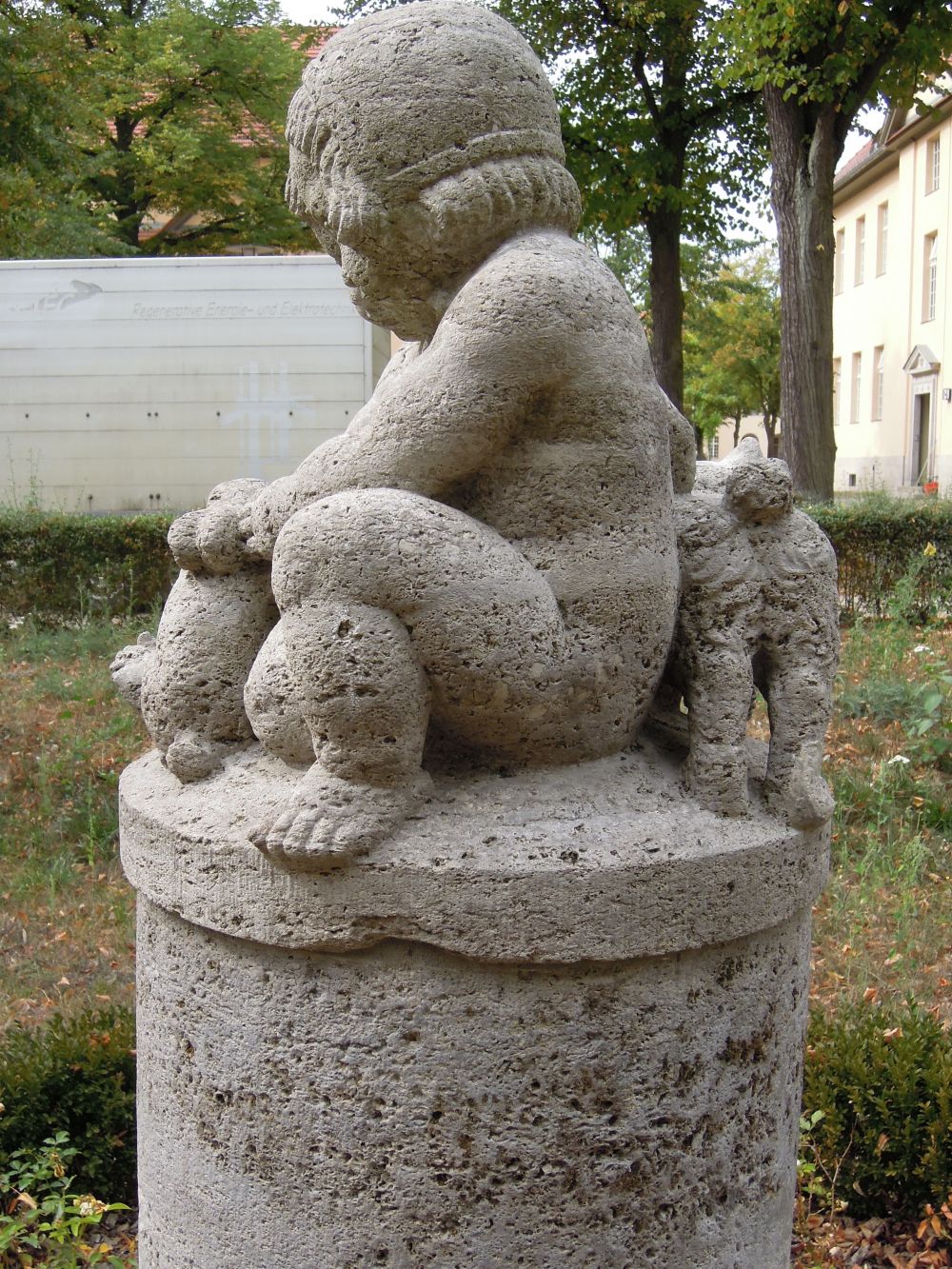 Die Figurengruppe hatte Ignatius Taschner ursprünglich für den von Ludwig Hoffmann entworfenen Schulkomplex Zeppelinplatz, Lütticher Straße (1907/1909) geschaffen. Sie wurde als Replik für das Genesungsheim übernommen. Bauzeitlich stand die Säule in einem Rundbeet, dessen Bepflanzung auch an der Säule emporwuchs. Säule und Skulptur wurden im Rahmen der Instandsetzung und des Umbaus des Areals für das Ludwig Hoffmann Quartier gereinigt. Die frei stehende Skulptur ist Teil der 1909-1916 nach einem Entwurf von Stadtbaurat Ludwig Hoffmann ausgeführten IV. Städtischen Irrenanstalt (Genesungsheim) in Berlin-Buch, Wiltbergstraße 50/92. Zur Gesamtanlage gehörten bildhauerisch gestaltete Brunnen, mehrere Skulpturen sowie vielfältiger Reliefschmuck an den Gebäuden. Der weiträumige Baukomplex war zunächst als Nervenklinik geplant, diente ab 1919 als Kindergenesungsheim und seit 1941 als Allgemein-Krankenhaus. Die trotz der Nutzungsänderungen weitgehend in ihrer bauzeitlichen Form erhaltene Klinikanlage war in Struktur und Gestaltung auf die ursprünglich geplante Funktion bezogen. Hoffmann schuf einen kompakten und nach außen abgeschlossenen Komplex mit mehr als 30 Bauten, für die er eine ungewöhnliche architektonische Vielfalt fand. 1963 kam es zur Gründung des Klinikums Berlin-Buch mit fünf medizinischen Bereichen. Hier wurde der Medizinische Bereich I eingerichtet. Ab 2012 vollzieht sich die Umwandlung des Areals in eine Wohnanlage mit Bildungs-, Sozial- und Gewerbebauten zum so genannten „Ludwig Hoffmann Quartier“ bei Erhaltung der denkmalgeschützten Gebäuden und der Wiederherstellung der gärtnerischen Anlangen mit ihrem Skulpturenschmuck (vgl. Klinikum Berlin Buch Medizinischer Bereich I, Wiltbergstraße 50, Gartendenkmalpflegerisches Gutachten des MB I. Büro Dr. Jacobs und Hübinger, August 1993, Abb. 58, 142; Ludwig Hoffmann´s Genesungsheim in Berlin-Buch. Klinikum Buch-Medizinischer Bereich I, Gutachten angefertigt v. D. Leukert 1993/1994; Dieter Leukert Dieter Leukert, Brunnen, Skulpturen und bildhauerischer Schmuck der Gebäude im Ludwig Hoffmann Quartier, 2015/2016 (Manuskript), S. 43-45, bes. Abb. S. 44; Hoffmann, Ludwig, Das Genesungsheim in Buch = Wasmuths Monatshefte für Baukunst 6 (1922), S. 332-333) (Jürgen Tomisch).