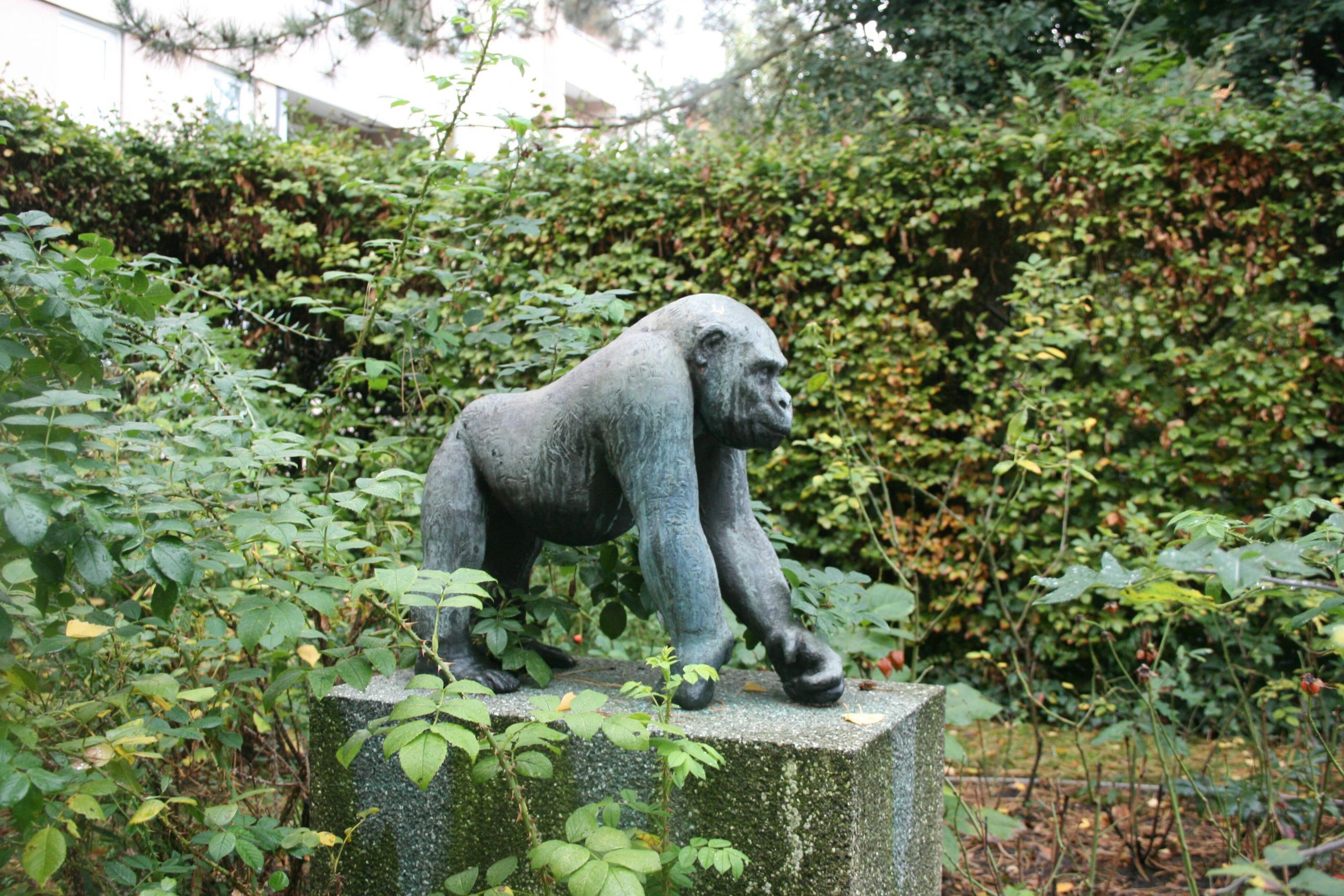 Auf einem rechteckigen im unteren Bereich eingezogenen Kunststeinsockel in einem Rosenbeet im Blockinnenbereich der Appartmentwohnanlage der AWO steht die naturalistische gestaltete Figur eines jungen, auf allen Vieren schreitenden Gorilla, die linke Vorderhand ist vorgesetzt. Der Naturalismus der Figur wird dadurch unterstrichen, dass sie ohne Plinthe gestaltet worden ist.