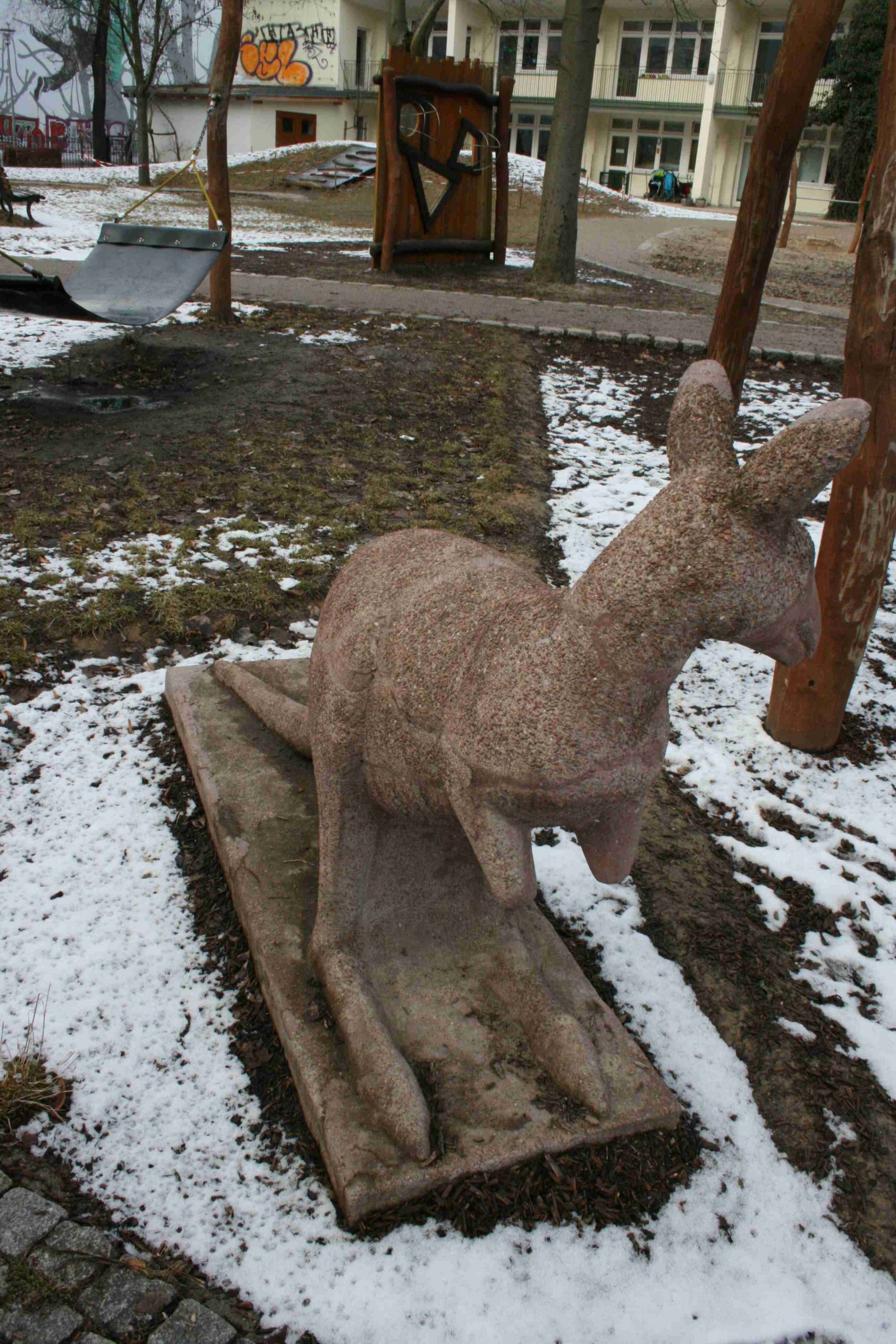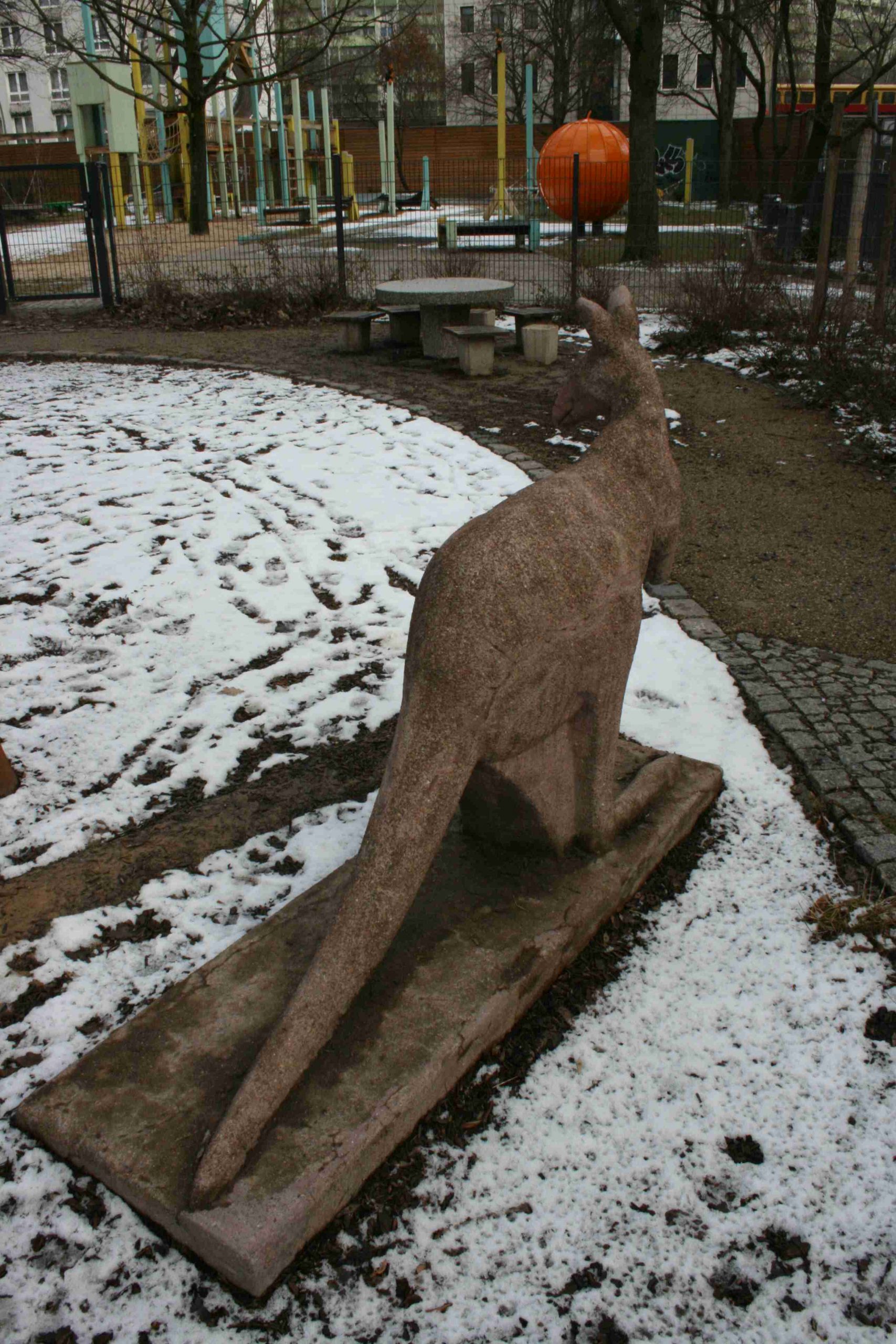 Auf einer rechteckigen Plinthe steht das grundsätzlich realisisch dargestellte, etwas stilisierte leicht unterlebensgroße Känguru (alte Rechtschreibung: Kängeruh) mit parallel aufgestellten Füßen, den Kopf nach links gewendet. Das Material ist ein hellrot gefärbter grobkörniger Kunststein (Susanne Kähler).