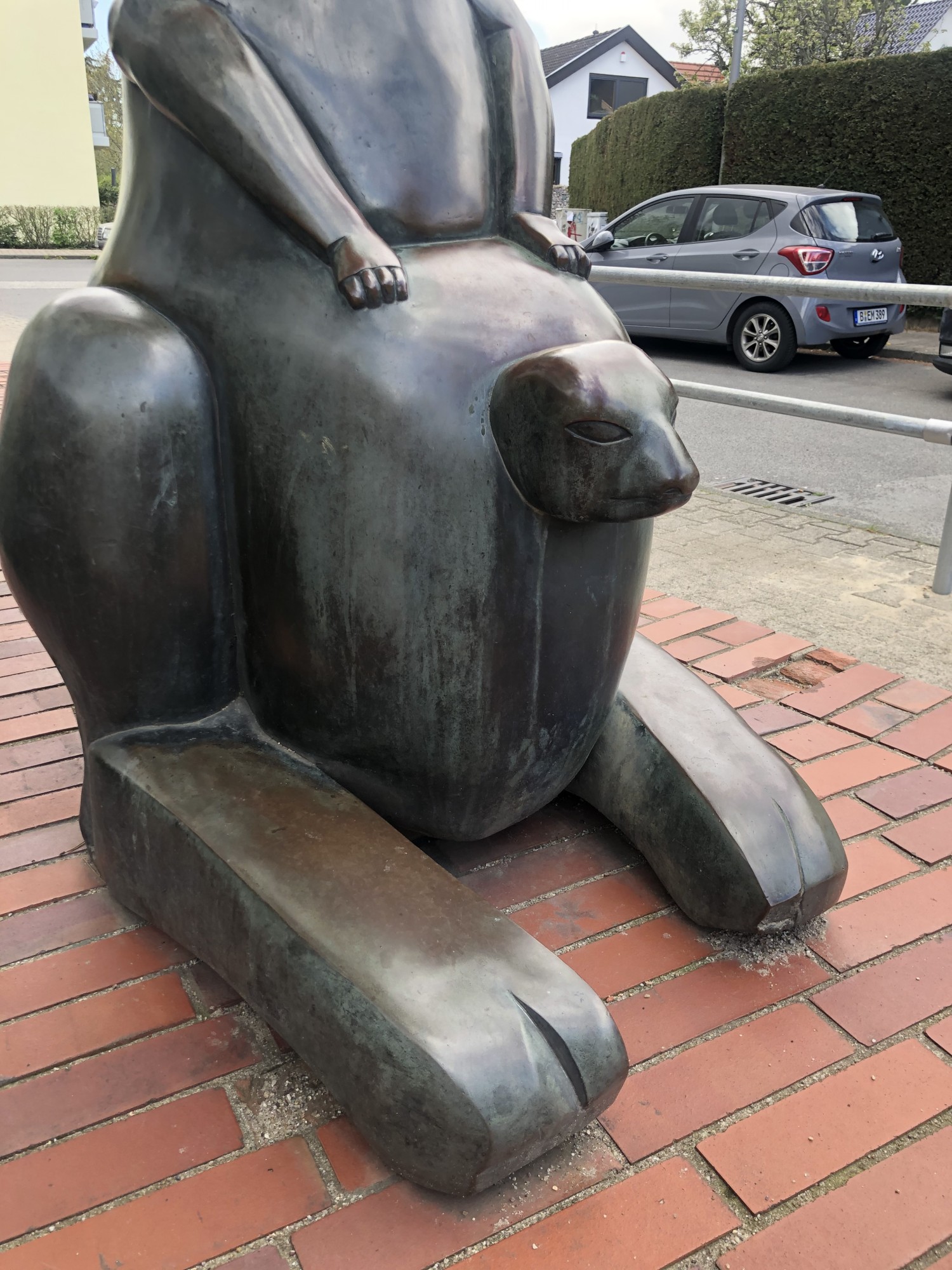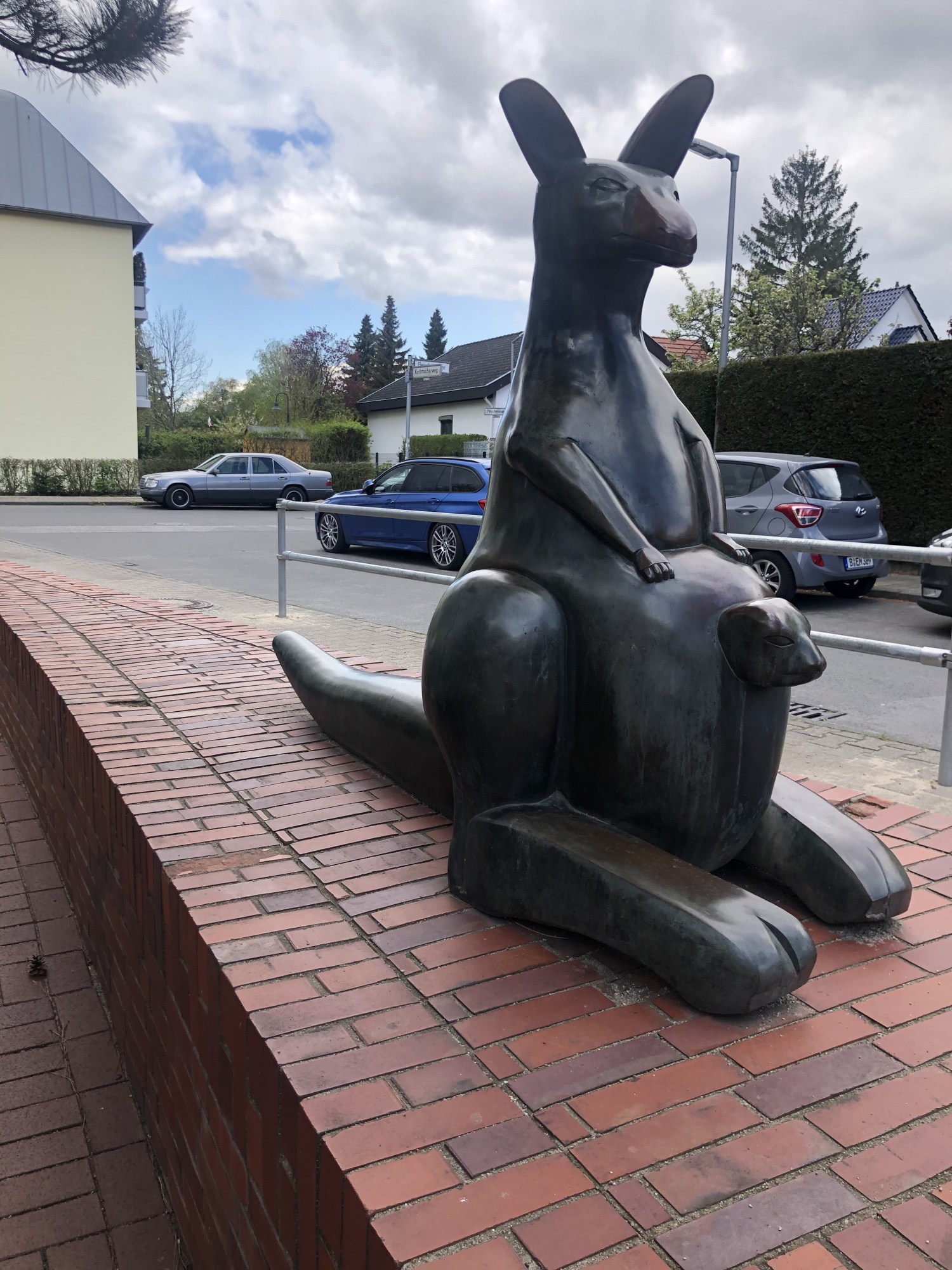 Die Bronzeplastik stellt ein sitzendes und ruhendes Känguru dar, dessen Blick nach vorne gerichtet ist und dessen Schwanz gerade nach hinten ausgestreckt liegt. Seine Arme liegen auf dem Bauch, aus dessen Beutel der Kopf eines Kägurujungen herausragt. Die alleinstehende Tierfigur ist direkt auf einer Backsteinmauer vor dem Kindergarten aufgestellt und von allen Seiten zu betrachten. Sie hat eine glatt gearbeitete Oberfläche (Nina Schmidt, Pauline Ahrens).