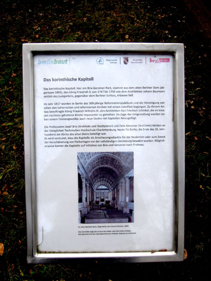 Das Säulenrelikt befindet sich auf den begrünten Mittelstreifen des Edelhofdamms, dem östlichen Ende des Joseph Brix-Felix Genzmer Parks. Das Relikt einer Säule aus dem Innern des 1893 abgerissenen Berliner Doms im Lustgarten Berlin-Mitte ist der nicht mehr zur Gänze erhaltene korinthische Säulenkopf. Er ist auf einer quadratischen, niedrigen Kunststeinbodenplatte gelagert, wie schwebend auf Betonsteinen aufgestelzt. Die steinerne Bodenplatte mit Scharrierung entspricht wohl der originalen Platte des um 1912 im damaligen Erholungspark (heute Ludwig-Lesser-Park) platzierten Kapitells. Das Fragment besteht aus den zwei Teilen des Kapitellkörpers: dem oberen quadratischen Körper mit der vierkantigen, konkav eingezogenen Deckplatte (Abakus) und dem unteren runden Säulenhaupt. Beide Teile sind aus Sandstein modelliert. Die einst reiche Dekoration weist zahlreiche Fehlstellen auf: Von den vier Eckvoluten sind Teile abgebrochen, einige Abakus- Blüten fehlen und die stilisierten Akanthusblätter haben einige ihrer nach vorne überfallenen Spitzen verloren. Auf der Oberseite des Abakus befinden sich Einritzungen mit Steinmetzzeichen. Beim Kapitell ist eine Hinweistafel auf einem Baumstumpf aufgestellt, die über die Herkunft der Bauskulptur informiert (Jürgen Tomisch, Barbara Anna Lutz).