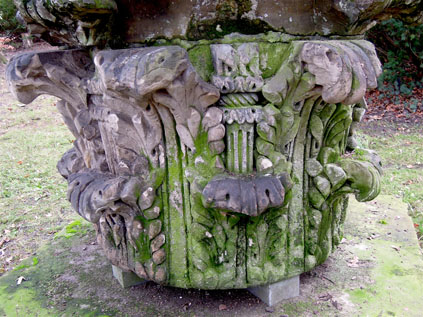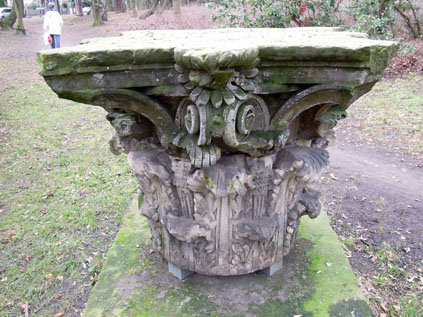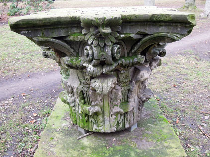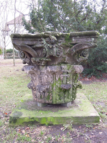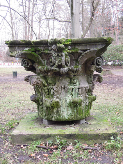 Das Architekturstück kam zusammen mit einem weiteren Kapitell um 1912 nach der gerade eröffneten Gartenstadt Frohnau als repräsentativer Schmuck der Gartenanlagen. Sie stammen aus dem evangelischen Berliner Dombau am Lustgarten, der 1893-94 für den von Julius Raschdorff entworfenen neuen Dom weichen musste. Der zweite Berliner Dom entstand 1747-50 nach Plänen von Georg Wenzeslaus von Knobelsdorff und Friedrich II. durch Johann Boumann d. Ä. in barocken Formen. Die Saalkirche hatte im Innern entlang der Längsseiten bei den Emporen 24 korinthische Säulen auf Postamenten, davon waren einige gekuppelt. Anfang des 19. Jahrhunderts nahm Karl Friedrich Schinkel unter Wahrung der barocken Bausubstanz eine Neugestaltung im Sinne des Klassizismus vor, im Innenraum in den Jahren 1816-1817, am äußeren Erscheinungsbild 1820-1822. Schinkel veränderte das Innere des Doms umfassend. Er begradigte die umlaufenden Emporenbrüstungen zwischen den Säulen und vereinzelte die gekuppelten Säulen derart, dass nun 24 Säulen mit korinthischen Kapitellen alle Seiten des Kirchenschiffes in Emporenhöhe umgaben. Dort, „wo es notwendig war, wurden neue Säulen gemauert“. Anschließend bekamen die Säulen einen “marmorartigen Lackfirnis“ (Rave, 1941, S.25 f.). Sie trugen anstelle der ursprünglich schlichten Flachdecke ein halbrundes kassettiertes, hölzernes Tonnengewölbe über dem Mittelschiff. 1893 wurden vermutlich auf Intiative von Julius Raschdorff, seit 1878 Professor für Baukunst an der Technischen Hochschule Charlottenburg, aus dem abgebrochenen Dom mehrere historische Bauelemente geborgen, die in die Sammlung der Architekturabteilung der neuen Technischen Hochschule kamen. Sie dienten wohl als Anschauungsmodelle für die Studierenden. Darunter befanden sich mehrere der großen korinthischen Kapitelle der Säulen des ursprünglichen Baus von 1747-1750, die vermutlich beim Umbau durch Schinkel wiederverwendet wurden. Zwei der Säulenfragmente kamen um 1912 nach der Gartenstadt Frohnau, wo sie sich noch heute befinden. Sie schmückten Plätze der vom Gartendirektor Ludwig Lesser gestalteten Gartenanlagen. Ein Kapitell befand sich auf dem Platz V am Ende der Wiltinger Straße, wo seit 1922 das Kriegerdenkmal steht. Das zweite Kapitell schmückte wohl den Erholungs- park, dem heutigen Ludwig-Lesser-Park. Während eines der Relikte noch heute sich im Ludwig-Lesser-Park befindet, wurde das andere später nach der Mittelpromenade des Edelhofdamms, heute Joseph Brix-Felix Genzmer Park, versetzt. Weitere Spolien des alten Berliner Doms befinden sich im öffentlichen Berliner Raum. Im Gartenhof der Technischen Universität steht hinter dem Hauptgebäude eine der zwei ionischen Säulen, die von Schinkel im Portikus verbaut wurden. Von 1974 bis 2012 befanden sich im Schloßpark Charlottenburg am Schinkelpavillon zwei weitere korinthische Säulenkapitelle aus dem Innern des abgebrochenen Doms, die den Frohnauer Stücken gleichen. Sie sind heute auf der Nordseite des Berliner Doms auf einer Bodenplatte aufgestellt. Als Überrest des 1893-94 abgebrochenen zweiten evangelischen Berliner Doms kommt dem Säulenfragment eine besondere berlin- und baugeschichtliche Bedeutung zu. Das korinthische Kapitell stammt wohl aus dem Ursprungsbau, der 1747-50 nach Plänen von Georg Wenzeslaus von Knobelsdorff und Johann Boumann d. Ä. am Lustgarten erbaut wurde. Der Säulenkopf erinnert an die einstige dekorative Ausschmückung des Innern mit korinthischen Säulen. Die ausgezeichnete bildhauerische Arbeit ist damit ein wichtiges skulpturales Dokument des friderizianischen Barocks in Berlin. Das ehemals die Gartenanlagen Frohnaus zierende Architekturstück sollte als Teil des Gartendenkmals Straßen- und Grünflächensystem Frohnau in die Denkmalliste aufgenommen werden und eine würdigere, gepflegtere und geschützte Aufstellung finden (Jürgen Tomisch, Barbara Anna Lutz).