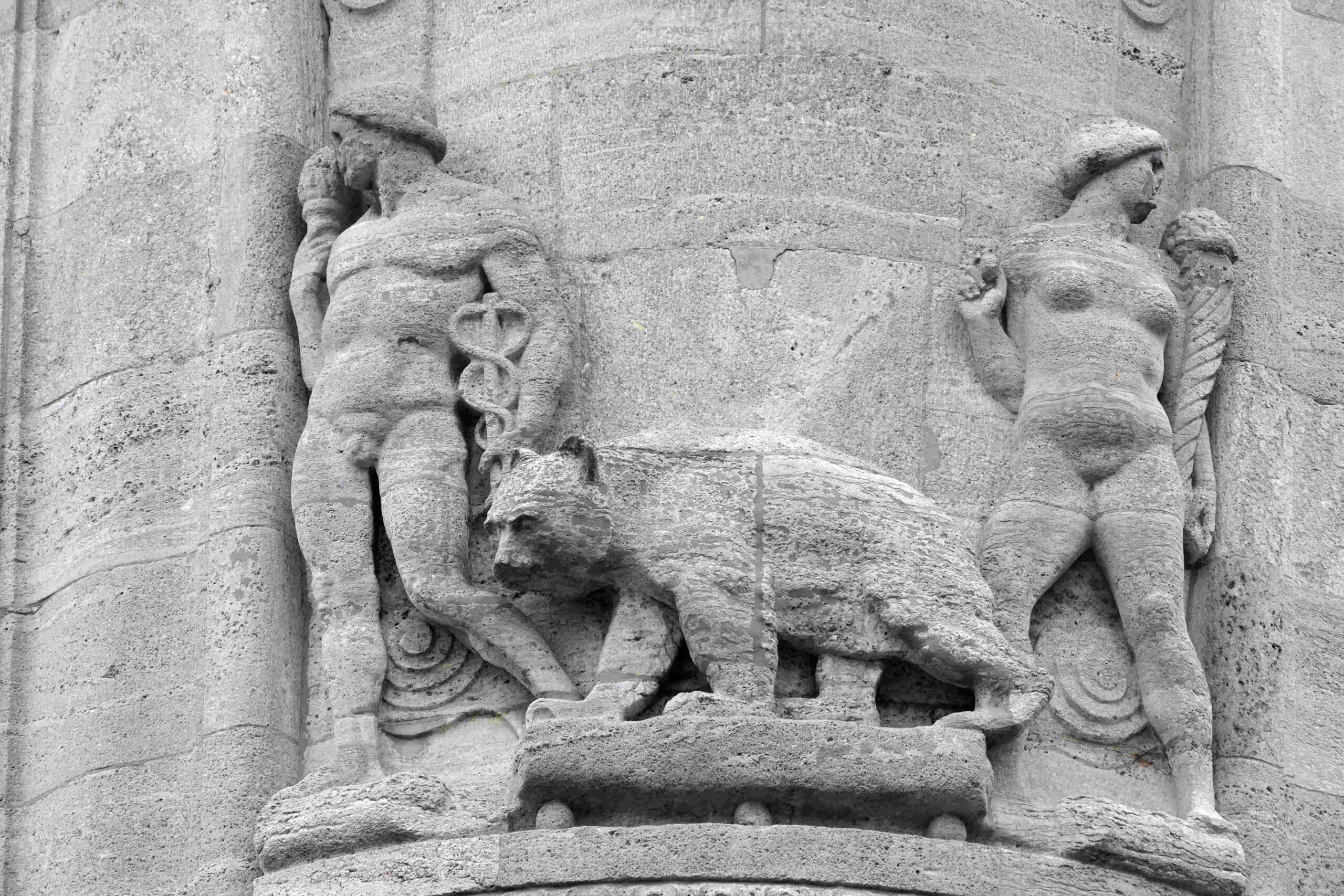 Die Kartusche mit den Figuren wurde, ebenso wie alle weiteren bauplastischen Elemente an der Fassade, von Richard Kühn 1910/1911 geschaffen.