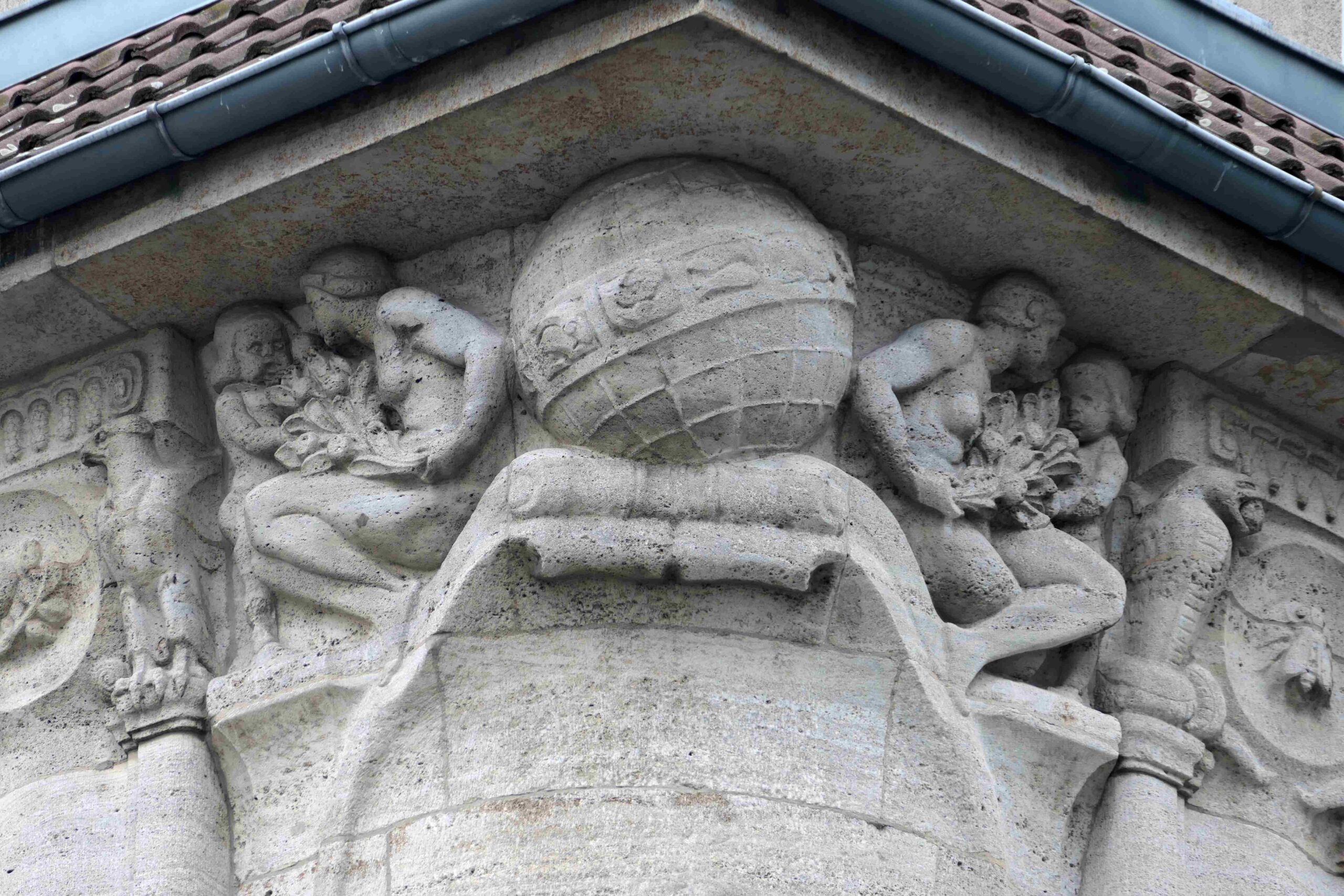 Die Kartusche mit den Figuren wurde, ebenso wie alle weiteren bauplastischen Elemente an der Fassade, von Richard Kühn 1910/1911 geschaffen.