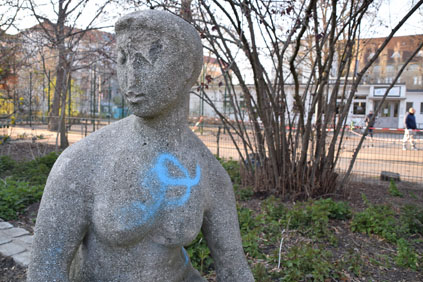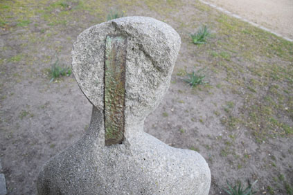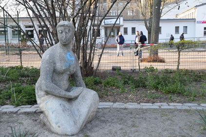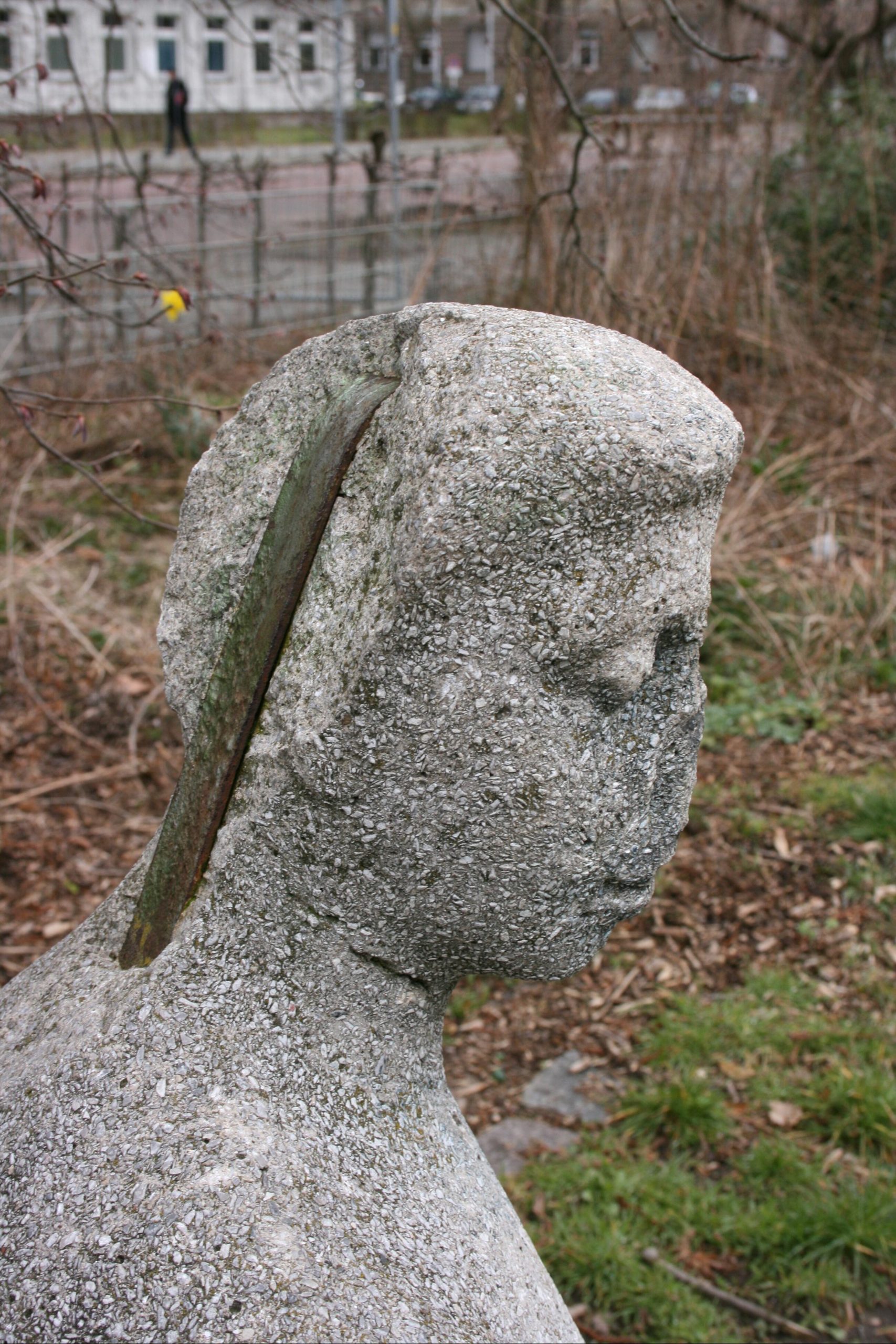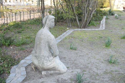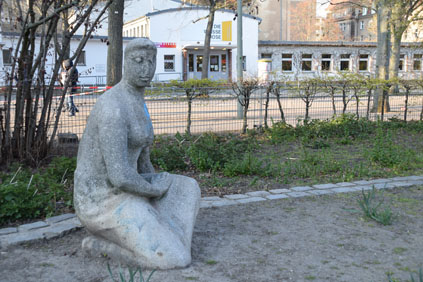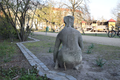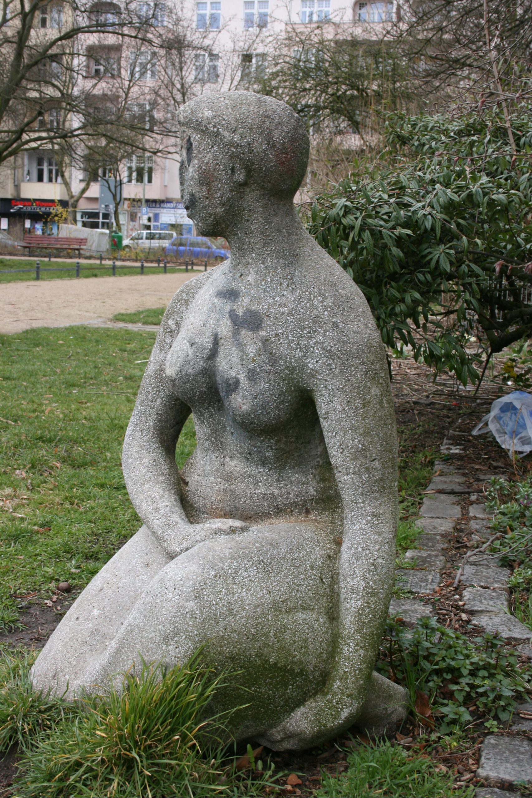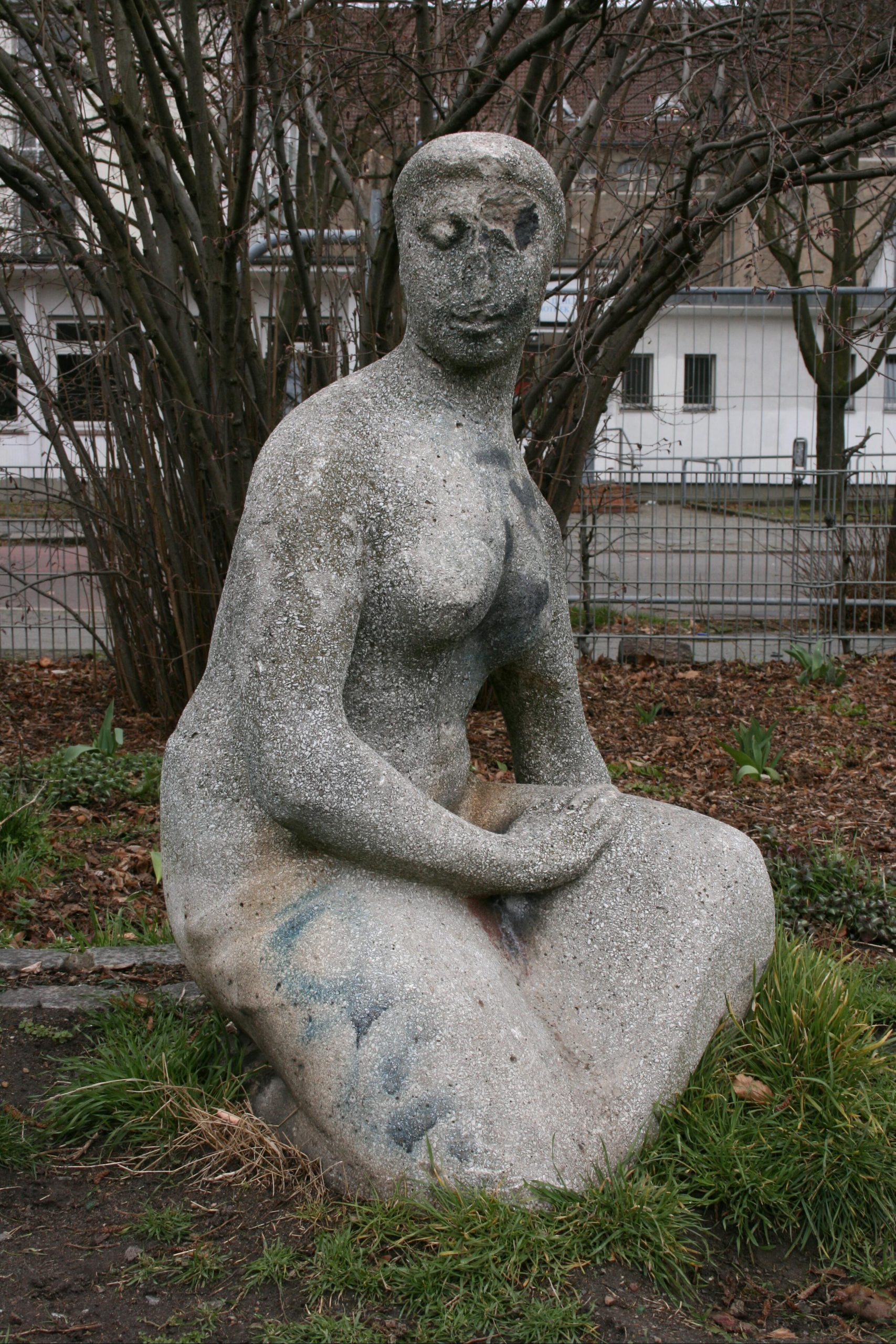 Hockende weibliche Figur mit kappenartigem Haar, bekleidet mit einem langem Rock, der die untergeschlagenen Beine bedeckt. Der Kopf ist nach rechts gewendet. Die rechte Hand ruht auf dem linken Oberschenkel. Mit der linken Hand stützt sich die Frau am Boden ab. Anmutige Kunststeinfigur in typischer Stilisierung und Abstrahierung der 1950er Jahre im westlichen Kulturkreis. Auffallend ist die Aufstellung ohne Sockel, wodurch eine sehr natürliche Beziehung zwischen Figur und Naturraum entsteht (Susanne Kähler, Jörg Kuhn).