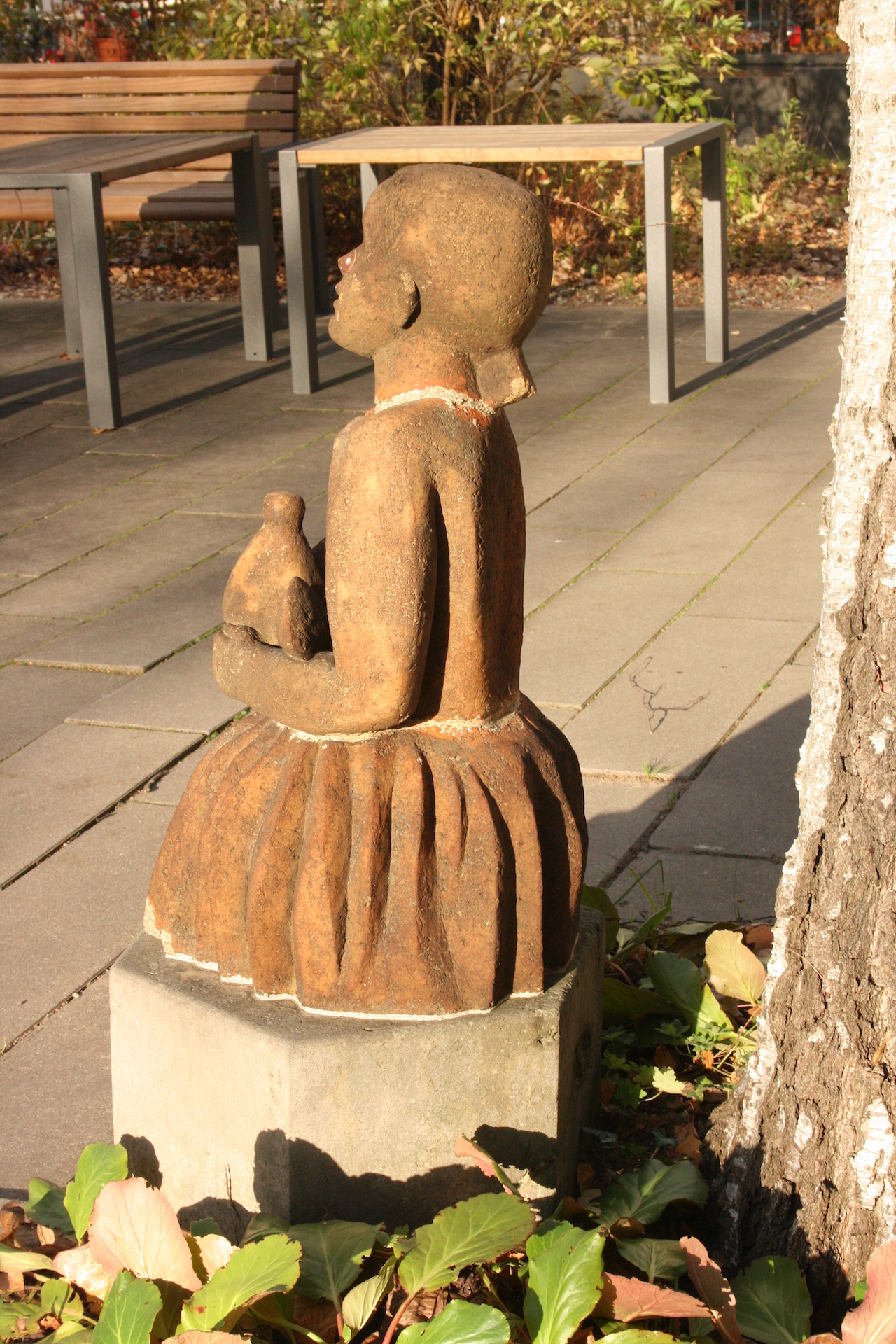 In der Gürtelstraße, im Terrassenbereich des zum Seniorenheim gehörenden Gartens und zwar vor einer Birke, steht die Figur eines knienden Mädchens aus erdfarbener Terrakotta mit einem sechseckigen Sockel aus grauem Beton. Sie trägt ein Kleid, das ihre Beine verbirgt. Mit beiden Händen hält sie eine Taube, die mit ausgebreiteten Flügeln auf ihrem Schoß sitzt. Der Blick des Mädchens ist nach oben gerichtet, der Mund ist halb geöffnet, die halblangen Haare sind am Hinterkopf zusammengebunden (Susanne Kähler, Jörg Kuhn).