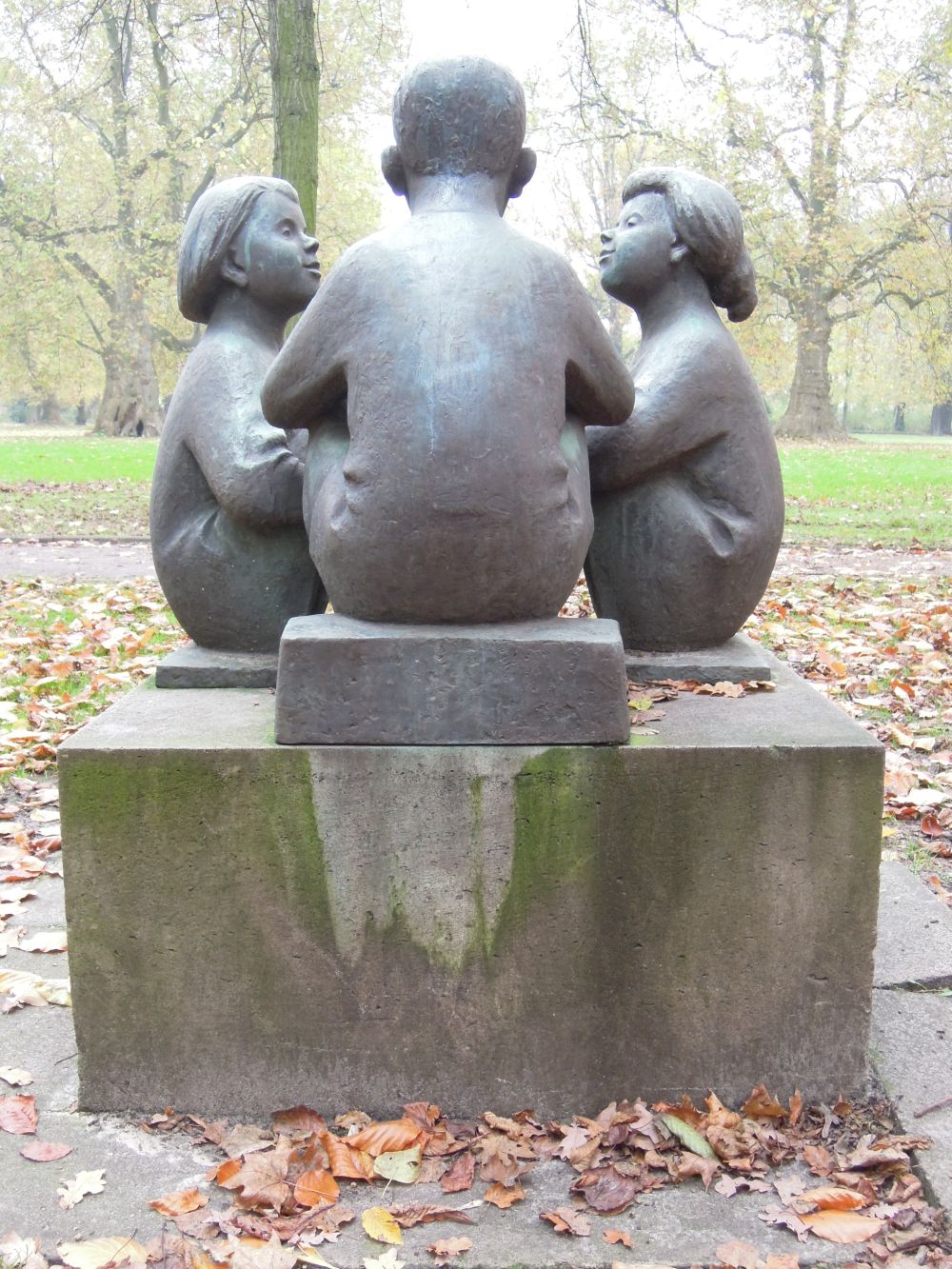 Die Plastik setzt sich aus drei im Halbkreis dicht beieinanderhockenden Kindern zusammen: seitlich je ein Mädchen und mittig ein Junge, der auf der erhöhten Plinthe sitzend eine dominante Position einnimmt. Die Kinder sind in ein gemeinsames Gespräch vertieft, was durch die Mimik ihrer Gesichter und Gestik veranschaulicht wird. Beide Mädchen haben die Knie mit den Armen angezogen; ihre Blicke und Köpfe sind auf den Jungen gerichtet, der sie anspricht, etwas erzählt und zur Betonung seiner Ansprache die Hände demonstrativ vor die Brust hält. Die beiden Mädchen folgen seinen Ausführungen mit kindlicher Neugier interessiert. Alle Kindergestalten sind zu einem innigen Ganzen gefügt, dem etwas Konspiratives anhaftet, sind von der Umgebung losgelöst. Kleidung und Haarschnitt der Kinder sind stark vereinfacht ausgebildet und konzentrieren sich auf das Wesentliche durch ihre erkennbare Zuordnung zu Mädchen und Jungen. Mit der Plastik Kindergruppe zeigt sich Hans Klakows Fähigkeit, einen Augenblick im Leben spielender Kinder genau nachzubilden. Dies wird vor allem durch die spannungsreiche Beziehung der Figuren deutlich (Jürgen Tomisch).
