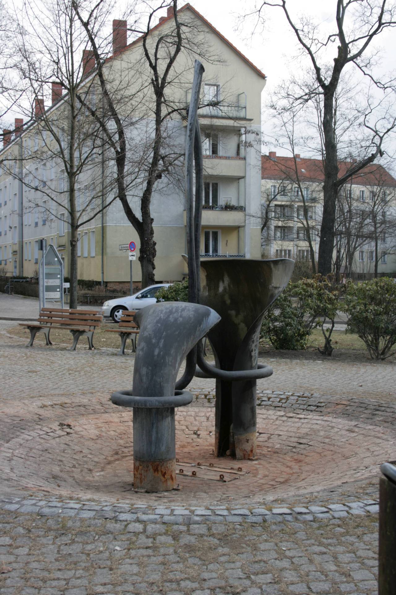 Der als Grünanlage gestaltete Platz hat eine auf Kreisformen aufgebaute Gestaltung. Dazu gehört eine Pergola und ein rundes bei leicht ansteigendem gepflasterten Gelände, sich trichterförmig nach unten zum Boden hin verjüngendes „Becken“, das ganz mit Granitpflastersteinen belegt ist. Der kreisförmige Boden, der Beckenmulde birgt die Brunnentechnik des in organischen Formen gestalteten Stahlbrunnens. Im Becken stehen zwei sich gegenüber stehende abstrakte Formen mit unterschiedlichen Höhen aus dunkelgrau gefasstem Stahl gegenüber, die entfernt an Elefantenohren oder Blätter erinnern. Aus ihnen „wachsen“ zwei aufsteigende, rüsselartige Rohre, die mit einem leichten Schwung annähernd senkrecht nach oben zeigen. Das Wasser tritt aus den Rüsseln durch kleine Öffnungen und oben durch die Hauptöffnung aus. Um den Brunnen gruppieren sich Sitzbänke (Susanne Kähler, Jörg Kuhn).