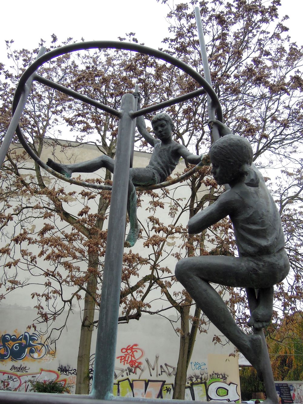 Die von Thieme geschaffene Plastik ist ein sogenannter Tröpfelbrun-nen. Der Brunnen besteht aus einem runden Betonsockel, auf dem ein hohes Metallgerüst in ein flaches Brunnenbecken gestellt wurde. Das schlichte, schmucklose Metallgerüst ist einem Klettergerüst für Kinder vergleichbar zweckmäßig gestaltet. Es verjüngt sich kegelförmig nach oben. Zwei Mädchen und drei Jungen – Kleinplastiken in Bronze – turnen auf dem Stahlgerüst herum. Das Wasser tropft aus dem oberen Metallring des Gerüsts in das flache Schalenbecken (Jürgen Tomisch).