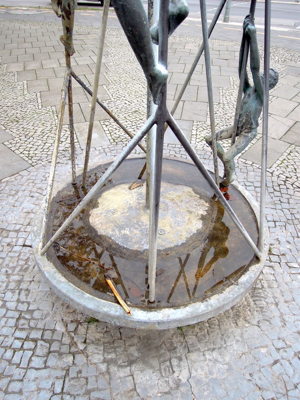 Die von Thieme geschaffene Plastik ist ein sogenannter Tröpfelbrun-nen. Der Brunnen besteht aus einem runden Betonsockel, auf dem ein hohes Metallgerüst in ein flaches Brunnenbecken gestellt wurde. Das schlichte, schmucklose Metallgerüst ist einem Klettergerüst für Kinder vergleichbar zweckmäßig gestaltet. Es verjüngt sich kegelförmig nach oben. Zwei Mädchen und drei Jungen – Kleinplastiken in Bronze – turnen auf dem Stahlgerüst herum. Das Wasser tropft aus dem oberen Metallring des Gerüsts in das flache Schalenbecken (Jürgen Tomisch).