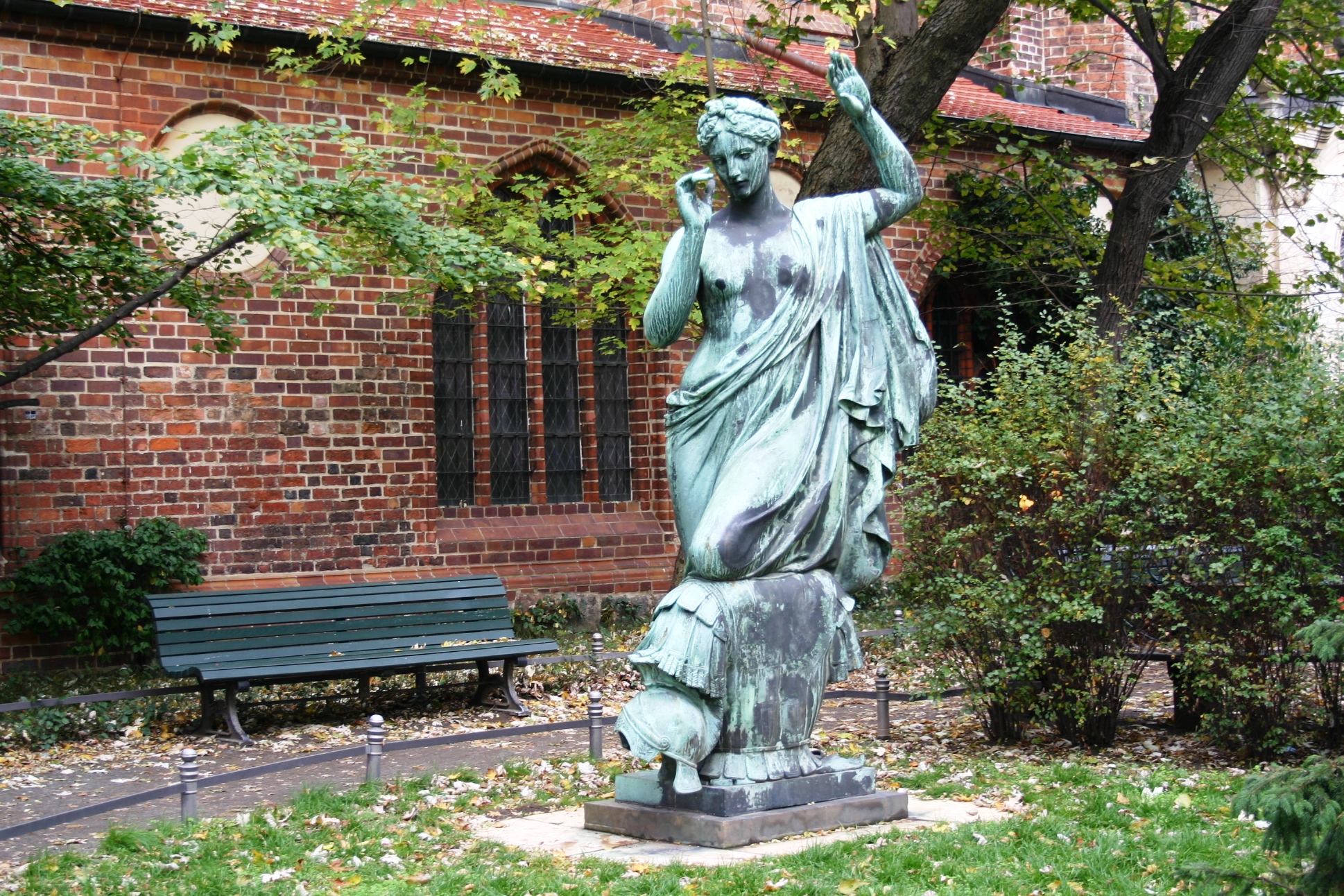 Die aus der griechischen antiken Mythenwelt stammende Klio - wie ihre acht Schwestern eine Tochter des Zeus - ist die mit einem Griffel ausgestattete Muse der Heldendichtung und Geschichtsschreibung. Die naturalistische Plastik stammt von der südlichen Schmalseite des Sockels des Denkmals für König Friedrich Wilhelm III. von Preußen (reg. 1797-1840). Einen Wettbewerb zum Denkmal gewann 1860 Albert Wolff. 1862 war sein Gipsmodell zur Reiterfigur vollendet. Der Guss erfolgte in Lauchhammer. Das Reiterstandbild wurde am 16.6.1871 im Lustgarten in Berlin eingeweiht. Erst 1873-1875 modellierte Albert Wolff mit seinen Schülern und Werkstattgehilfen die Sockelfiguren, die ebenfalls in Lauchhammer gegossen wurden. Die Einweihung des vollendeten Denkmals erfolgte am 2.9.1876. 1935 wurde das Monument aus der zentralen, auf das Schloss ausgerichteten Lage gerückt und zur Westseite des nun gepflasterten Platzes zum Kupfergraben hin versetzt. 1945 wurde das Denkmal demontiert und bis auf einige wenige Sockelfiguren und Attribute zerstört. Die Reste wurden als Schrott abgegeben oder deponiert. Die Figur der Klio, deutlich auf ihre betonte Stellung vor der Granitwand des Sockels hin konzipiert, wurde 1987 als Teil der „historischen Möblierung“ des Nikolaiviertels von Günther Stahn ausgewählt und im Bereich des schon im späten 19. Jahrhundert zu einer Grünanlage umgenutzten Nikolaikirchhofs sinnfrei aufgestellt (Jörg Kuhn).