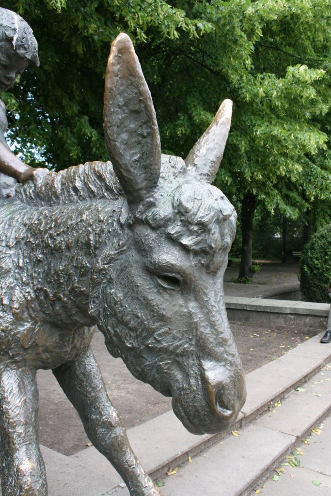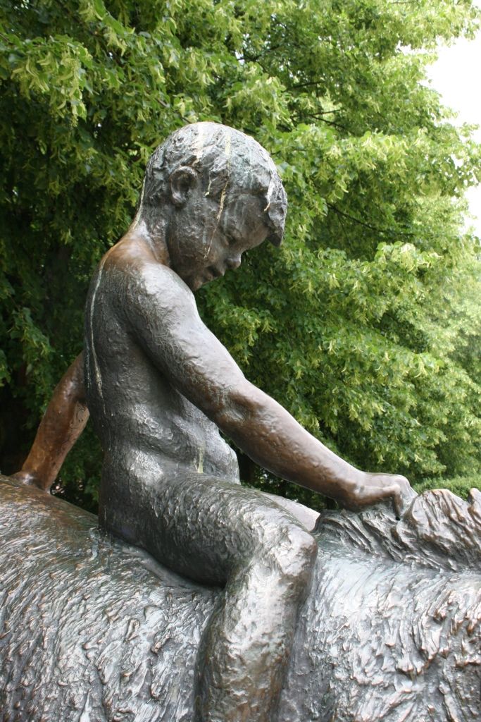 "Aus gleicher Künstlerhand (wie die Figuren von Adam und Eva) stammen die vier Gruppen, die jeweils ein Kind im Kontakt mit einem Tier zeigen, die von 1965-1968 ihre standorte im Südparterre des Schlosses in folgender Reihenfolge - jedes Jahr eine - erhielten: Junge mit Widder, Mädchen mit Schimpansen (das unzählige Besucher zu neckischen Fotoaufnahmen verleitet), Teenager mit Pelikan, Knabe auf Esel. Es werden Kinder in verschiedenen Lebensaltern dargestellt" (Heinrich Dathe, 1980, S. 11-12).