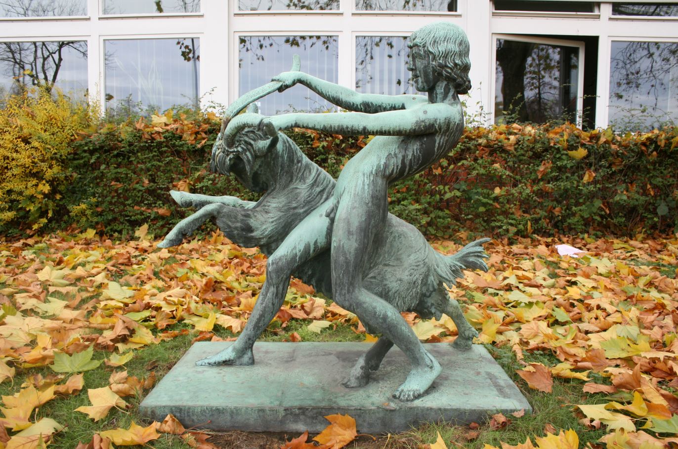 Auf rechteckiger Plinthe sind nebeneinander ein nackter Knabe und ein Ziegenbock angeordnet. Der Knabe versucht das Tier zu bändigen, in dem er es mit beiden Händen an den Hörnern festhält und sich mit beiden Füßen in weit auseinandergesetzter Schrittstellung absichert, während er sich der nach vorne ausgerichteten Zugrichtung des Tieres weit zurückgebeugt entgegen stemmt. Das Tier versucht seinerseits, die Hinterbeine abgestemmt, dem Zugriff des Knaben zu entkommen. Tier und Mensch sind naturnah geschildert und formuliert (Jörg Kuhn).