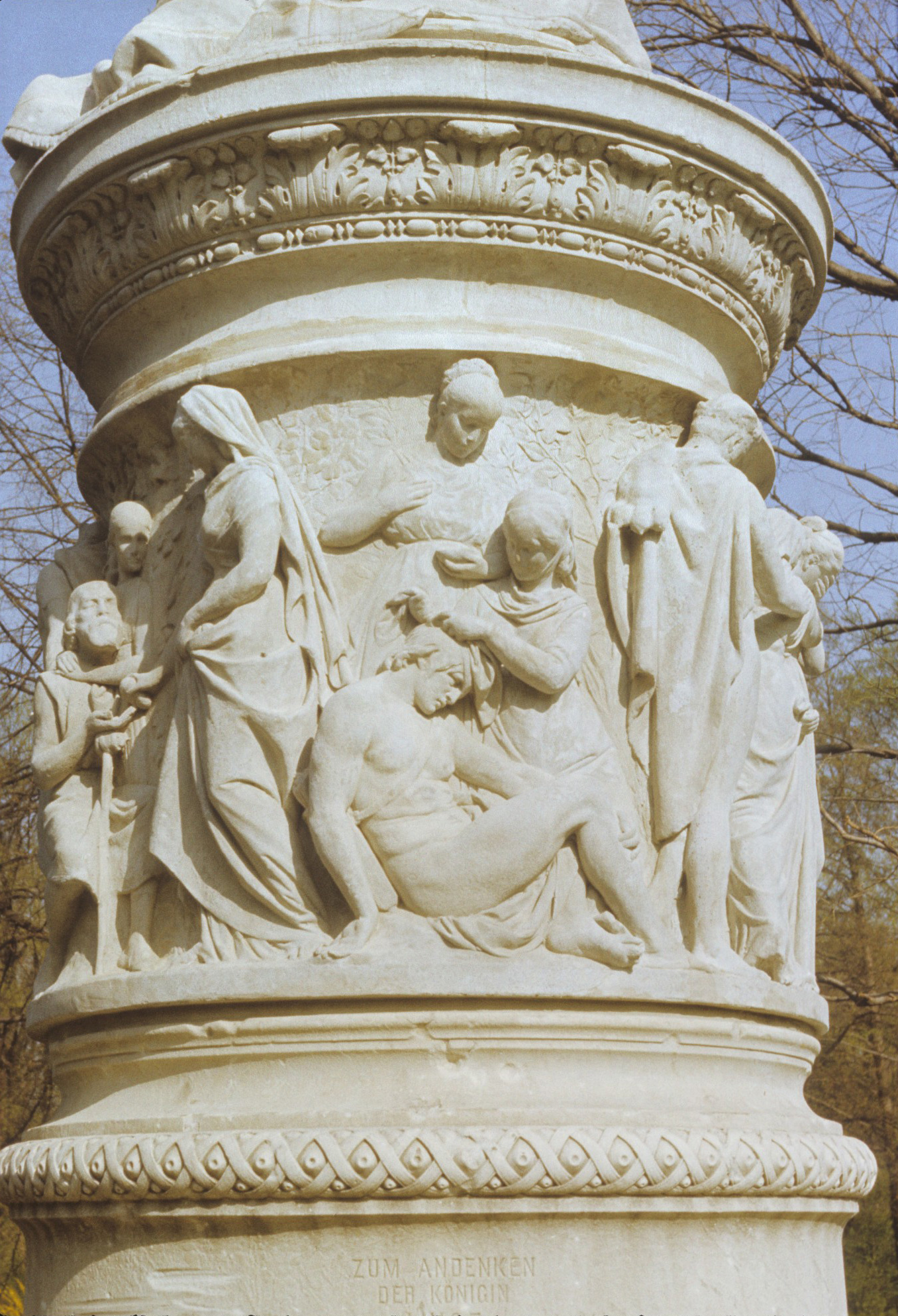 1809 ließen die Bewohner des Tiergartens auf der Kleinen Luiseninsel durch Johann Gottfried Schadow ein kleines Gedenkmal, einen blumenbekränzten Zippus mit bekrönender Schale, aufstellen. Das kleine Monument war dem Gedenken an Königin Luise gewidmet, die sich hier öfters aufgehalten haben soll. Das Gedenkmal verschwand schon im 19. Jahrhundert. Der Bildhauer Erdmann Encke, von 1860-1865 Schüler der Berliner Akademie und in der Werkstatt von Albert Wolff, erhielt 1876 von Verehrern der Königin Luise (1776-1810; reg. 1797-1810) den Auftrag, für das von Drake 1849 für den Tiergarten geschaffene Denkmal König Friedrich Wilhelms III. ein Pendant zu schaffen. Gestalterische Vorgabe an den Künstler war denn auch die Orientierung am Denkmal für König Friedrich Wilhelm III. Encke hat sich besonders bei der Gestaltung des Sockels daran gehalten und auch die Königin analog als Standbild verewigt. Die Auftraggeber des Königin Luise-Denkmals widmeten das Monument ihrem Sohn, dem seit 1871 als Deutscher Kaiser Wilhelm I. regierenden preußischen König, zu seinem 80. Geburtstag am 22. März 1877. Zum 104. Geburtstag der Königin, am 10. März 1880, konnte das Monument feierlich auf einer Tiergarteninsel eingeweiht werden. Das Schmuckgitter wurde erst nach der Einweihung aufgestellt (vgl. Photographie von Hermann Rückwardt in: Das kaiserliche Berlin; Erstveröffentlichung 1886, auszugsweise Neupublikation 1980). Der Sockelfries vom Denkmal für Königin Luise fand im Übrigen beim 1880, also zeitgleich errichteten „Germania“-Denkmal im Kleinen Tiergarten, ein Werk des bei Rudolf Siemering ausgebildeten Bildhauers Richard Neumann (1848-?), eine exakte Wiederholung. Auch die Germania war in Anlehnung an Enckes Standbild der Königin Luise gestaltet. Das „Germania“-Denkmal wurde vermutlich im Zweiten Weltkrieg eingeschmolzen, der Rest nach 1945 beseitigt. Der Aufstellungsort des Denkmals der Königin Luise war durch das Vorhandensein der Kleinen Luiseninsel (heute Standort des Denkmals „Jung-Wilhelm“ von 1904), einem der angeblichen Lieblingsaufenthalte der Königin, und durch das heute dem Luisendenkmal gegenüberstehende Denkmal ihres Gemahls vorbestimmt. Die aufwändige gartenarchitektonische Gestaltung des Denkmalumfeldes unternahm Eduard Neide (1818-1883). Im Zweiten Weltkrieg wurde das Denkmal vergleichsweise wenig beschädigt, jedoch das Gitter abgebaut und eingeschmolzen. Die aufwändige gartenarchitektonische Gestaltung der Großen Luiseninsel wurde nach 1945 nicht wiederhergestellt, so dass das Denkmal mitten auf einer ungegliederten Wiese stand. Das Denkmal der Königin Luise, durch Vandalismus und Verwitterung stark gefährdet, wurde um 1982 ins Lapidarium am Landwehrkanal verbracht und 1982/1983 am originalen Standort durch eine Zementkopie ersetzt. Das zuerst nicht mit abgeformte Sockelrelief wurde wenig später ebenfalls abgeformt und der Kopie im Tiergarten hinzugefügt. Die ausnehmend prächtige schmiedeeiserne Gittereinfassung mit glänzender schwarzer Lackierung wurde bis 1987 nach historischen Photographien durch die Metallrestaurierungswerkstatt Winkelhoff rekonstruiert (vgl. u.a.: Klaus von Krosigk: "Königin Luise im Berliner Tiergarten, in: MuseumsJournal, 24. Jg. 2010, Heft 1, S. 21-23). Ebenfalls wiederhergestellt nach historischen Plänen und Abbildungen wurde die gärtnerische Anlage der Denkmalumgebung. 2013 kehrte das restaurierte, originale Standbild der Königin Luise wieder in den Großen Tiergarten und an den originalen Aufstellungsort zurück (Wiedereinweihung durch das LDA Berlin, Gartendenkmalpflege, am 30.10.2013), die Kopie wurde in der ständigen Ausstellung "Enthüllt" in der Zitadelle Spandau untergebracht (vgl.: Helmut Caspar: "Restauriertes Luisendenkmal zurückgekehrt", in: Berliner Woche vom 08.07.2013 - https://www.berliner-woche.de/mitte/profile-101/helmut-caspar?type=article, abgerufen am 16.04.2019) (Jörg Kuhn).
