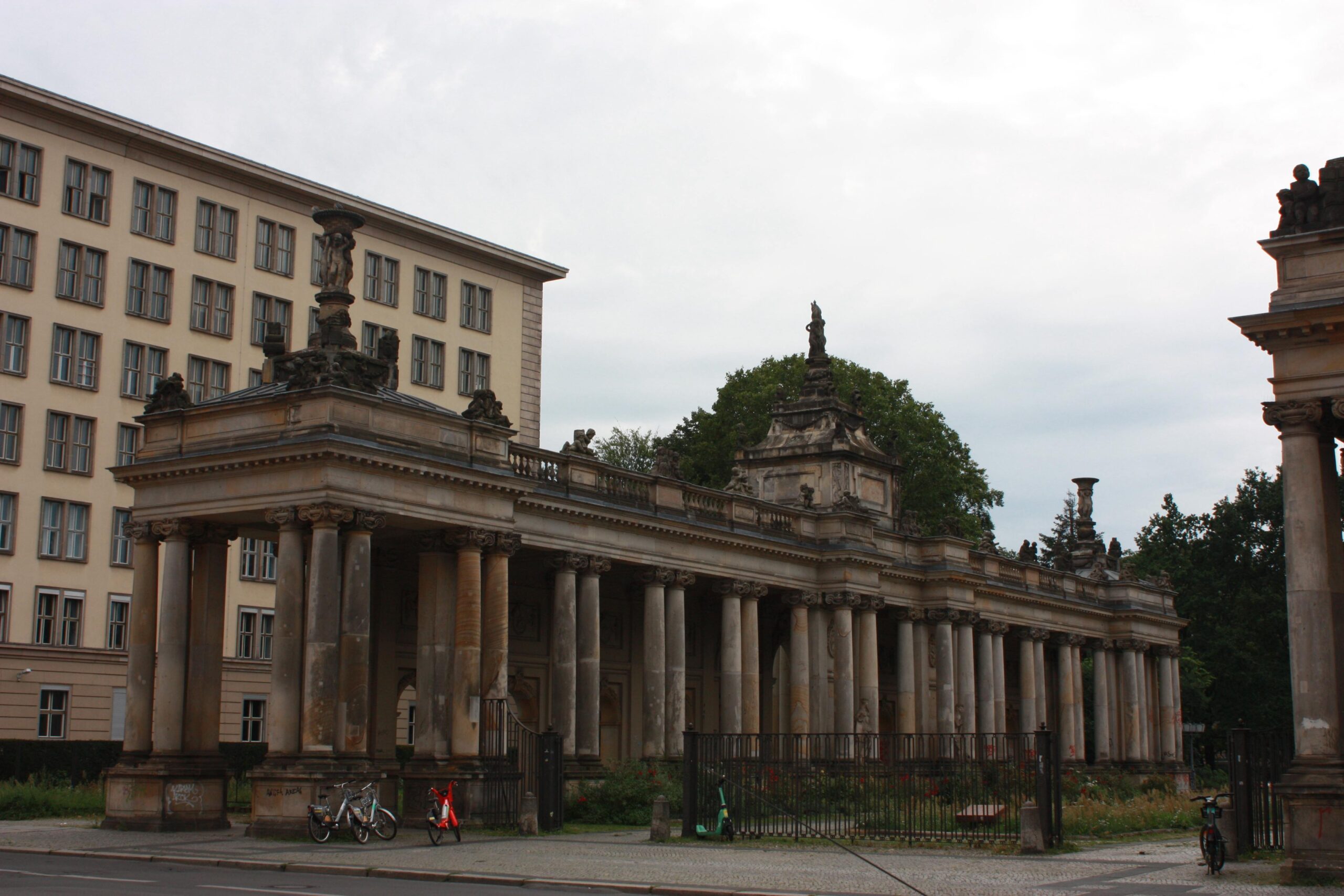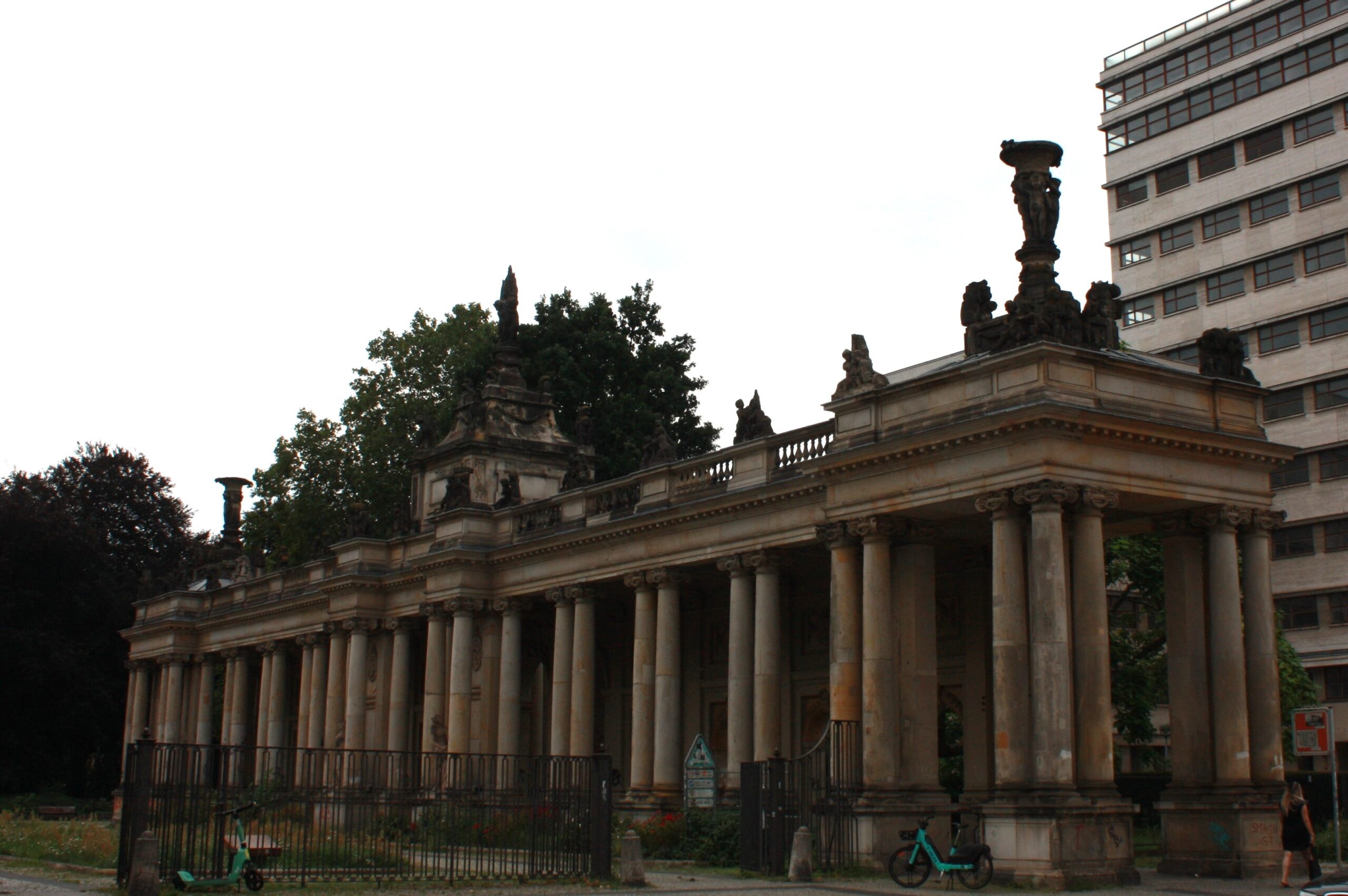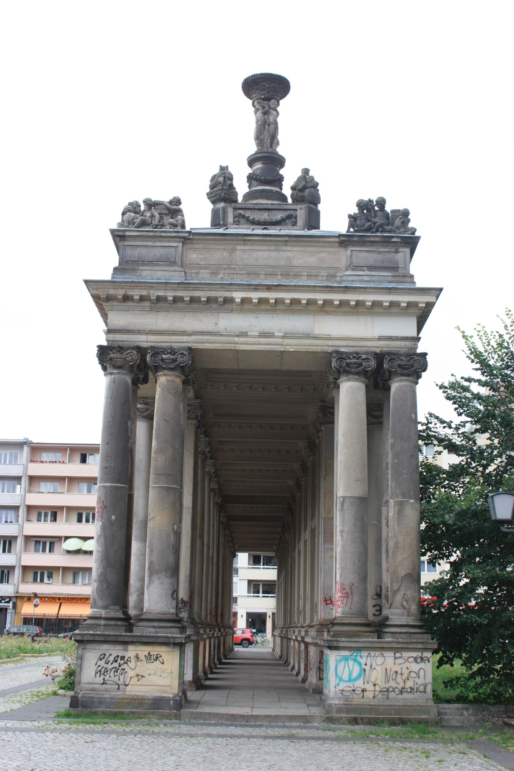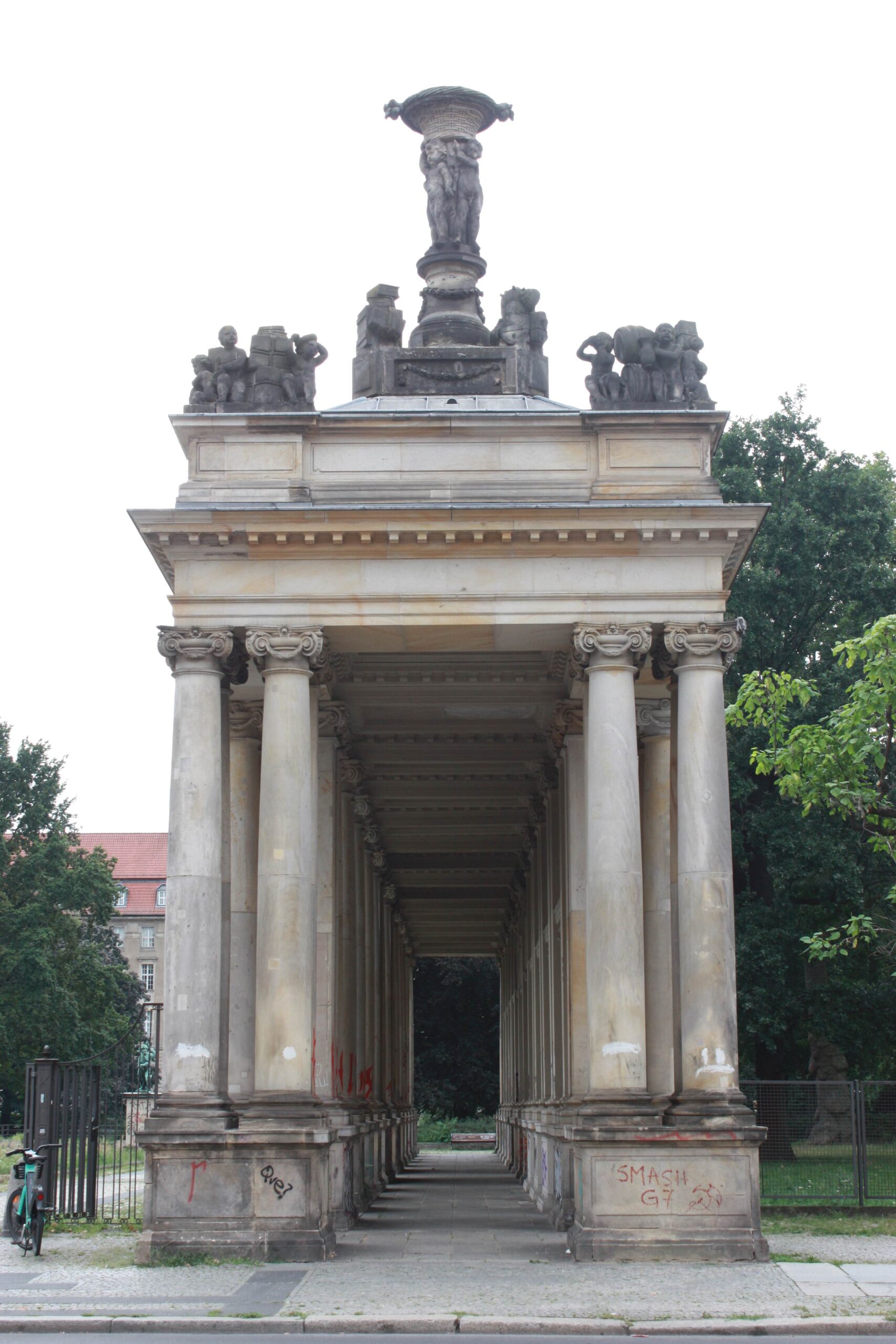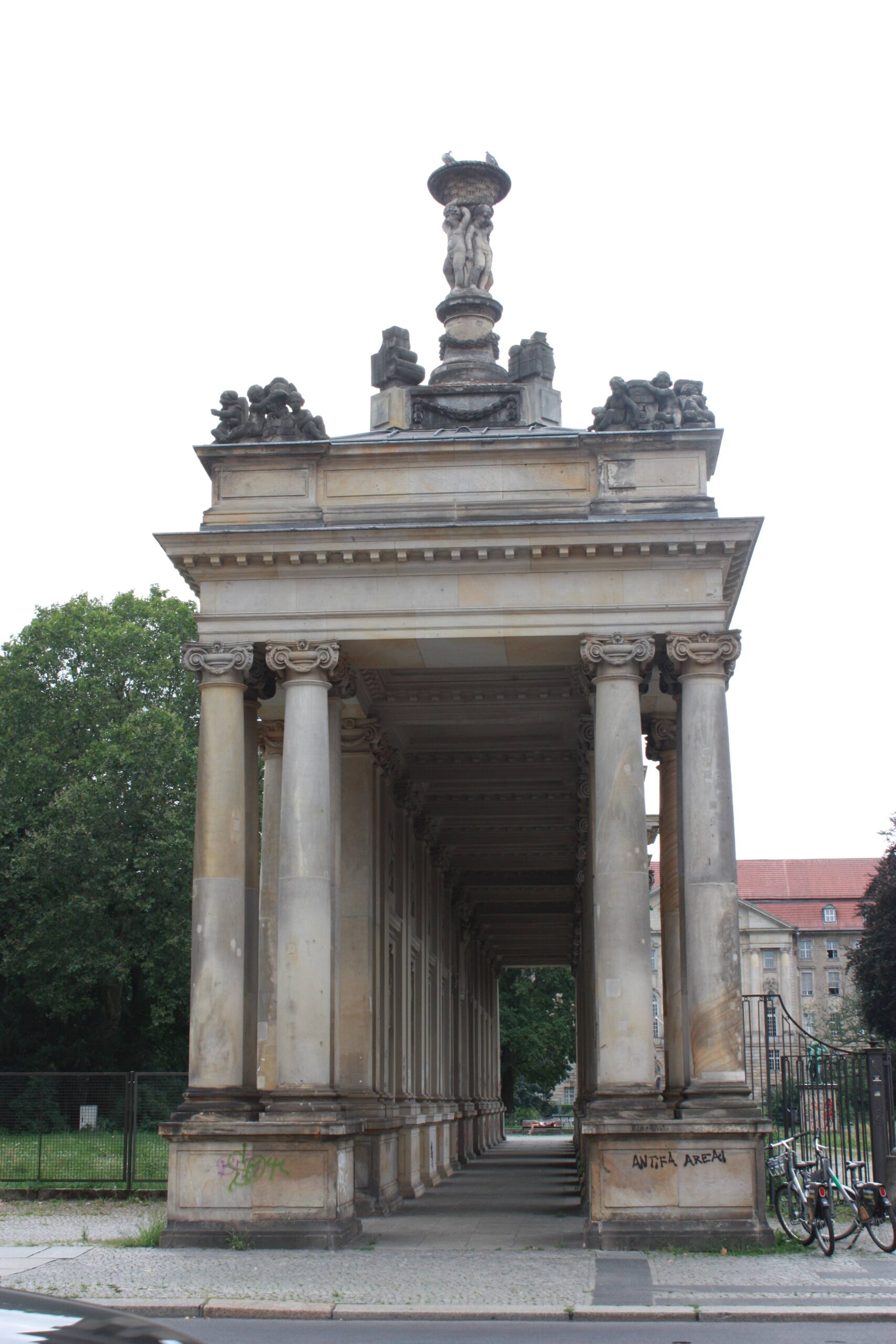 1777-1780 ließ König Friedrich II. in Preußen durch Gontard vor der „Königsbrücke“, jener im Verlauf der Königsstraße (heute: Rathausstraße) zum späteren Alexanderplatz hin errichteten Brücke zwei gegenüberliegende Säulenhallen errichten, die im hinten angefügten (und heute nicht mehr erhaltenen) Bereich Kaufmannsläden (Boutiquen) bargen. Als besonderen Schmuck erhielten die Königskolonnaden einen reichen Attikaschmuck, figürlich verzierte Kandelaberaufsätze auf den pavillonartigen Eckrisaliten und vier freiplastische Skulpturen („Pomona“, „weibliche Allegorie des Handels mit dem Attribut des Merkur“, „Neptun als Allegorie des Handels auf dem Wasserwege“, „Merkur als Allegorie des Handels auf dem Landwege) für die vier Nischen der Mittelrisalit-Fassaden. Die Ausführung der Figuren und der bildhauerisch gestalteten Bauglieder lag in den Händen der Kgl. Bildhauerwerkstätten. Die Modelle schufen Christian Wilhelm Meyer d. Ä. und Johann Wilhelm Schultze. 1875 wurden die Königskolonnaden, wie auch die restliche Brückenarchitektur, abgebrochen. Der Königsgraben wurde verfüllt. 1910/1911 wurden die Königskolonnaden ohne die Ladenanbauten in den neu gestalteten Heinrich-von-Kleist-Park (ehemaliger Botanischer Garten, der als Institution nach Dahlem verlegt wurde) umgesetzt. Hier setzte sie der Architekt Otto Stahn, durchaus nicht ohne kritische Reaktionen der Zeitgenossen, wie etwa vom Bildhauer Walter Schott, als rein dekorative Flankenbauten des Eingangsbereiches ein. Sie leiten den Blick des Eintretenden direkt über den Park hin zum 1909-1913 errichteten Kammergerichtsgebäude. Nach Kriegsbeschädigung wurden die Kolonnaden vermutlich im Zusammenhang mit der Neugestaltung des Kleistparkes durch Otto B. Pniower 1945 gesichert. Eine Sanierung ist für 1952 nach zu weisen, ebenso für 1955-1958, wobei die Skulpturen sich 1958 nach Fotos zu urteilen noch in einem sanierungsbedürftigen Zustand befanden. 1958 wurden vermutlich die ersten Attikagruppen durch Kopien ersetzt. Die anderen Kopien nach Attikafiguren und Reliefs folgten dann zu Beginn der 1980er Jahre. Die vier vollplastischen Standbilder wurden in das um 1980/1981 eingerichtete Lapidarium (Pumpwerk) am Landwehrkanal in Kreuzberg gebracht, die Puttengruppen der Attika (mit Silikonergänzungen u. dgl.) in das Depot der Denkmalpflege im Sockel des Denkmals für die Befreiungskriege auf dem Kreuzberg. Eine erneute Sanierung der Königskolonnaden erfolgte ab 2005. Die Wiederherstellung der direkten Parkumgebung der Kolonnaden war im Juni 2008 noch nicht abgeschlossen. Eine Rückführung der Königskolonnaden an ihren historischen Entstehungsort ist im Zusammenhang mit der von widerstreitenden Positionen dominierten Wiedergewinnung der Berliner Altstadt am Ende der 2010er Jahre immer wieder kontrovers diskutiert worden (Jörg Kuhn).