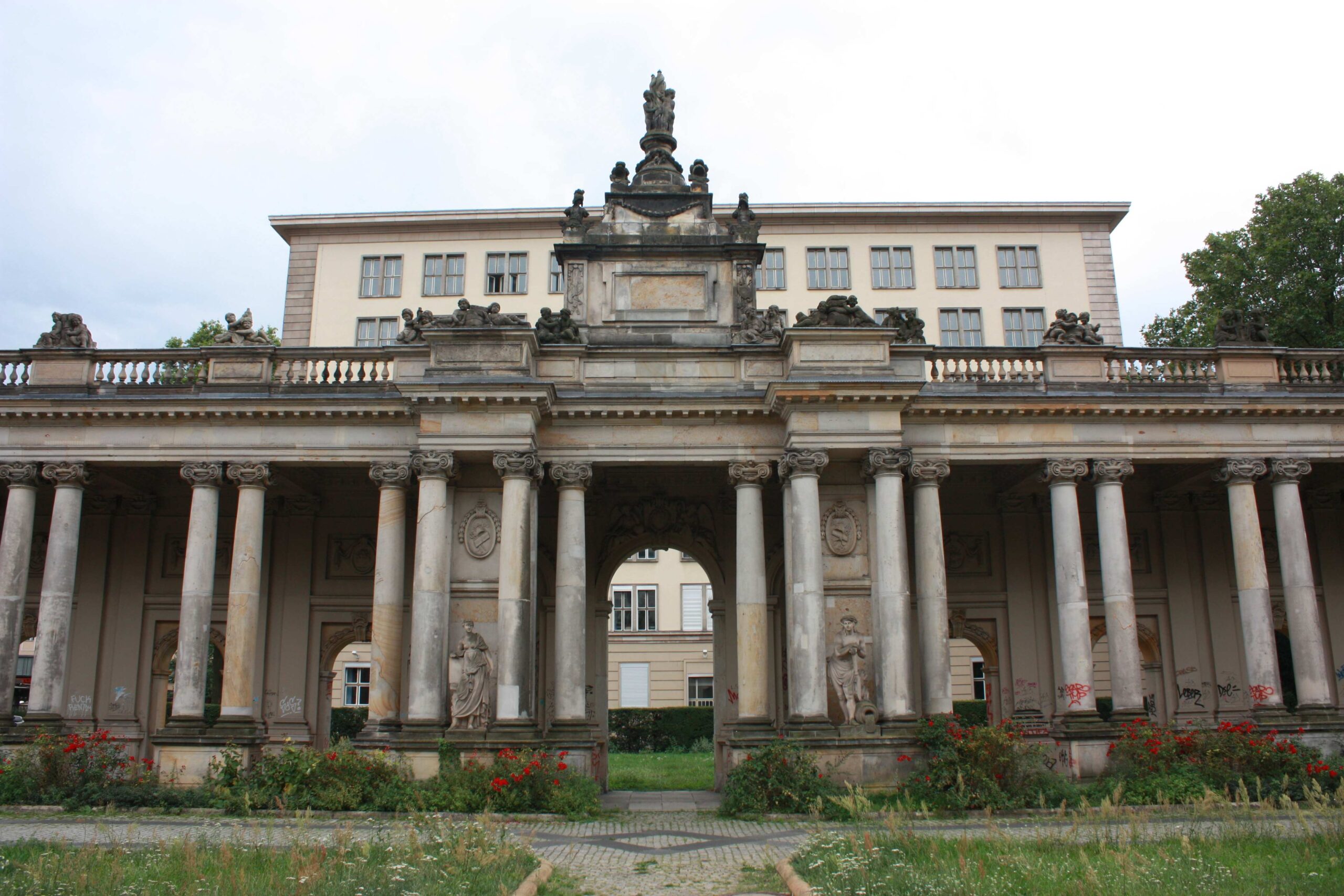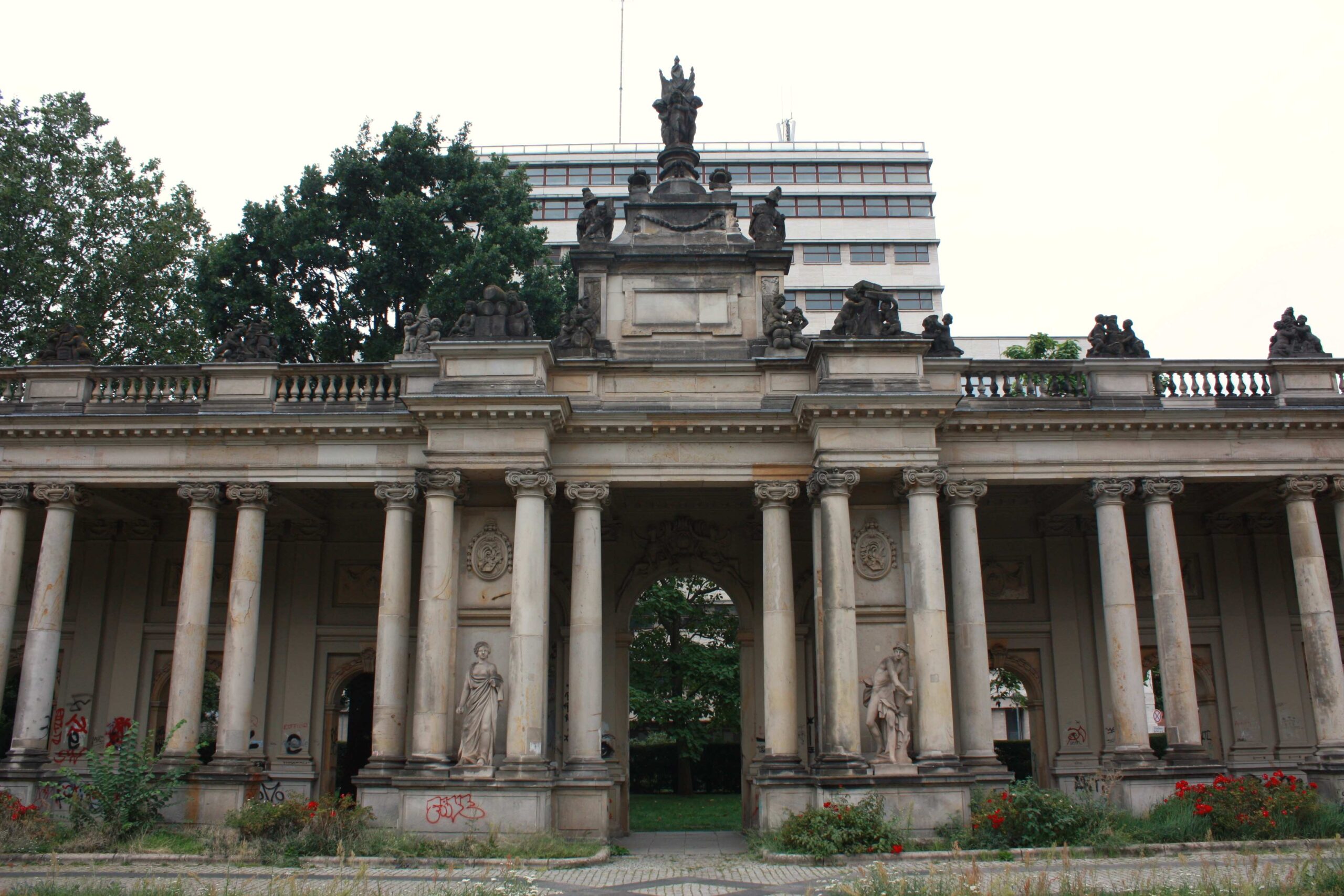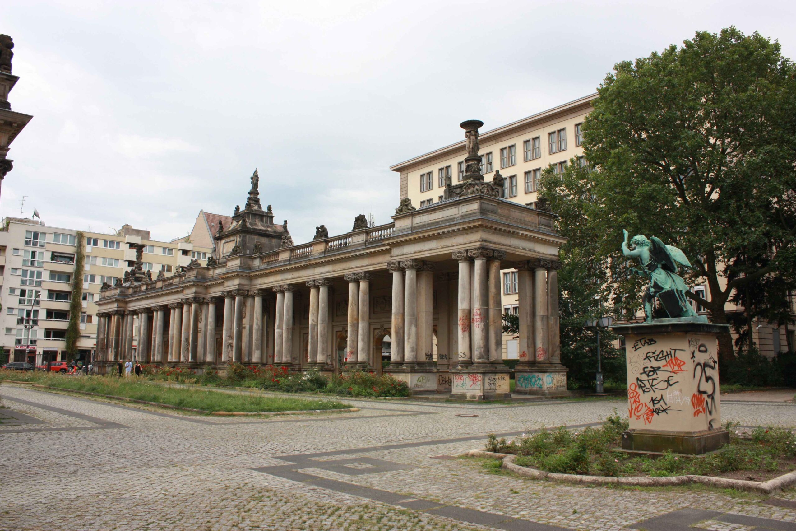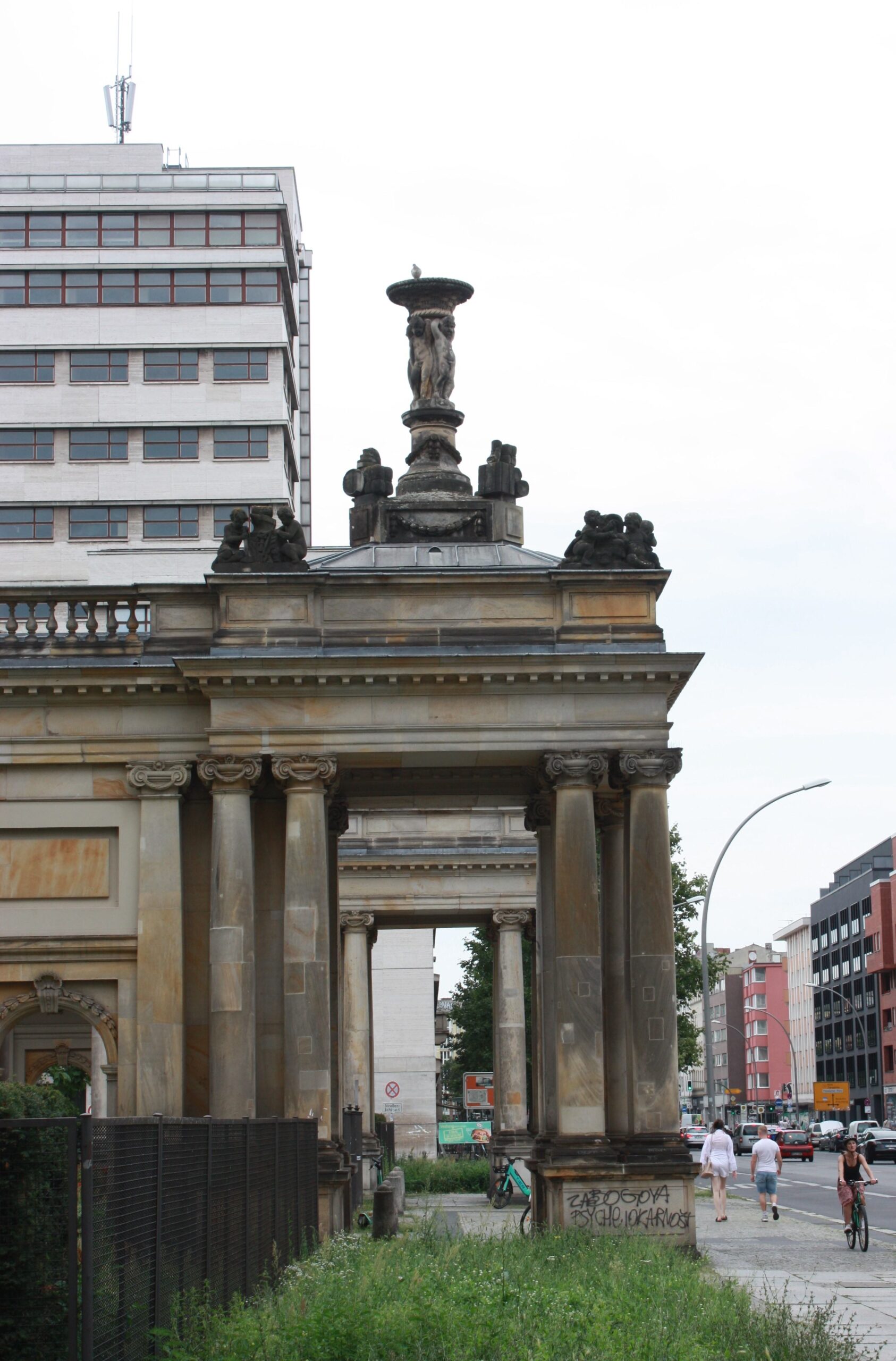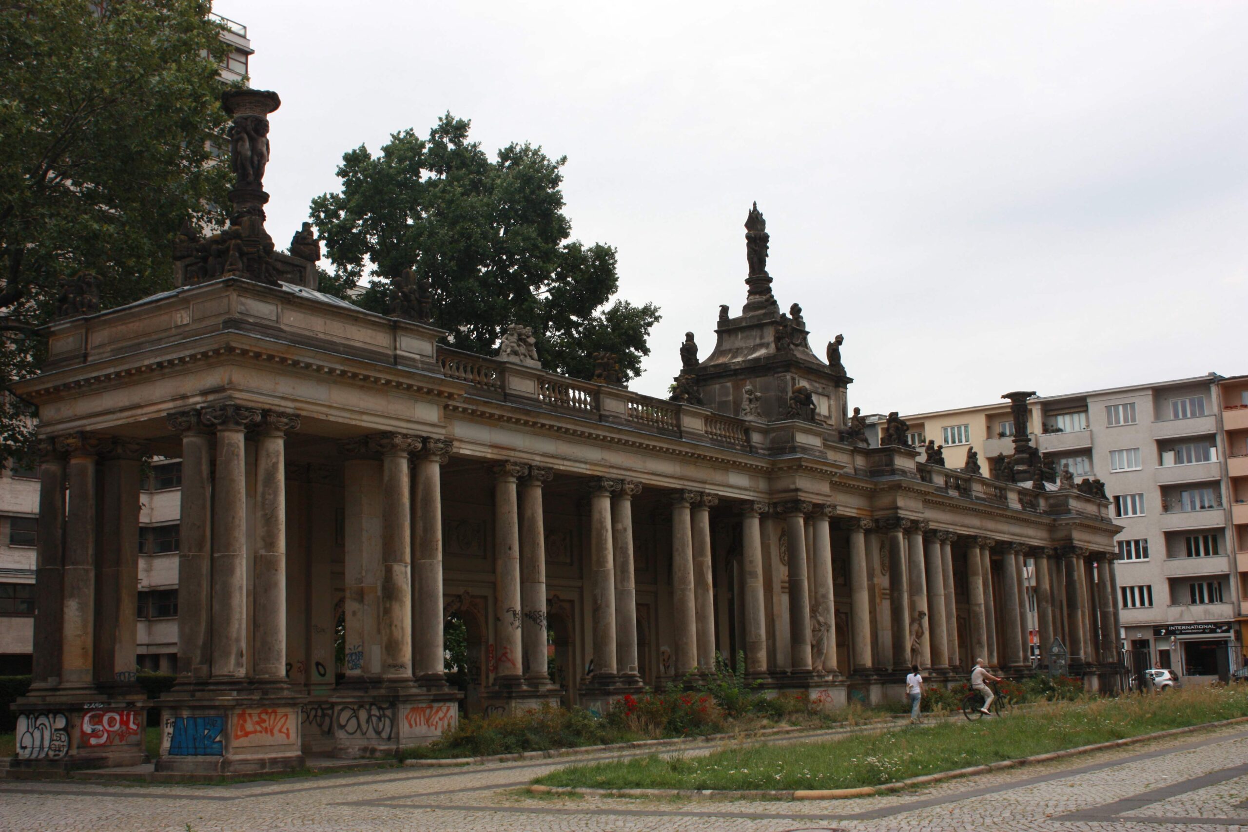 1777-1780 ließ König Friedrich II. in Preußen durch Gontard vor der „Königsbrücke“, jener im Verlauf der Königsstraße (heute: Rathausstraße) zum späteren Alexanderplatz hin errichteten Brücke zwei gegenüberliegende Säulenhallen errichten, die im hinten angefügten (und heute nicht mehr erhaltenen) Bereich Kaufmannsläden (Boutiquen) bargen. Als besonderen Schmuck erhielten die Königskolonnaden einen reichen Attikaschmuck, figürlich verzierte Kandelaberaufsätze auf den pavillonartigen Eckrisaliten und vier freiplastische Skulpturen („Pomona“, „weibliche Allegorie des Handels mit dem Attribut des Merkur“, „Neptun als Allegorie des Handels auf dem Wasserwege“, „Merkur als Allegorie des Handels auf dem Landwege) für die vier Nischen der Mittelrisalit-Fassaden. Die Ausführung der Figuren und der bildhauerisch gestalteten Bauglieder lag in den Händen der Kgl. Bildhauerwerkstätten. Die Modelle schufen Christian Wilhelm Meyer d. Ä. und Johann Wilhelm Schultze. 1875 wurden die Königskolonnaden, wie auch die restliche Brückenarchitektur, abgebrochen. Der Königsgraben wurde verfüllt. 1910/1911 wurden die Königskolonnaden ohne die Ladenanbauten in den neu gestalteten Heinrich-von-Kleist-Park (ehemaliger Botanischer Garten, der als Institution nach Dahlem verlegt wurde) umgesetzt. Hier setzte sie der Architekt Otto Stahn, durchaus nicht ohne kritische Reaktionen der Zeitgenossen, wie etwa vom Bildhauer Walter Schott, als rein dekorative Flankenbauten des Eingangsbereiches ein. Sie leiten den Blick des Eintretenden direkt über den Park hin zum 1909-1913 errichteten Kammergerichtsgebäude. Nach Kriegsbeschädigung wurden die Kolonnaden vermutlich im Zusammenhang mit der Neugestaltung des Kleistparkes durch Otto B. Pniower 1945 gesichert. Eine Sanierung ist für 1952 nach zu weisen, ebenso für 1955-1958, wobei die Skulpturen sich 1958 nach Fotos zu urteilen noch in einem sanierungsbedürftigen Zustand befanden. 1958 wurden vermutlich die ersten Attikagruppen durch Kopien ersetzt. Die anderen Kopien nach Attikafiguren und Reliefs folgten dann zu Beginn der 1980er Jahre. Die vier vollplastischen Standbilder wurden in das um 1980/1981 eingerichtete Lapidarium (Pumpwerk) am Landwehrkanal in Kreuzberg gebracht, die Puttengruppen der Attika (mit Silikonergänzungen u. dgl.) in das Depot der Denkmalpflege im Sockel des Denkmals für die Befreiungskriege auf dem Kreuzberg. Eine erneute Sanierung der Königskolonnaden erfolgte ab 2005. Die Wiederherstellung der direkten Parkumgebung der Kolonnaden war im Juni 2008 noch nicht abgeschlossen. Eine Rückführung der Königskolonnaden an ihren historischen Entstehungsort ist im Zusammenhang mit der von widerstreitenden Positionen dominierten Wiedergewinnung der Berliner Altstadt am Ende der 2010er Jahre immer wieder kontrovers diskutiert worden (Jörg Kuhn).