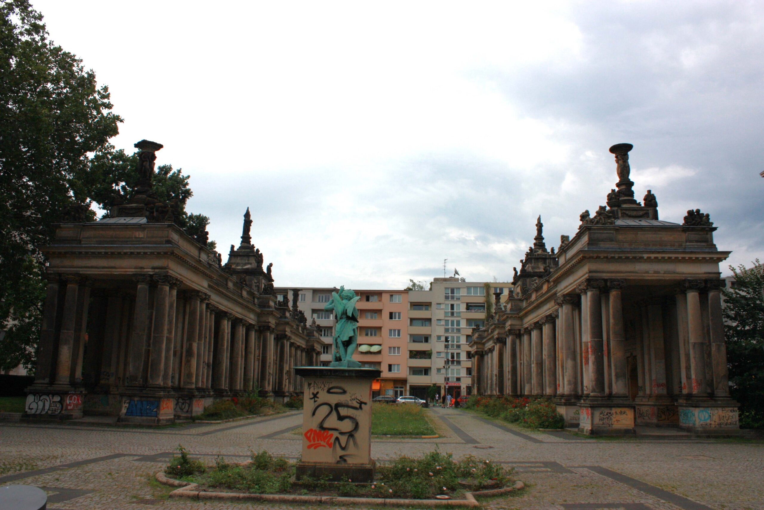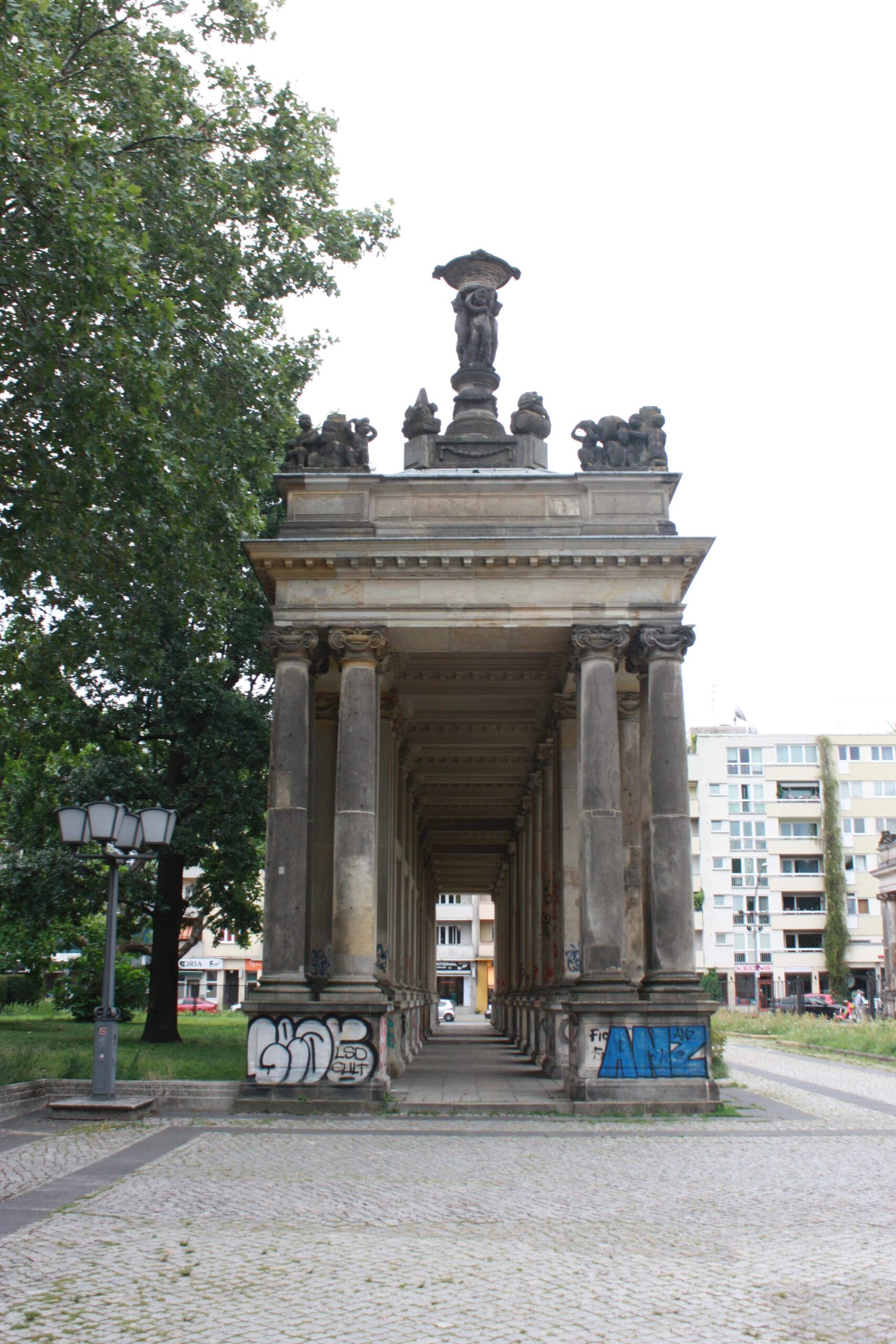 Es handelt sich bei dem Denkmal um ein Architekturdenkmal, bestehend aus zwei gegenüberliegenden, antithetisch gebildeten Hallen. Die beiden 52 Meter langen, mit Aufsätzen 12 Meter hohen und 7 Meter tiefen Hallen zeigen den gleichen Aufbau, bestehend aus je drei pavillionartigen Risaliten mit hohen Aufsätzen in Gestalt von Kandelabern bei den Eckrisaliten und auf mehrfach gestuften Sockeln stehenden Fahnenträgern bei den beiden Mittlrisaliten und den die Risalite verbindenden Säulenstellungen zu den Schmalseiten und zur inneren Längsseite. Die Rückwände zeigen eine Gliederung durch Wandvorlagen und Rundbögen. Die Attikabrüstungen sind mit Puttengruppen geschmückt, deren Attribute auf Handel und Gewerbe verweisen. Besonderer Schmuck der Innenfassaden der Mittelrisalite sind je Kolonnade zwei zwischen die gekuppelten Säulen gestellte vollplastische Figuren. Die Figuren stellen allegorisch ebenfalls Handel und Gewerbe dar. Die beiden männlichen Figuren sind als Merkur und Neptun zu identifizieren, wobei beide für den Handel stehen, der eine den Handel zu Lande und der andere den Handel zu Wasser. Die beiden weiblichen Allegorien lassen sich nicht so leicht benennen. Die eine der Figuren gilt als Pomona, Göttin der Früchte. Die andere weibliche Gewandfigur trägt das Attribut des Merkur, das Kerikeion („Schlangenstab“), ist also in erster Linie auch eine Allegorie des Handels, vielleicht hier – wegen der auch Äskulap und Hygiea zugehörigen Schlangen – der Handel mit Spezereien und Drogen. Die Architektur und die Figuren sind aus Sandstein („Seeberger Sandstein“) gearbeitet. Die Dachflächen sind mit Kupferblech gedeckt. An der nördlichen Kolonnade und zwar am östlichen Sockel der doppelt gekuppelten Säulen im Bereich des Trottoirs, ist eine Bronzetafel mit erklärendem Text zu den Kolonnaden angebracht (Jörg Kuhn, Susanne Kähler).
