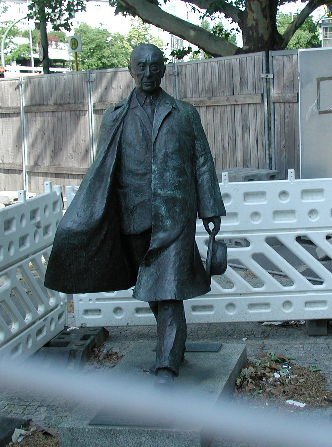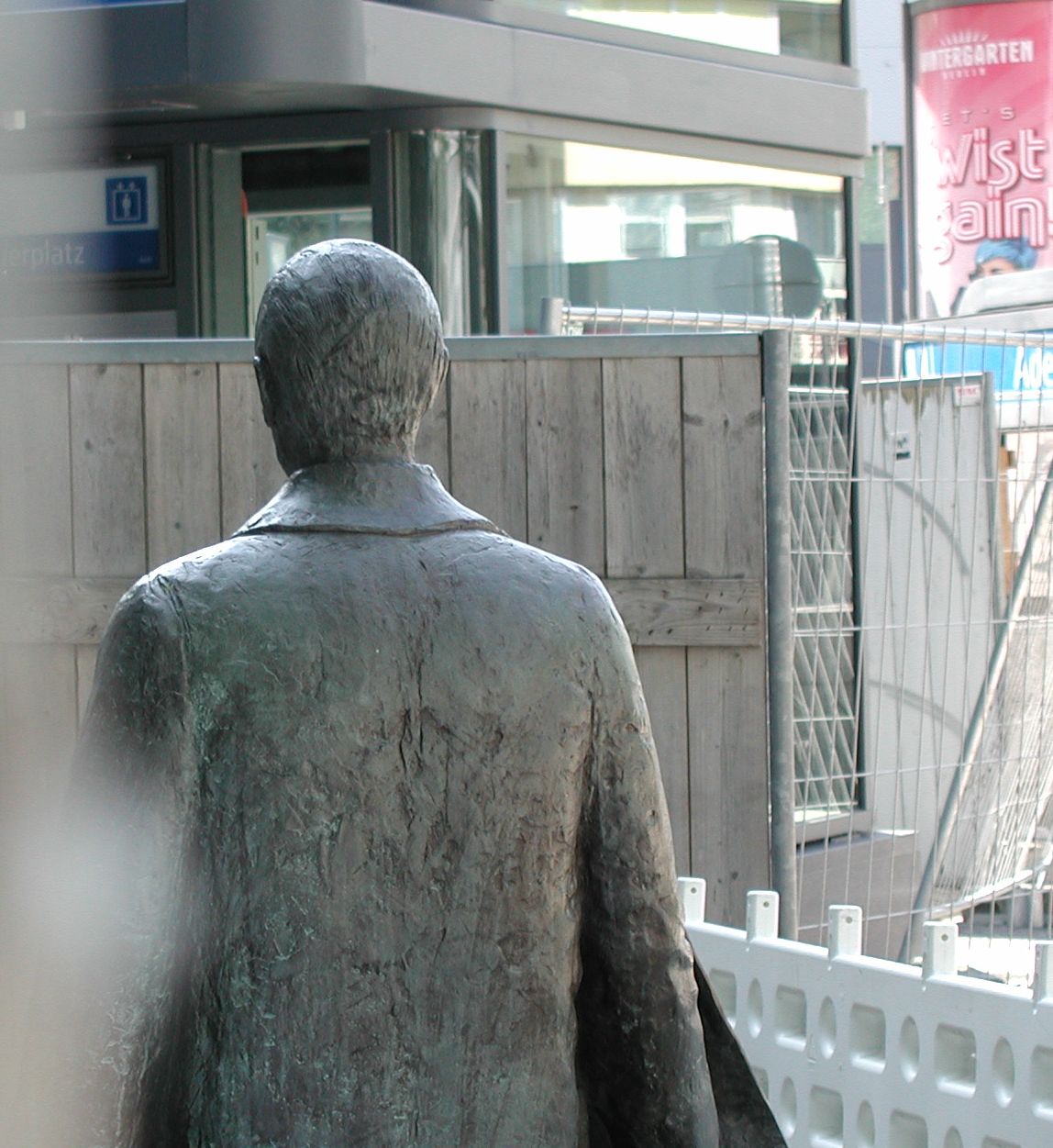 Am 19. April 2005 wurde das Konrad-Adenauer-Denkmal, geschaffen von Helga Tiemann (1917-2008), auf dem Adenauerplatz unweit eines Zugangs zum gleichnamigen U-Bahnhof enthüllt. Der Gestaltung des Standbildes liegt ein recht bekanntes Pressefoto zu Grunde, das Bundeskanzler Konrad Adenauer (1876-1967) beim Verlassen des Hotels Petersberg auf dem Petersberg im Siebengebirge bei Königswinter am Rhein zeigt. In dem Hotel, ein vornehmer Bau des späten Jugendstils hoch über dem Rheintal, hatte die Alliierte Hohe Kommission ihren Sitz. Adenauer war hier am 21. September 1949 mit den Vertretern der Besatzungsmächte zusammen getroffen und hatte das neue Besatzungsstatut in Empfang genommen. Adenauers selbstbewusstes Auftreten wurde allgemein - mit unterschiedlichem Echo - wahrgenommen. Die Gestaltung der auf bewusst flacher Standplatte aufgestellten Porträtfigur reflektiert die öffentliche Wahrnehmung des ebenso katholisch-konservativen wie prakmatischen, gleichzeitig gewieften und rheinisch-robusten CDU-Politikers als Identifikationsfigur der unmittelbaren (bundes-)deutschen Nachkriegsgeschichte. Das von der Wall AG (heute Wall GmbH) Berlin gestiftete Konrad-Adenauer-Denkmal wurde von der damaligen CDU-Vorsitzenden und späteren Bundeskanzlerin Angela Merkel eingeweiht (Jörg Kuhn).