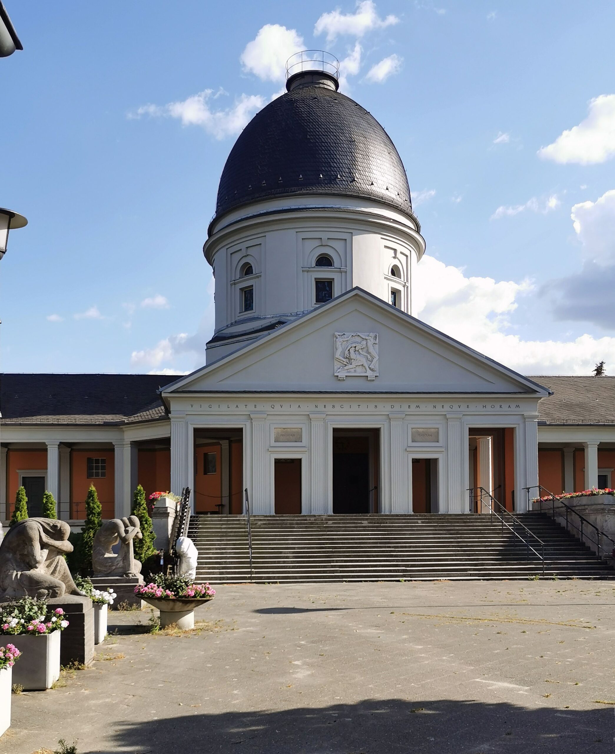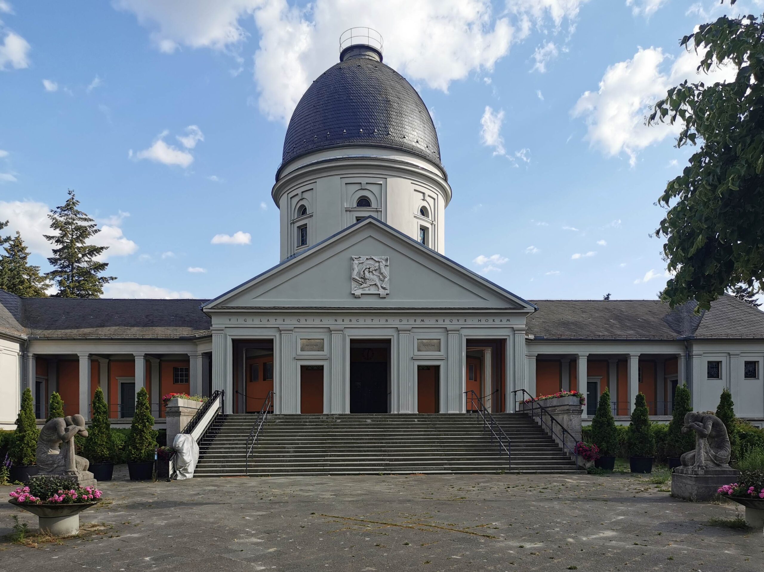 Der mit einer hohen Kuppel bekrönte Zentralbau des Krematoriums wird von zwei seitlichen Flügeln flankiert, sichtbare Schornsteine wurden bei der Errichtung vermieden. Eine breite Freitreppe führt von dem Ehrenhof zum Eingang, d. h. zunächst zu einer offenen, vorgelagerten Wandelhalle (Jörg Kuhn).