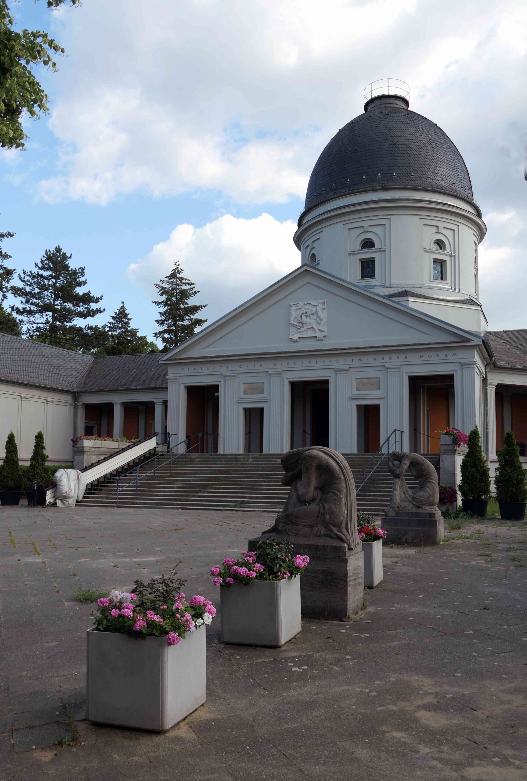 Der mit einer hohen Kuppel bekrönte Zentralbau des Krematoriums wird von zwei seitlichen Flügeln flankiert, sichtbare Schornsteine wurden bei der Errichtung vermieden. Eine breite Freitreppe führt von dem Ehrenhof zum Eingang, d. h. zunächst zu einer offenen, vorgelagerten Wandelhalle (Jörg Kuhn).