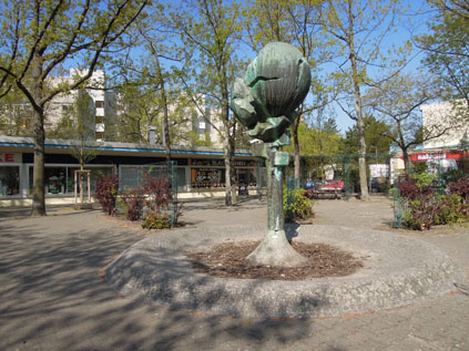 Im Westen wird der große Platz an der Waldshuter Zeile von einer eingeschossigen Ladenzeile gefasst. Der Brunnen steht zentral vor dieser in einem mit verschiedenen Pflanzbeeten, Bänken und Sitzpollern ausgestatteten Bereich der Gesamtanlage. In der Mitte eines mit Granit-Mosaikstein gepflasterten runden Beckens mit wulstigem Rand erhebt sich auf einem hochgezogenen Mosaikpflasterfuß eine bronzene Säule mit einer gespaltenen und zerklüfteten Kugel. Bei Inbetriebnahme dringt aus dem Inneren der aufgeborstenen Kugel Wasser aus drei Sprühdüsen.