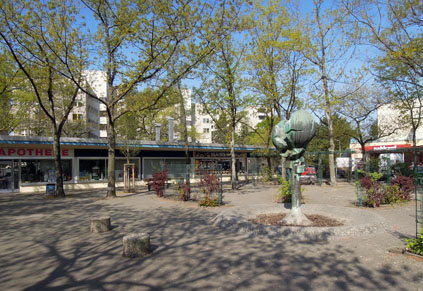 Im Westen wird der große Platz an der Waldshuter Zeile von einer eingeschossigen Ladenzeile gefasst. Der Brunnen steht zentral vor dieser in einem mit verschiedenen Pflanzbeeten, Bänken und Sitzpollern ausgestatteten Bereich der Gesamtanlage. In der Mitte eines mit Granit-Mosaikstein gepflasterten runden Beckens mit wulstigem Rand erhebt sich auf einem hochgezogenen Mosaikpflasterfuß eine bronzene Säule mit einer gespaltenen und zerklüfteten Kugel. Bei Inbetriebnahme dringt aus dem Inneren der aufgeborstenen Kugel Wasser aus drei Sprühdüsen.