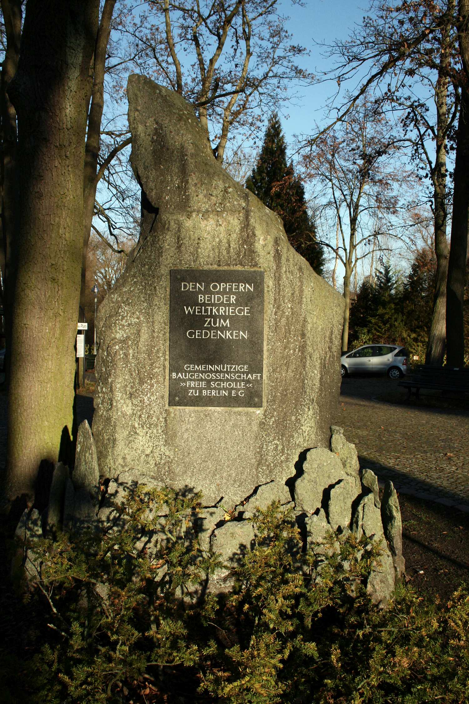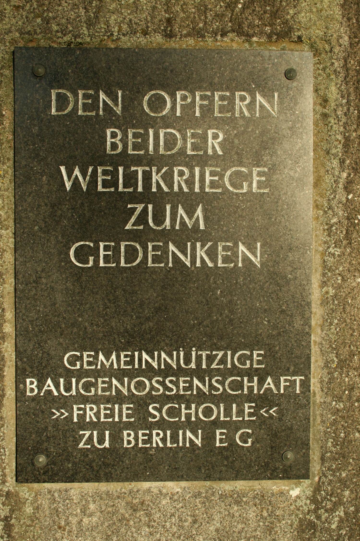 »DEN OPFERN / BEIDER / WELTKRIEGE / ZUM / GEDENKEN / GEMEINNÜTZIGE BAUGENOSSENSCHAFT / FREIE SCHOLLE / ZU BERLIN EG«