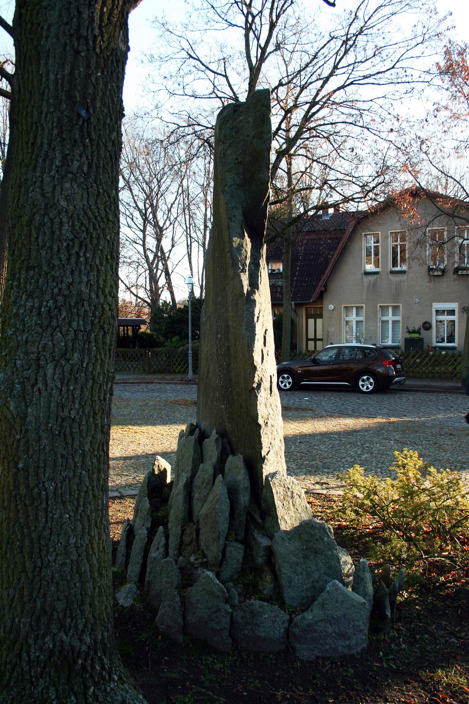 Die 1899-1910 errichtete Kolonie Freie Scholle ist eine der ältesten genossenschaftlichen Siedlungen Berlins, die aufgrund ihrer Größe ein in sich „eigenes Ortsbild darstellt, das den Bewohnern in seiner starken Differenziertheit stets eine erlebnisreiche Abwechslung und eine sichere Identifikation bietet.“ (Quelle: Landesdenkmalamt Berlin, Denkmalerfassung, Kennziffer 09011912 (Kolonie Freie Scholle), Erfassungstext). Zum Andenken an ihre im 1. Weltkrieg umgekommenen Angehörigen stellten die Bewohner der „Freien Scholle“ 1921 auf der damals noch „Rundteil am Fließ“ genannten Fläche am Ende der Egidystraße den Granitfindling mit einer (Kunststein?-)Gedächtnistafel auf: „Zum Gedächtnis ihrer im Weltkriege 1914-18 verbliebenen Angehörigen (folgen Namen). Gewidmet von der Bewohnerschaft Freie Scholle“, lautete die Inschrift. Nach dem zweiten Weltkrieg (Datum unbekannt) wurde die Schrifttafel ausgetauscht, die Inschrift geändert und das Denkmal nun den Opfern beider Weltkriege gewidmet. Den Namen Marie-Schlei-Platz erhielt das „Rundteil am Fließ“ am 8. Mai 2003, dem 30. Todestag der SPD-Politikerin, die sich besonders für die Rechte sozial Benachteiligter eingesetzt hatte; sie hatte ganz in der Nähe, im Allmendeweg 112, gelebt. Möglicherweise wurde zu diesem Anlass auch die Pflasterung des Platzes gestaltet. In einer zweiten Aussparung des Platzbelages, hinter dem Gedenkstein, wurde ein Schild mit dem Namen des Platzes und einer Würdigung der Namensgeberin Marie Schlei aufgestellt (Jürgen Tomisch, Barbara Anna Lutz).