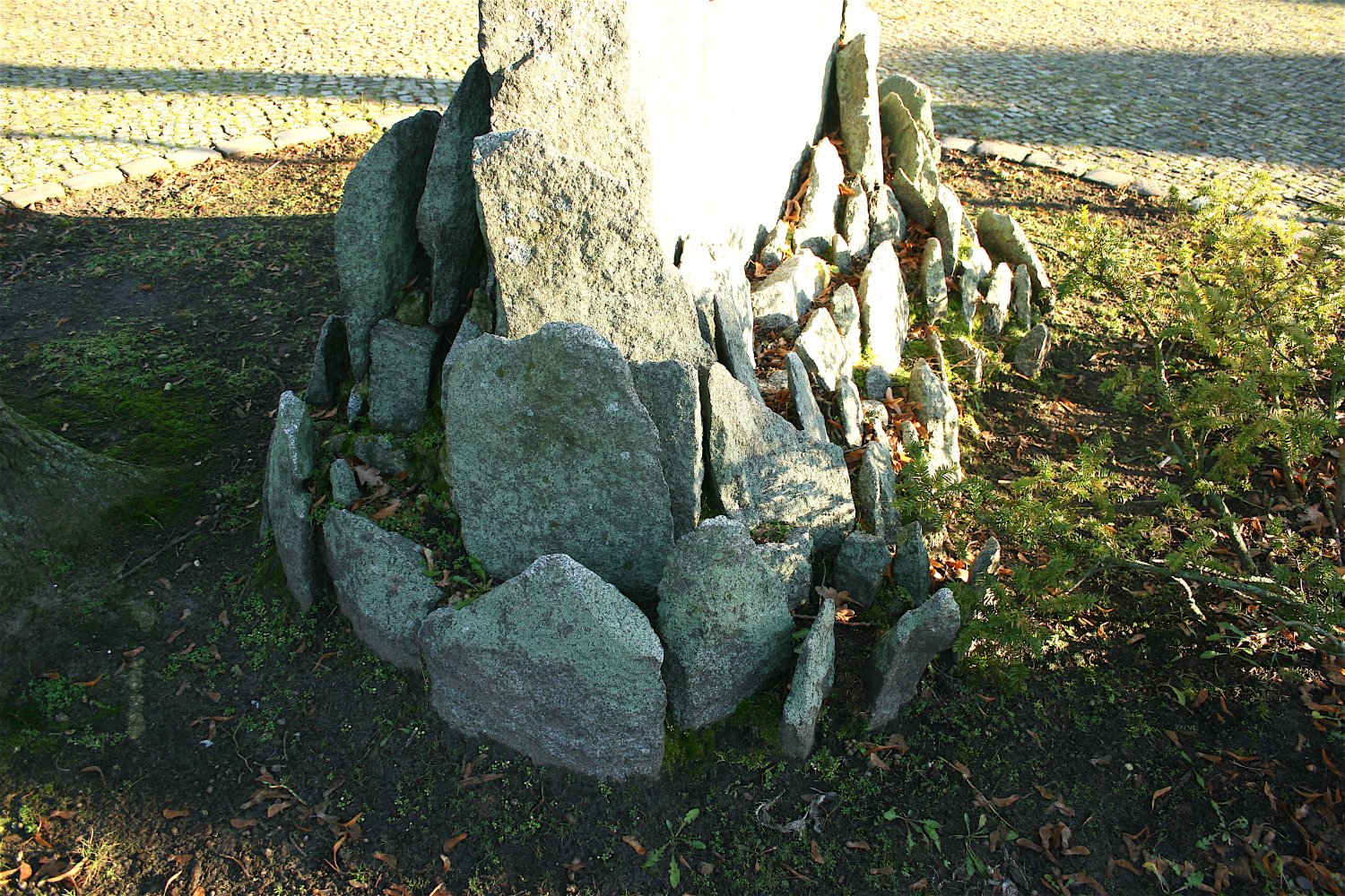 In der kreisrunden, von Kopfsteinen eingefassten Beetfläche ragt der kantige, flache Findling gut sichtbar, aus der Erde hervor. Er ist umrandet von zahlreichen kleinen, ebenfalls flachen und kantigen, aufgestellten Steinen. Die Vorderseite mit der Schrifttafel aus glatt poliertem Granit ist zur Egidystraße hin ausgerichtet und trägt eine Inschrift.