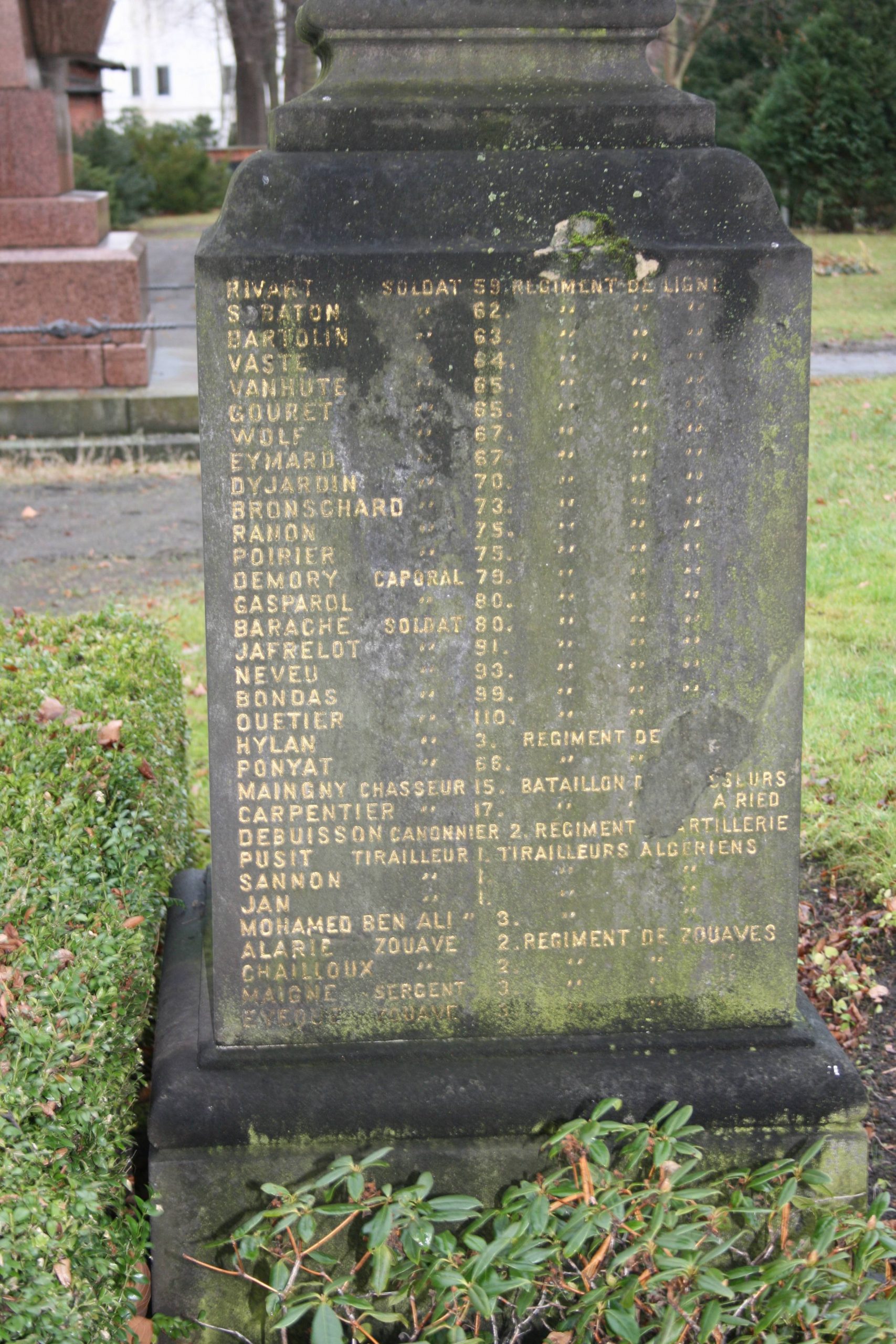 Zahlreich wurden die in Berlin während des Deutsch-Französischen Krieges in Gefangenschaft und den Lazaretten verstorbenen französischen Soldaten auf dem damaligen „Neuen Garnisonfriedhof“ beigesetzt. Vermutlich um 1875 wurde durch die französischen „Landsmänner“ ein zentrales Gedenkmal für diese Toten aufgestellt. Offenbar enthielt das Monument zu Beginn nur die Frontinschrift, denn 1904 erschien in einer französischen Zeitung ein Beitrag, in welchem das Fehlen der individuellen Namen an dem Berliner Gedenkmal beanstandet wurde (vgl. Karl Plumeyer: Beiträge zur Geschichte der Berliner Garnisonfriedhöfe - II. Die Grabstätten in der Hasenheide, in: Mitteilungen des Vereins für die Geschichte Berlins, 41. Jahrgang 1924, S. 48-52, bes. S. 51; Schütze, 1986). Die Namen und Daten der Gefallenen wurden darauf hin umgehend „nachgetragen“ (Jörg Kuhn, Susanne Kähler).