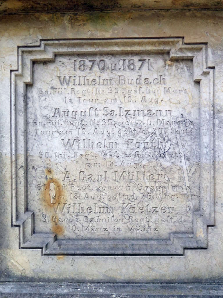 »1870 u. 1871 / Wilhelm Budach / Bn. Füs. Regt. No.35 gef. bei. Mars / la Tour am 16. Aug. / August Salzmann / Bn. Füs. Reg. No.35 verw. bei Mars la / Tour am 16. Aug. gest. d. 30. Sept. / Wilhelm Porth / 60. Inf. Regt. gef. bei Gravelotte / am 18. Aug. / A. Carl Müller / 60. Inf. Regt. verw. b Gravelotte / am 18. Aug. gest. d. 26. Aug. / Wilhelm Kietzer / 3. Garde Garnison Regt. / gest. d. / 10. März in Mainz«
