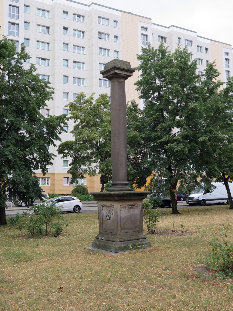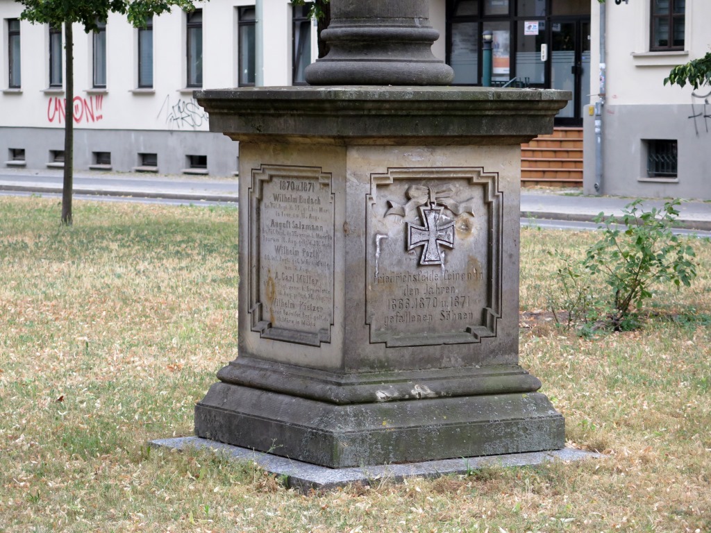 Auf dem ehemaligen Friedrichgelder Dorfanger in der Alfred-Kowalke-Straße (hieß von 1900 bis 1976 Wilhelmstraße), westlich der Kirche der Paul-Gerhard-Gemeinde erhebt sich das Kriegerdenkmal für die Gefallenen der Kriege 1866 und 1870/1871. Ein hochrechteckiger Sockel über profilierter Basis im attischen Stil trägt eine Rundsäule, die in einer mehrstufigen Deckplatte endet. Am Sockel befinden sich an allen vier Seiten vertieft angelegte, von Profilen gerahmte Inschriftenfelder. Die Inschrift der Ostseite beginnt unterhalb eines Eisernen Kreuzes (Nicola Vösgen).
