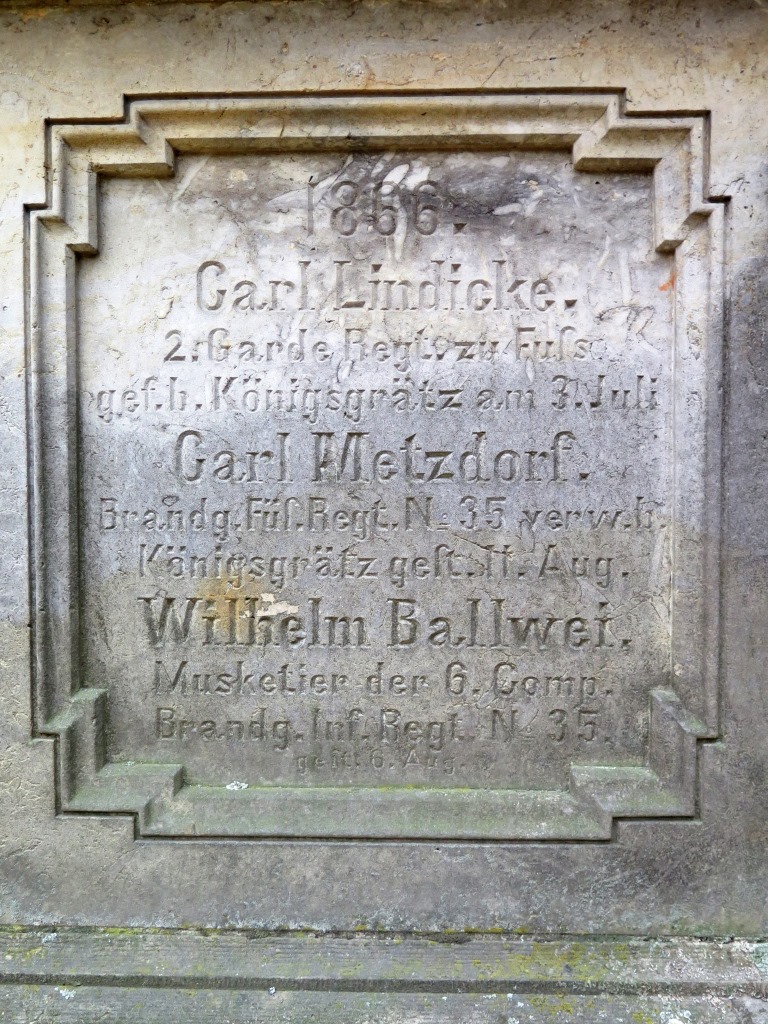 »1866. / Carl Lindicke. / 2.Garde Regt. zu Fuss / gef. b. Königsgrätz am 3. Juli / Carl Metzdorf. / Brandg. Füs. Regt. No. 35 verw. b. / Königsgrätz gest. 11. Aug. / Wilhelm Ballwei. / Musketier der 6.Comp. / Brandg. Inf. Regt. No. 35 / gest. 6. Aug.«