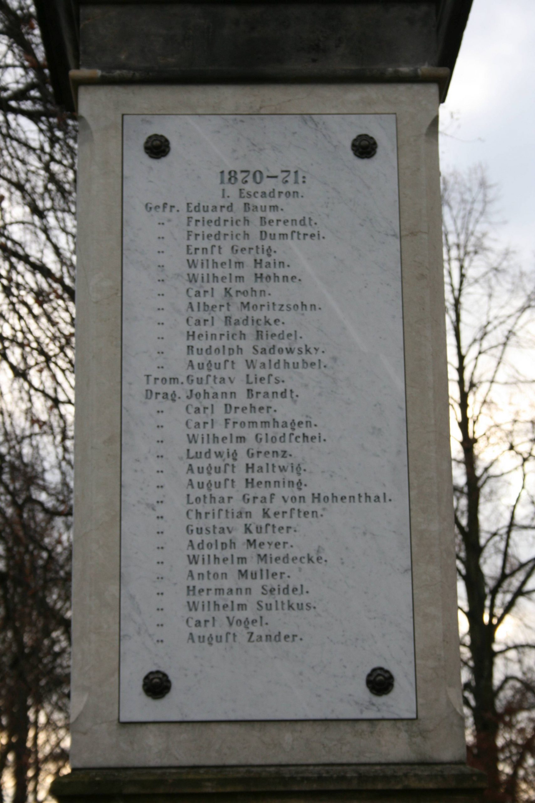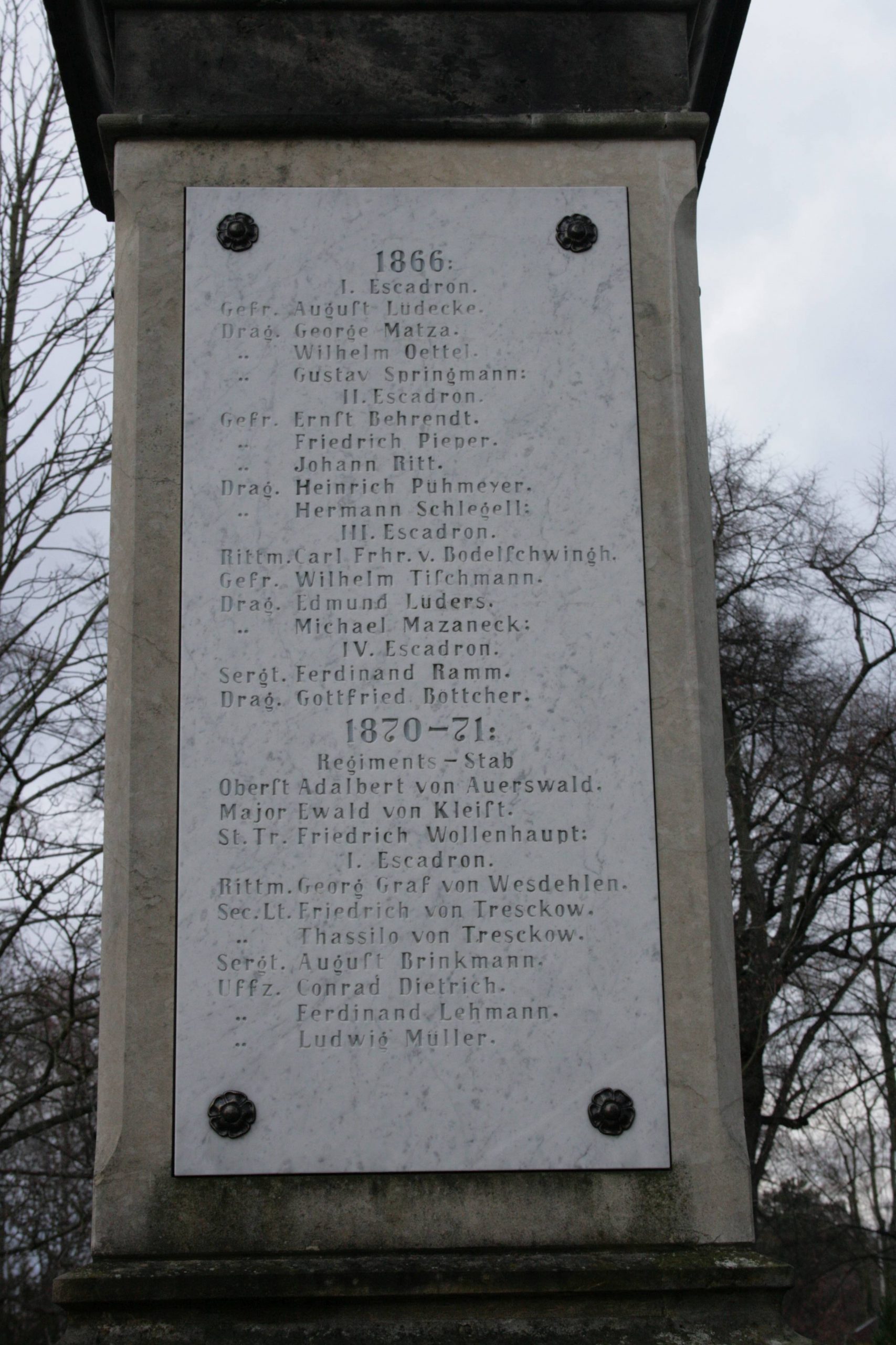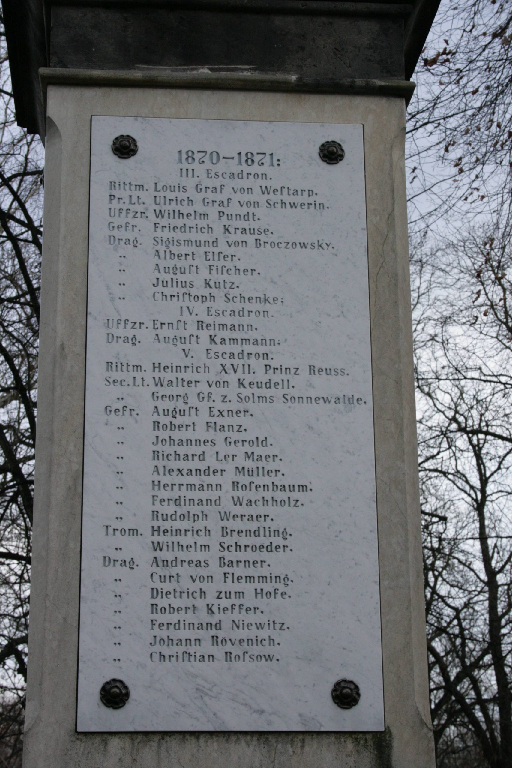 »DAS / I. GARDE DRAGONER RGT. / SEINEN / IN DEN FELDZÜGEN 1866 / UND 1870/71 GEBLIEBENEN / KAMERADEN.«