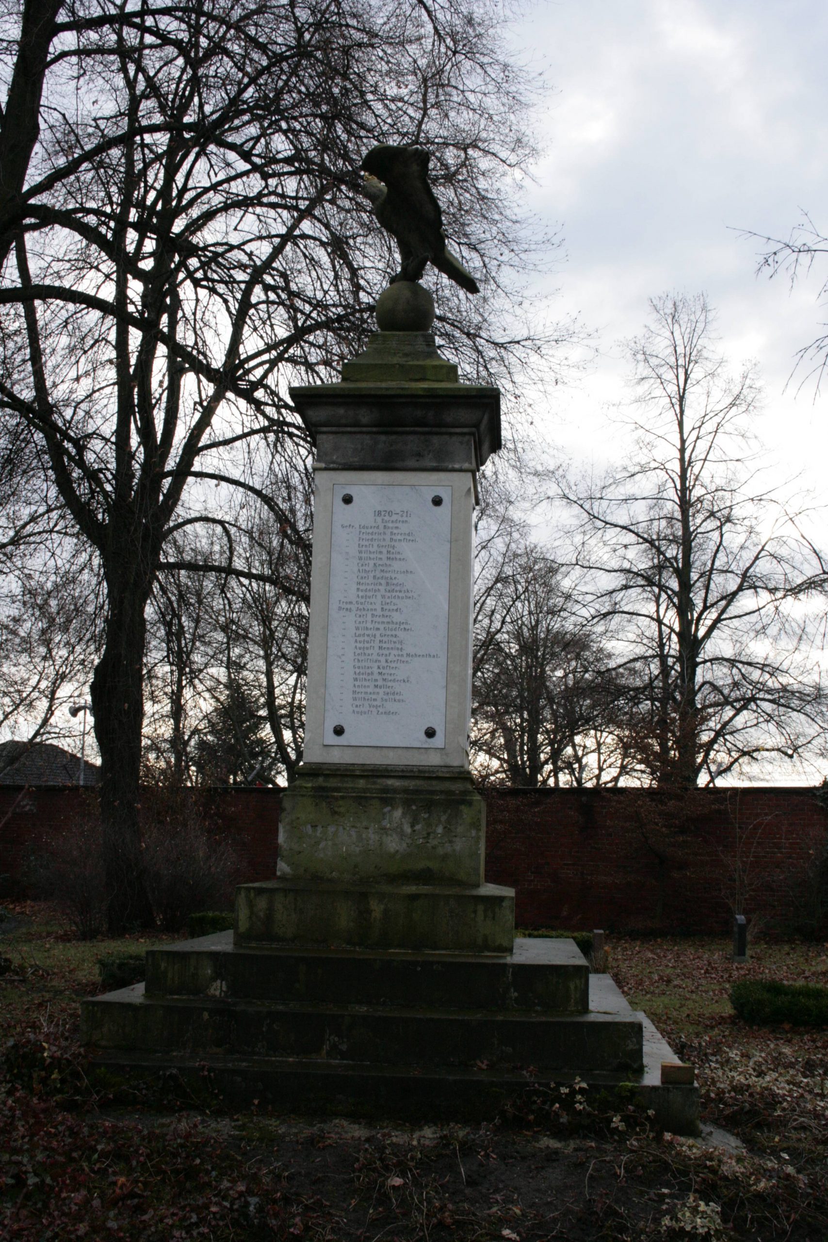 Das hohe Denkmal ist aus Sandstein gearbeitet und weist vier mit durch Zierrosetten kaschierten Dübeln befestigte marmorne Inschriftentafeln auf. Der bekrönende Adler ist angeblich aus Bronze gegossen. Es steht in einem quadratischen Pflanzbeet mit zum Monument hin ansteigender Erdaufschüttung. Auf quadratischem Grundriss erhebt sich der dreifach gestufte Unterbau. Darauf ruht der pfeilerhafte Hauptteil des Denkmals. Eine mehrfach profilierte Gesimszone schließt das Monument nach oben hin ab. Die vorkragende Deckplatte dient einer kugelförmig gesockelten Adlerfigur als Standfläche. Der preußische Adler trägt eine vergoldete Krone. Die vier Seiten des Monuments tragen im Schaftbereich des Pfeilers auf jeder Seite eine Marmortafel, befestigt mit Dübeln, die durch Rosettenzierköpfe kaschiert werden. Die Schrift ist graufarben hinterlegt. Ein Relief zeigt das Eiserne Kreuz mit Krone und Band, ein weiteres stellt Eichen- und Lorbeerzweige dar. Links und rechts an den Seiten stehen die Namen und Daten der Gefallenen (Jörg Kuhn, Susanne Kähler).