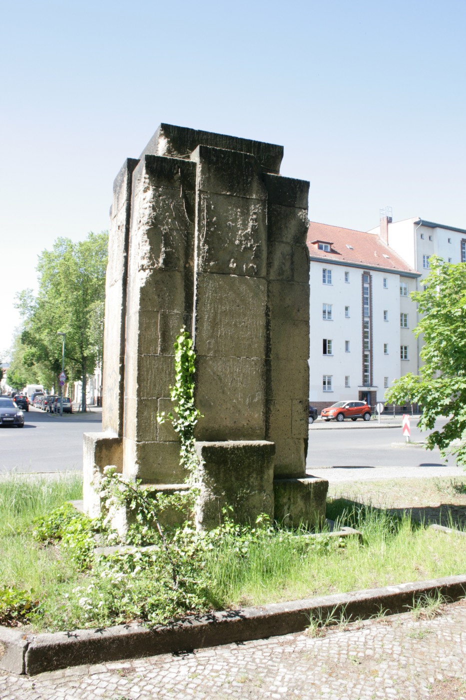 Rechteckige Einfassung mit Steinschwellen, innen Bepflanzung (Gitter verloren). Blockhaftes Denkmal, ehemals auf allen vier Seiten mit Hochrelieffiguren geschmückt.