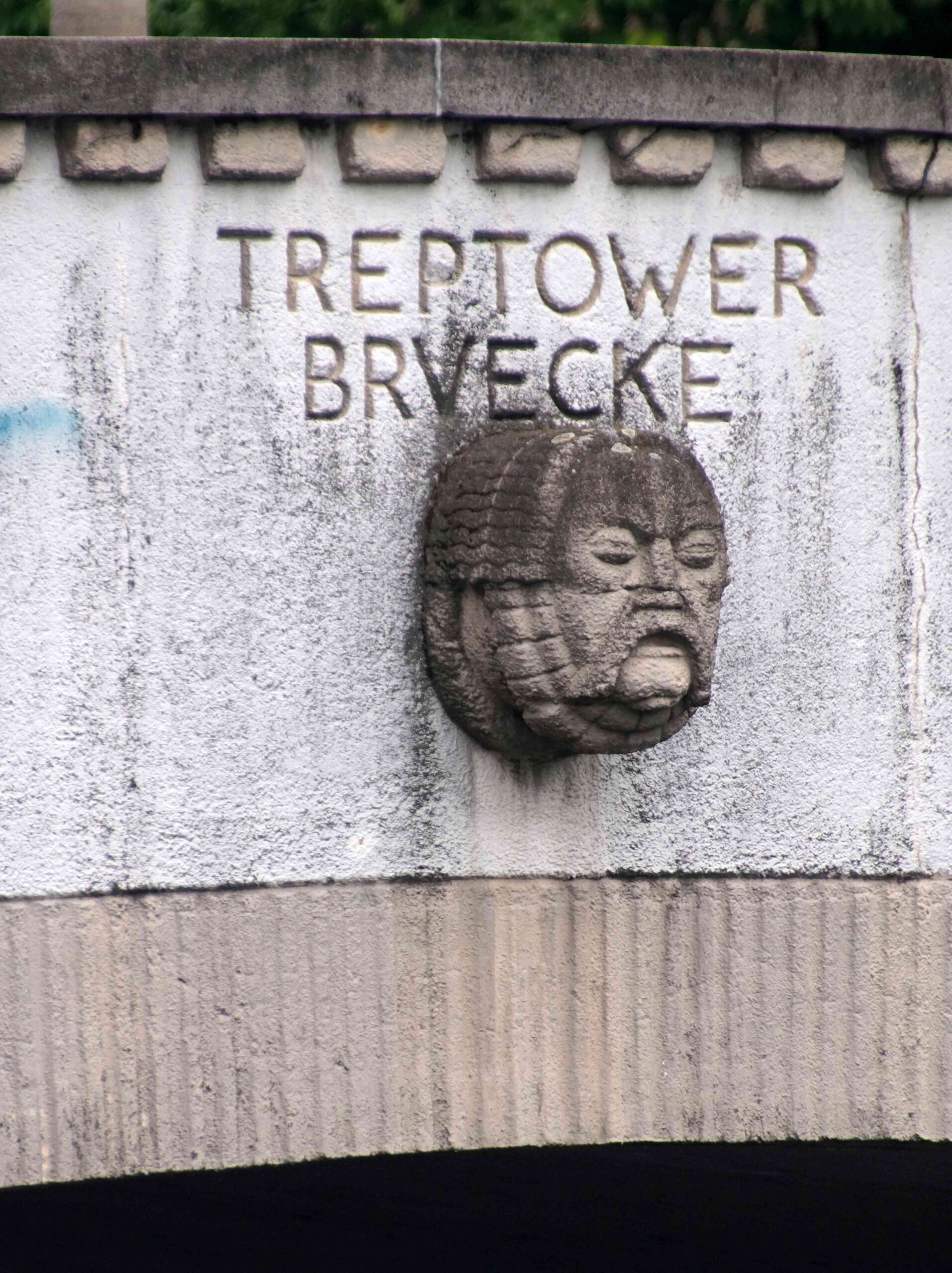 In den wasserseitigen Scheitelpunkten der Bögen der Treptower Brücke befindet sich je eine Maske eines bärtigen Kriegers (Nicola Vösgen).