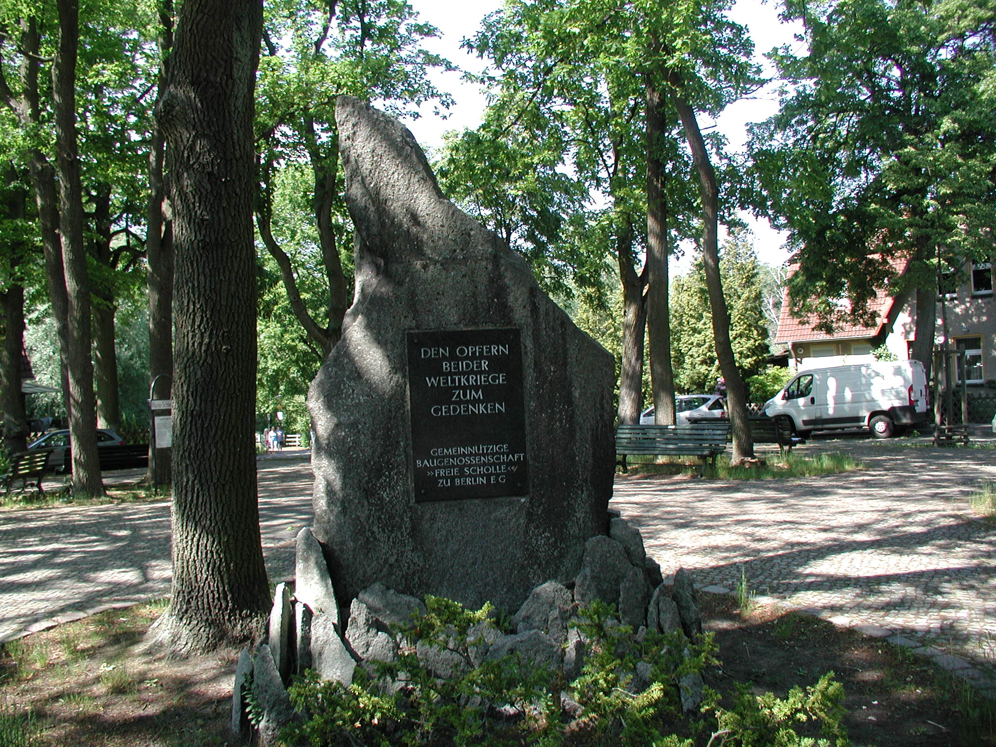 »DEN OPFERN / BEIDER / WELTKRIEGE / ZUM / GEDENKEN / GEMEINNÜTZIGE / BAUGENOSSENSCHAFT / "FREIE SCHOLLE" / ZU BERLIN E. G.«