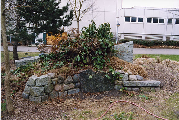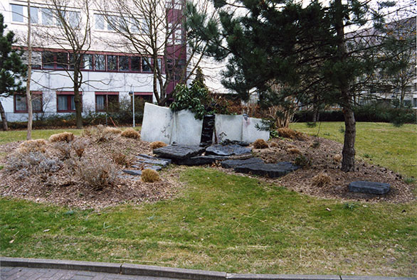 „Ein wie ein Felsengebirge wirkender ‚Materialkörper’, der den Kontrast zwischen naturhaft belassenen und von Menschenhand bearbeiteten Teilen sinnfällig macht: Rohe Teile aus dunklem norwegischen Granit („Prinzip Eisberg“) sind mit geschliffenen Teilen aus russischem grünen Granit verbunden. Auf der glattpolierten Frontfläche sind collageartig Zeichen aus Messing (z. B. Schriften, Stadtgrundrisse) appliziert (oder vertieft eingelassen, der Verf.), Sinnbild für den menschlichen Eingriff, die ‚zweite Natur’. Ein leicht plätscherndes Rinnsal und Gräser-Wildwuchs verstärken den Landschaftscharakter des Environments“ (Endlich, 1990, S. 147) (Susanne Kähler).