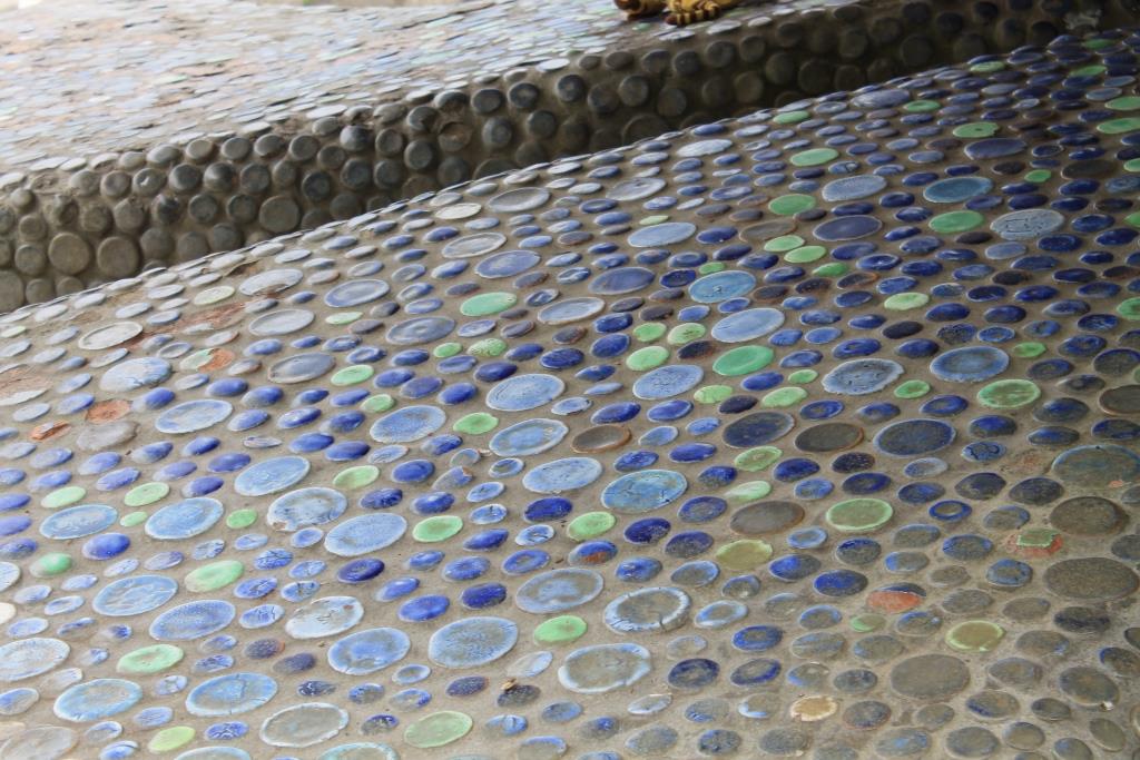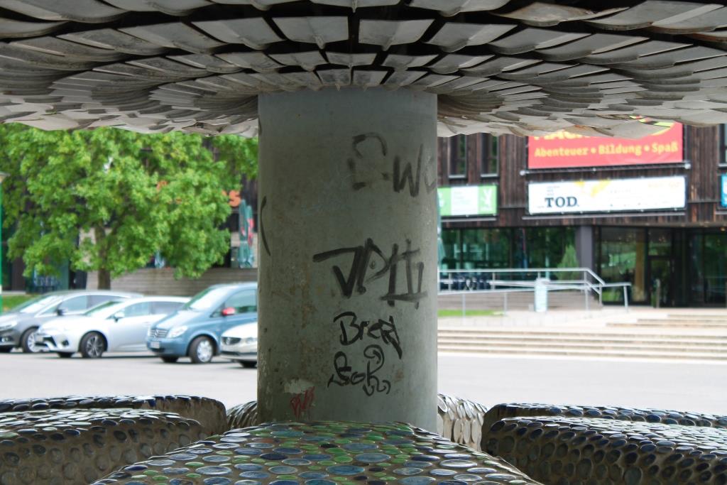 Innerhalb des Brunnenbeckens erhebt sich zentral eine sechseckige Plattform. Diese Plattform ist so ausgerichtet, dass jeweils eine Ecke der Plattform in die Mitte eines außen umliegenden Sechsecks weist. Auf der erhöhten Plattform befinden sich sechs dreiseitige Prismen mit abgerundeten Ecken und Kanten, die auf die Mitte ausgerichtet sind und von außen nach innen an Steigung gewinnen. Zentrales Motiv ist die „Brunnenblume“, die auf einem Zylinder und einem Edelstahlgerüst montiert ist. Sie besteht aus einer Schale, in der aus mehreren Fontänen Wasser aufgefangen wird und einer Kugel, die auf der Spitze des schmalen Zylinders ruht. Schale und Kugel sind gänzlich mit Edelstahlplatten „schuppenartig“ besetzt (Lina Pritzkow).